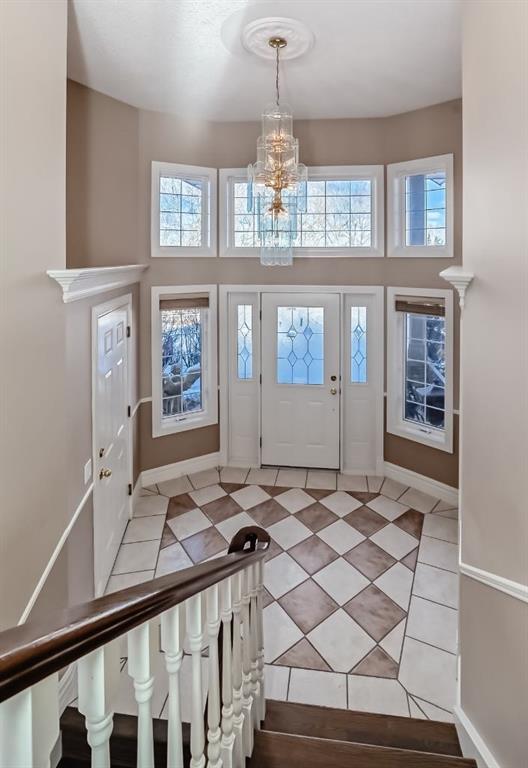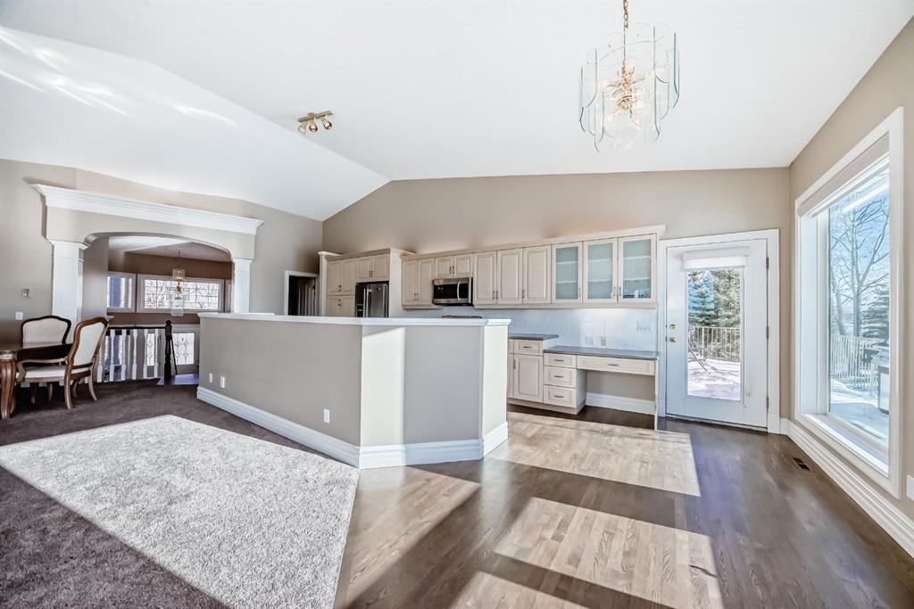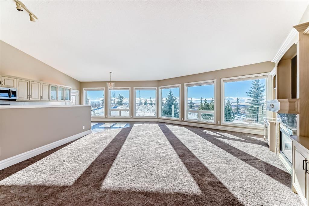 Step into the bright & welcoming foyer, highlighted by soaring vaulted ceilings and expansive windows that flood the space with natural light. Upstairs, the open-concept living, dining, & kitchen area impresses with stunning 12-foot vaulted ceilings & custom built-ins framing the cozy gas fireplace. Large windows showcase breathtaking views of mature trees, the distant Rocky Mountains, & create a warm, inviting atmosphere throughout.