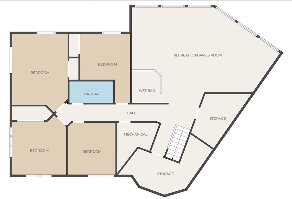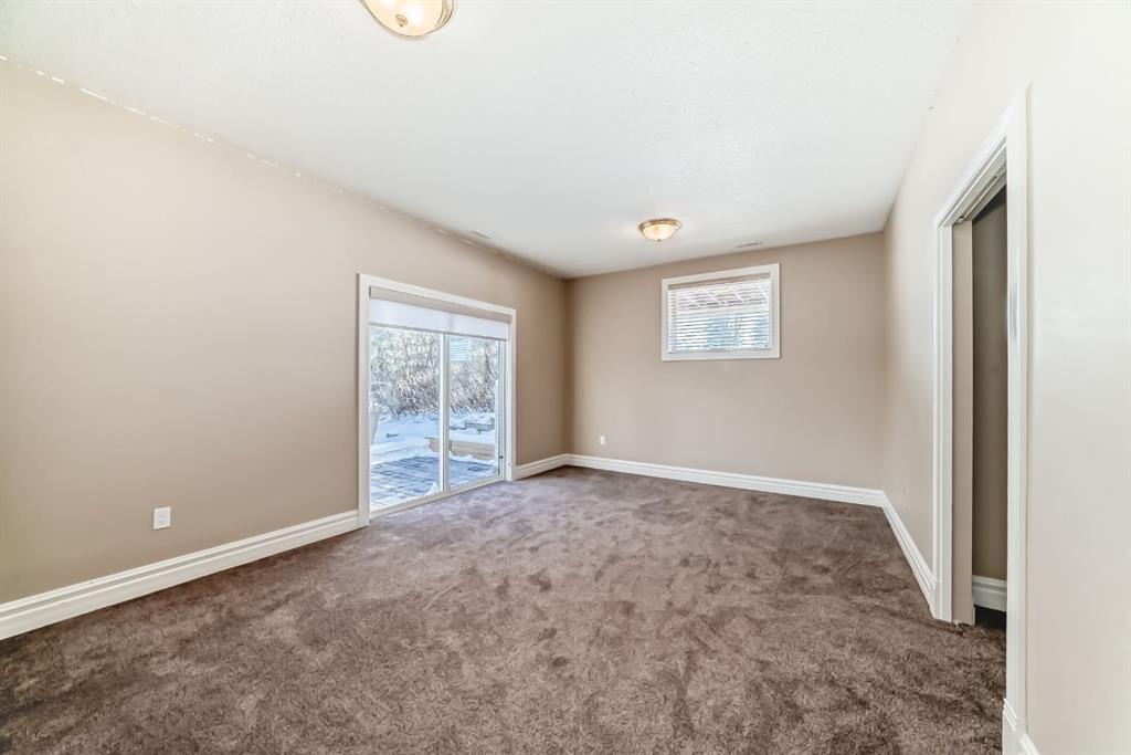 The basement boasts 9-foot ceilings, 4 additional bedrooms, and a full bathroom—ideal for larger families or multi-generational living. The expansive recreation room includes oversized windows, a wet bar, & a 2nd fireplace with custom built-ins. The walkout sliding door accesses a beautiful large concrete patio to sit among the trees. There’s also a generous storage room & an under-the-stairs playroom—perfect for kids or additional storage.