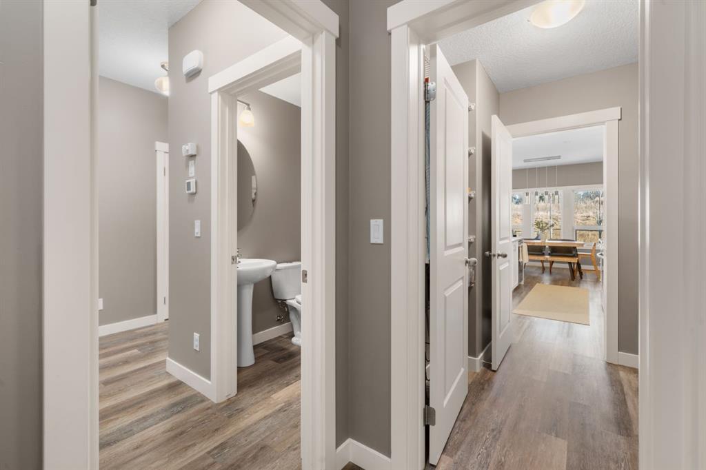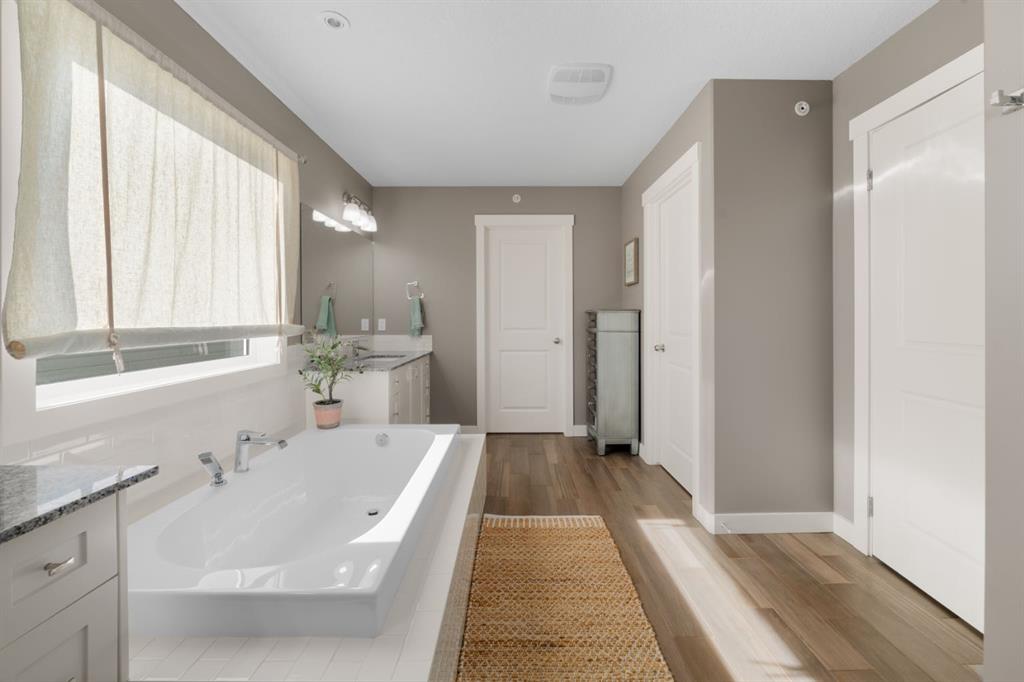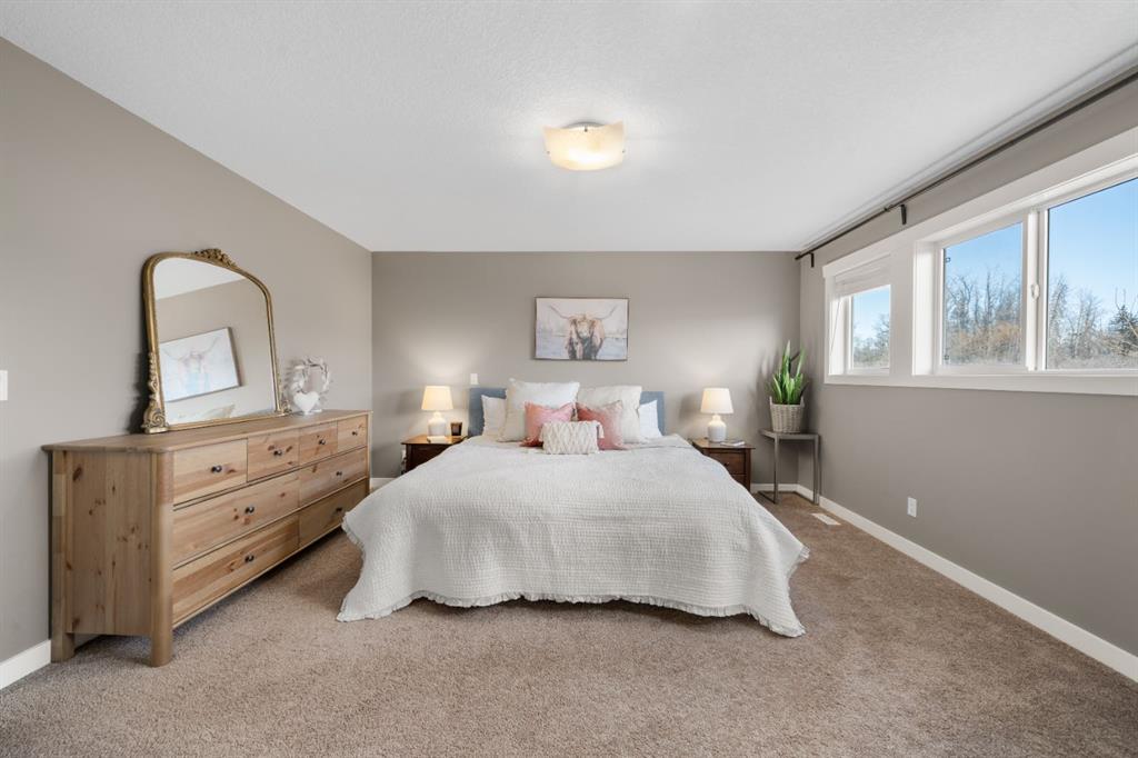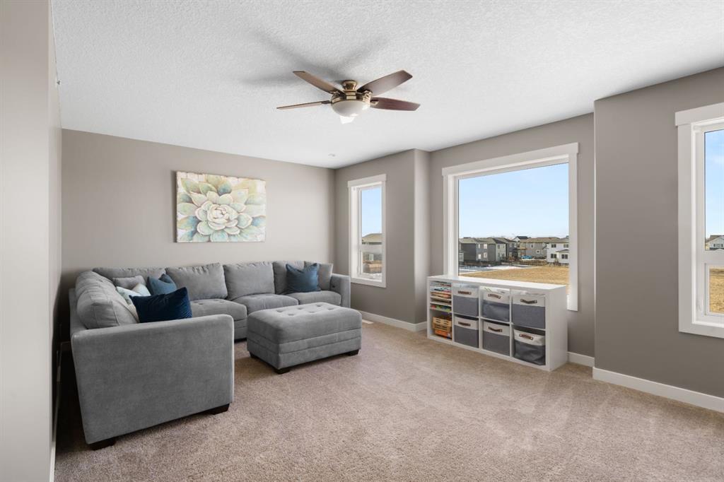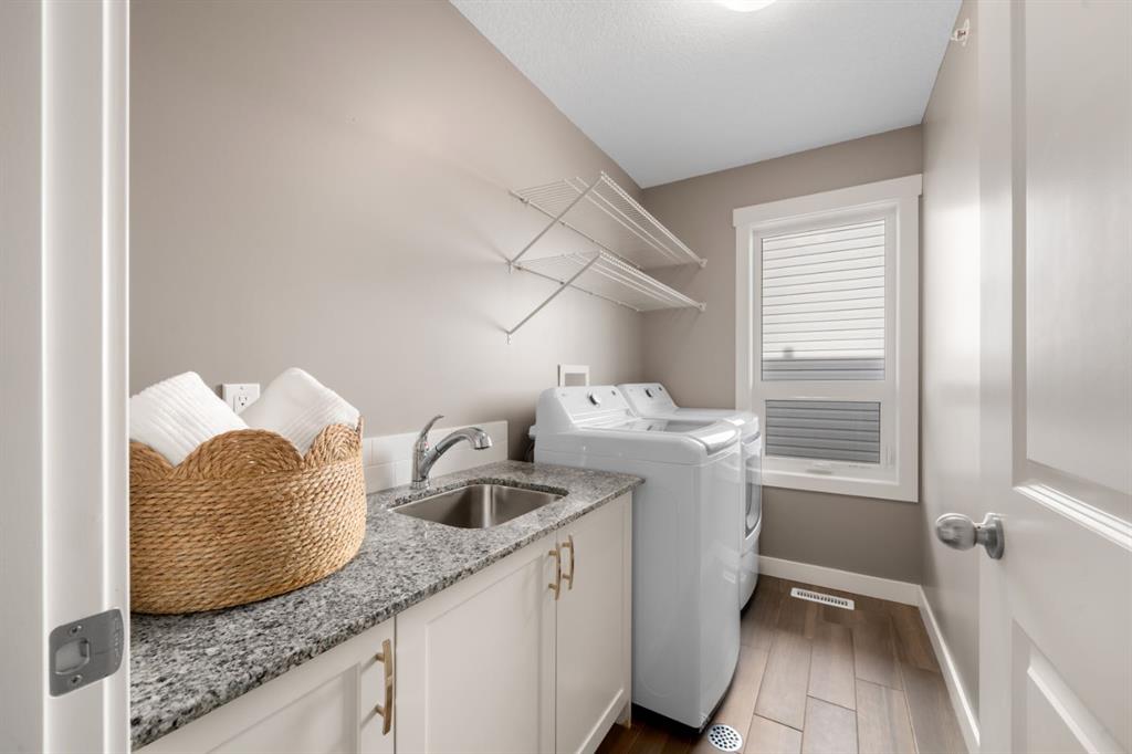 Upstairs, you’ll find three generous bedrooms including a spacious primary retreat complete with a walk-in closet and a luxurious 5-piece ensuite. The large WEST facing bonus room is a dream space for growing families — perfect for movie nights, a kids’ play zone, or a relaxing lounge plus enjoy incredible sunsets and on a clear day beautiful mountain views. An upper-level laundry room with sink adds everyday convenience right where you need it most.