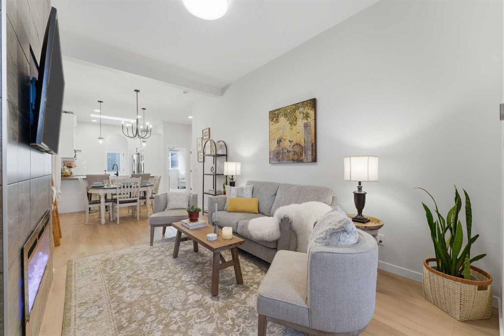 The living area is anchored by a striking electric fireplace, offering both visual charm and effortless warmth. It’s the perfect focal point—ideal for cozy winter evenings or simply adding a touch of elegance to the room year-round.