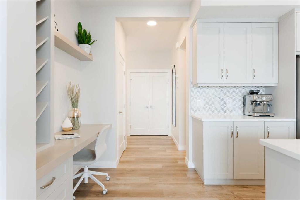 Inside, the home is clean, bright, and timeless with a light, neutral palette and expansive windows that bring the landscape in. The open-concept main floor features 9’ ceilings, luxury vinyl plank flooring, and a gas fireplace. The kitchen is anchored by a large island with seating, quartz countertops, full-height tile backsplash, and built-in wall oven and microwave — designed for both everyday living and entertaining.