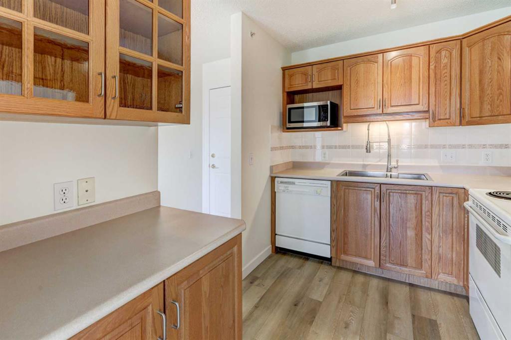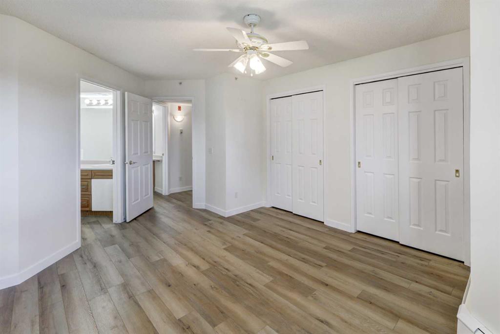 An adult-living condo which offers a vibrant, maintenance free lifestyle. Welcome to this bright, open-concept floor plan in a desirable, quiet location overlooking a park. Filled with natural light and sunshine from the west. The spacious layout includes a large primary bedroom complete with own 2 pc ensuite, along with additional 4 pc bathroom, large laundry room, functional kitchen, large dining and living room with access to a nice size SW facing balcony with gas line for bbq. Additional highlights include new vinyl flooring, baseboards, and fresh paint throughout, secured underground titled parking stall and assigned storage room. This community is truly lifestyle-focused with clubhouse, a billiards room, shuffleboard, recreation room with fully equipped kitchen, perfect for group dining and events, woodworking shop, library and more. Guests coming to town? There are 3 guest suites available, walking paths, a pond with water fountain and beautiful landscaping. whether you are social or love quiet time surrounded by nature, there is something for everyone. A home with all the amenities and close to shopping and dining. A wonderful place to call home!!!