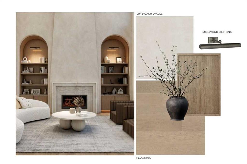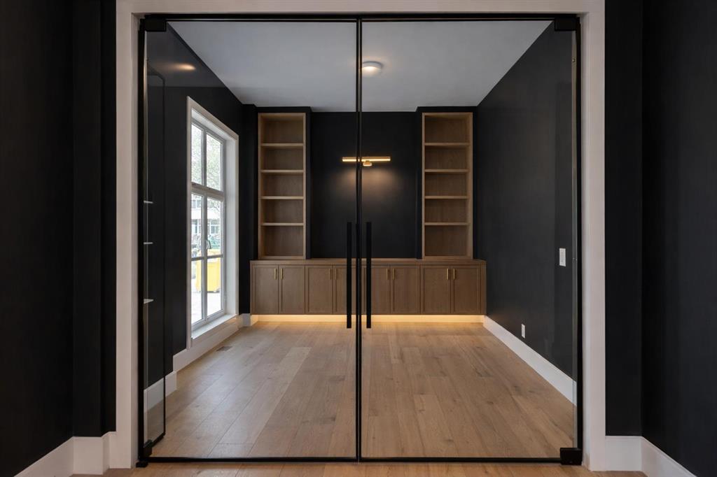 Upon entry, a bright front office with glass-paneled doors provides the perfect work-from-home space. The main floor unfolds into the heart of the home — a chef-inspired kitchen featuring custom cabinetry, dual paneled fridge/freezer units, a premium gas range, paneled dishwasher, a large waterfall island, and a fully outfitted custom walk-through butlers pantry. The adjoining living room invites gatherings around the striking gas fireplace while oversized windows overlook the landscaped yard and oversized deck