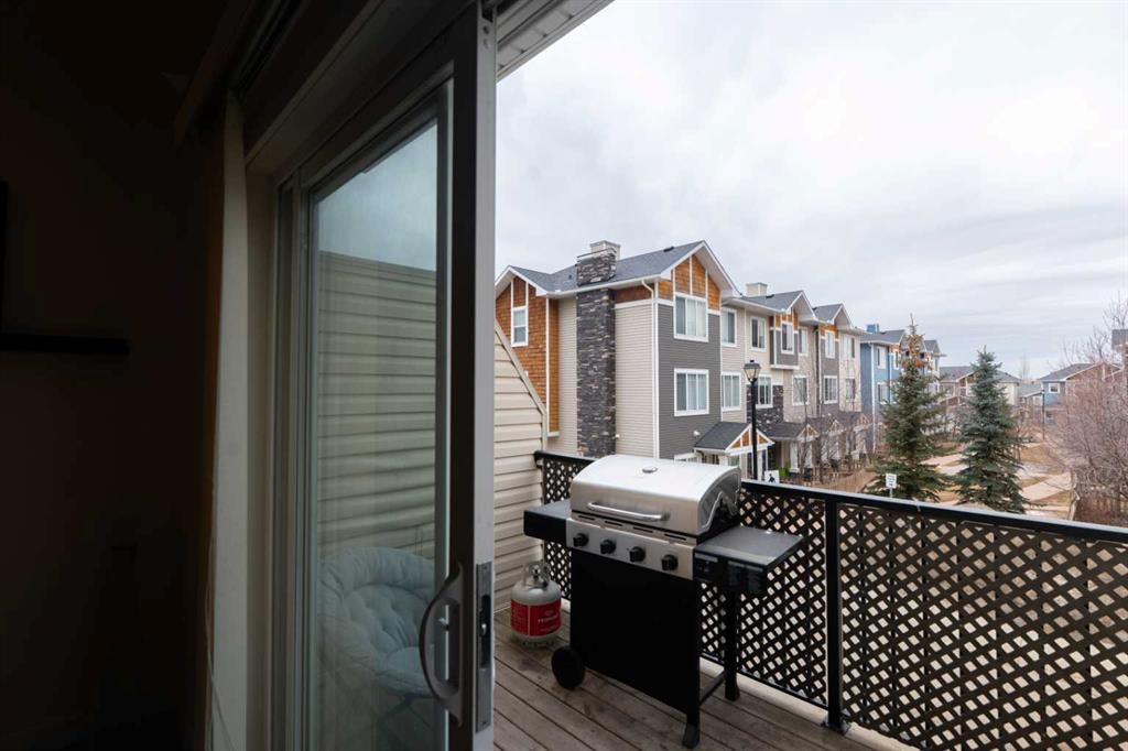 The kitchen is both elegant and functional, featuring rich dark wood cabinetry that contrasts beautifully with crisp white quartz countertops and a central island. Stainless steel appliances complete the modern look, while sliding patio doors open onto a spacious balcony — perfect for morning coffee, evening BBQs, or gathering with family and friends.