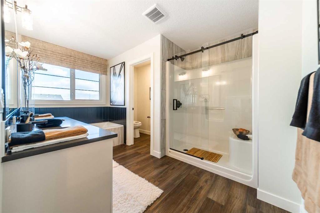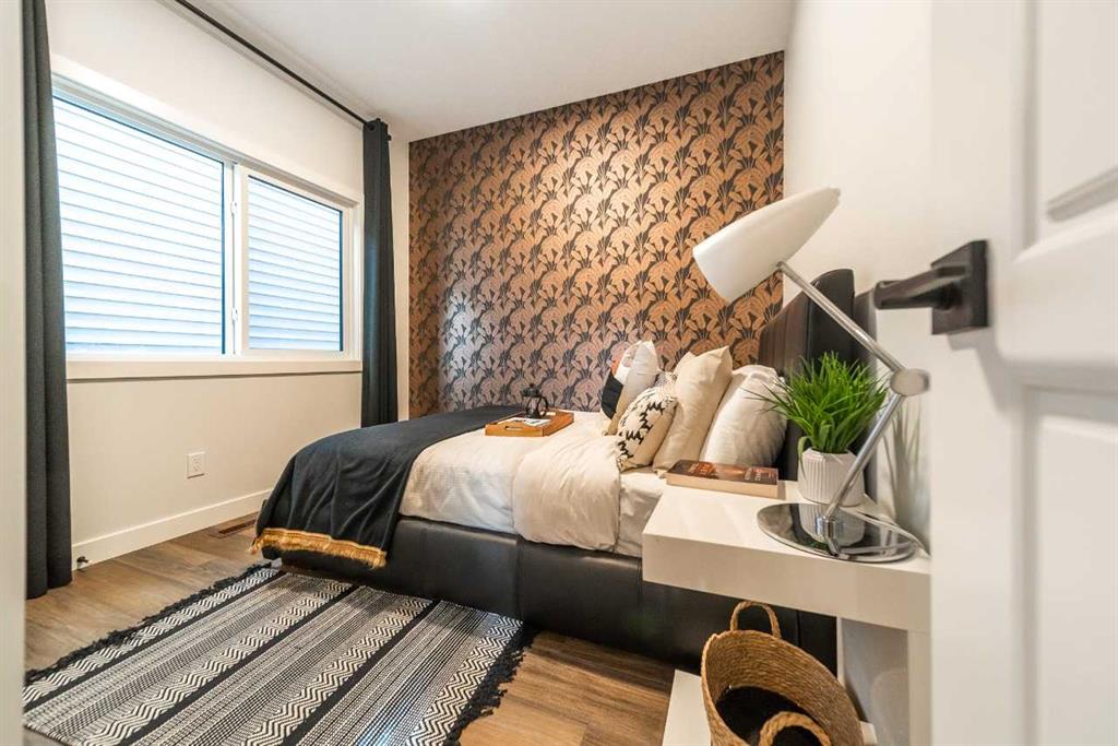 This home features an executive kitchen with built-in stainless steel appliances, gas cooktop, chimney hood fan, waterfall island and a walk-in pantry. The main floor offers a spacious flex room, and the basement has 9' ceilings with a private side entrance. Upstairs, enjoy a vaulted bonus room, upper floor laundry, and a luxurious 5-piece ensuite with soaker tub, dual sinks, quartz counters, and a walk-in shower with tiled walls. Thoughful touches include extra windows and paint-grade railings with iron spindles. Backing onto a peaceful pond, the rear deck with gas line rough-in is perfect for relaxing or entertaining outdoors. Photos are representative.