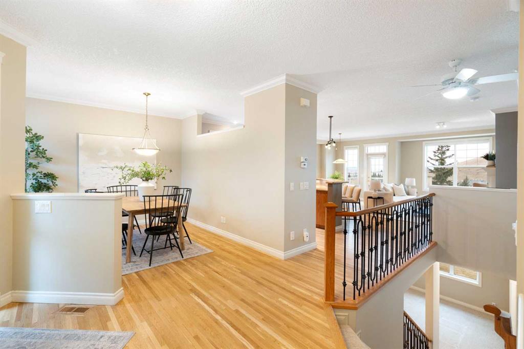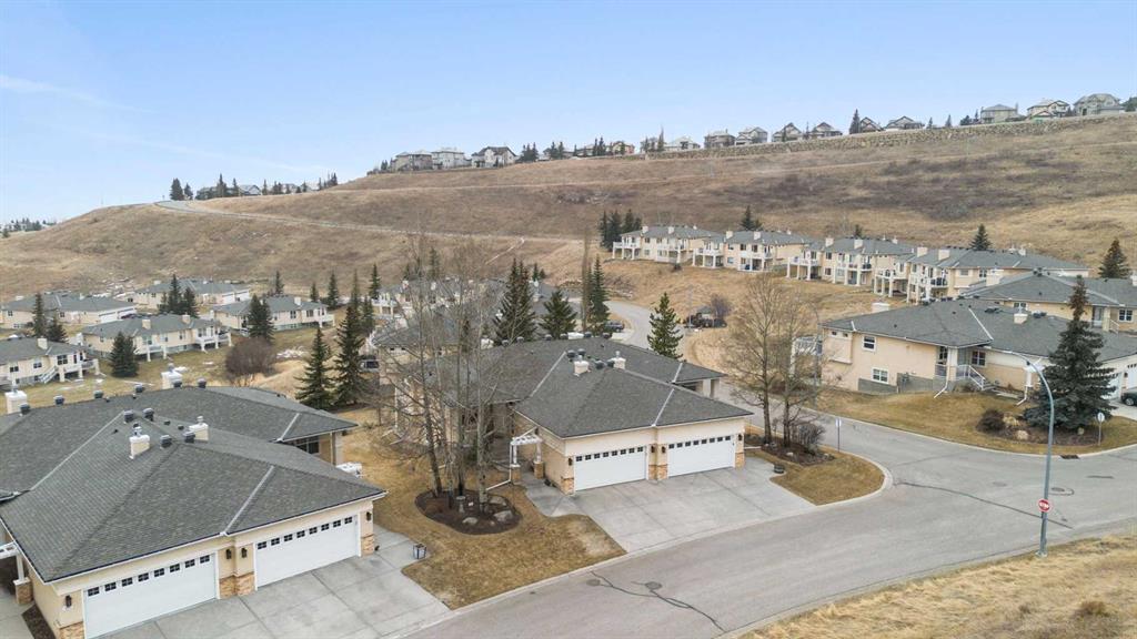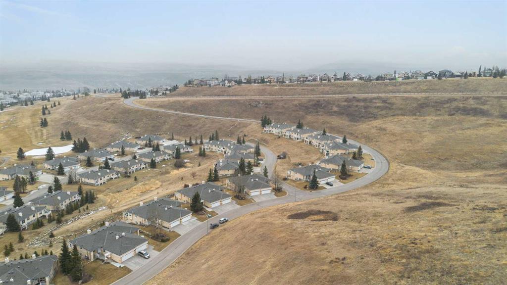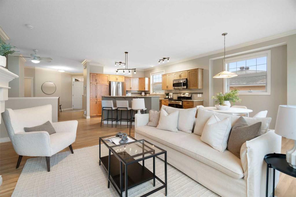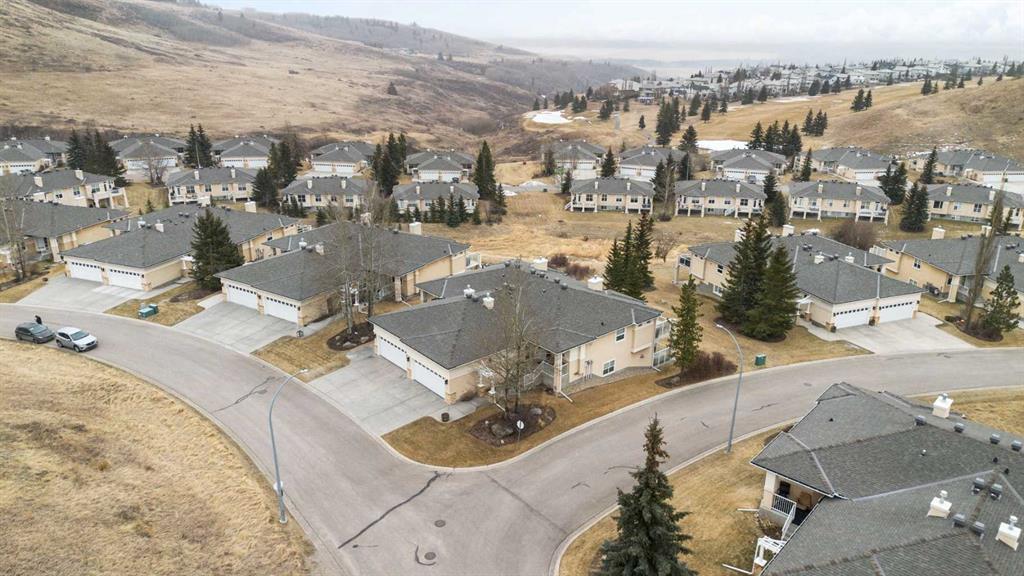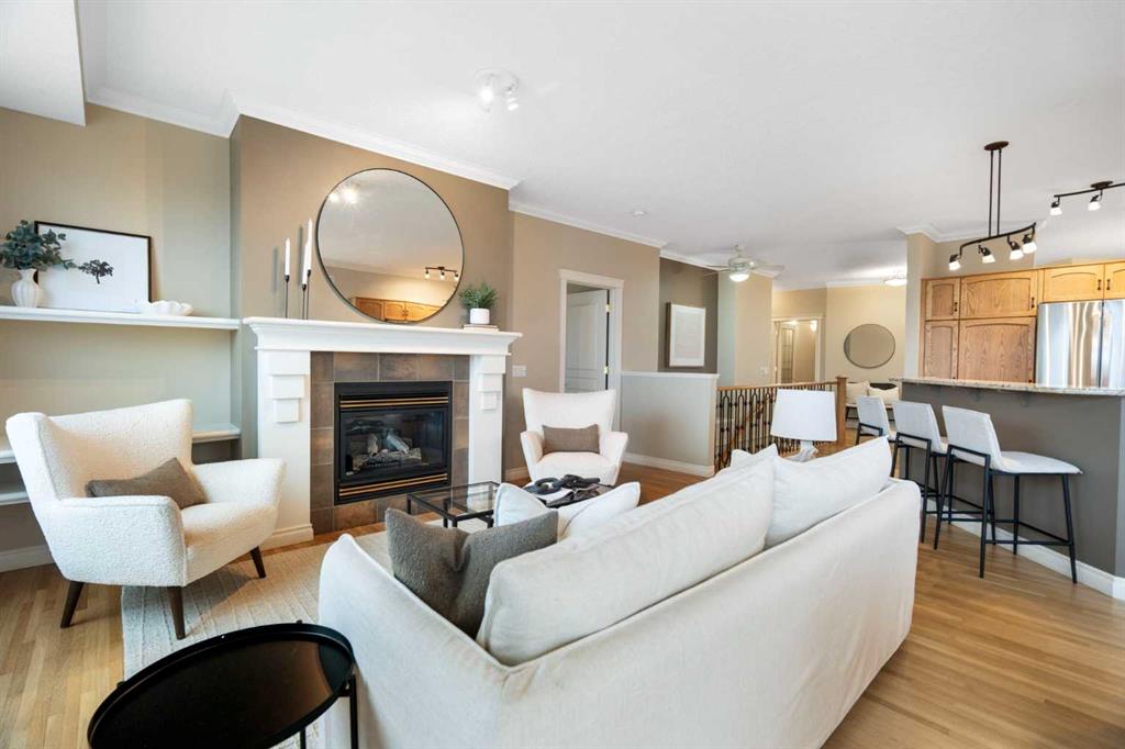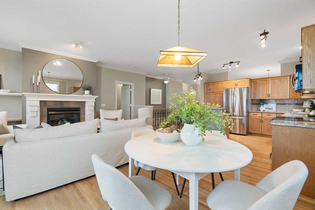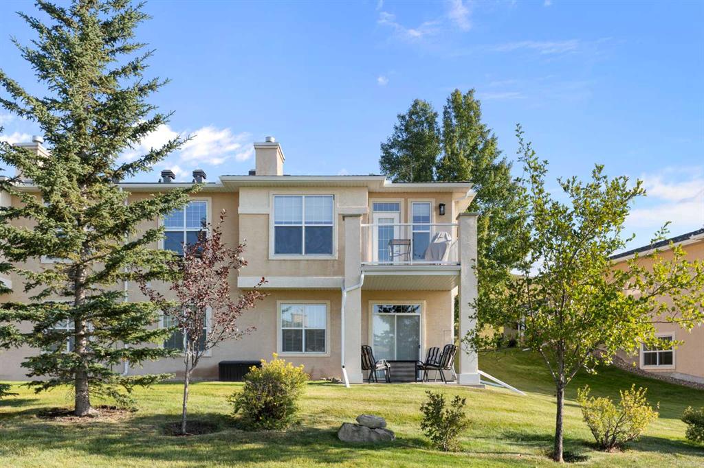 Hello, Gorgeous! Located in the desirable community of GlenEagles in Cochrane, this well-maintained walkout bungalow offers 1,408 sq. ft. above grade plus a fully developed lower level. The main floor features a bright living room with fireplace and valley views, a kitchen with granite countertops and raised island, a breakfast nook with access to the south-facing deck, and a formal dining area. A dedicated main-floor office/den provides flexibility for working from home. The primary bedroom includes a walk-in closet and 5-piece ensuite with in-floor heating and updated glass shower. Main-floor laundry and a powder room add convenience. The fully developed walkout basement offers two additional bedrooms, a 3-piece bathroom, a spacious recreation room with second fireplace, and access to the lower patio. Additional features include refinished hardwood floors, updated appliances, newer roof and hot water tank, upgraded attic insulation, central vacuum, and no Poly B plumbing. The double attached garage is insulated and drywalled with hot and cold water taps. Condo fees include landscaping, snow removal, exterior maintenance, and building insurance. Close to Highway 1A, pathways, and golf, this home offers comfortable living in a scenic setting.
