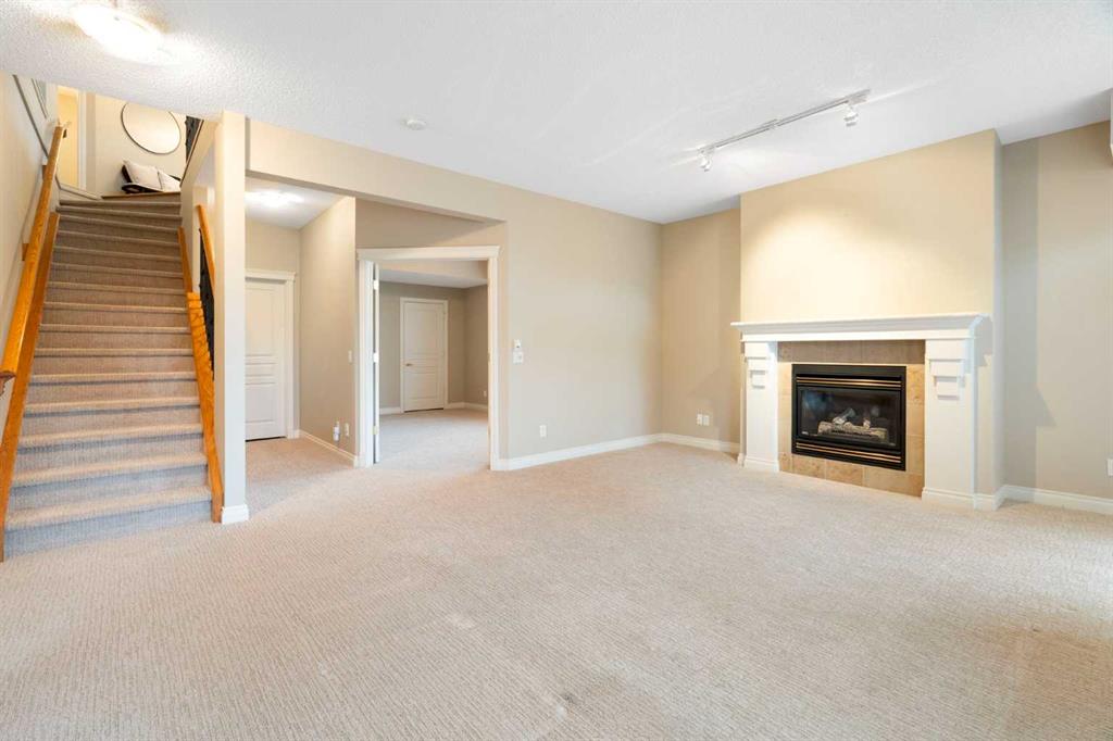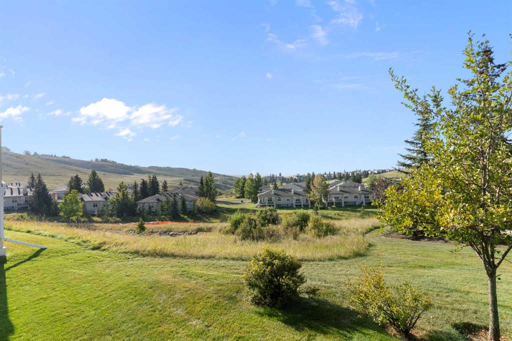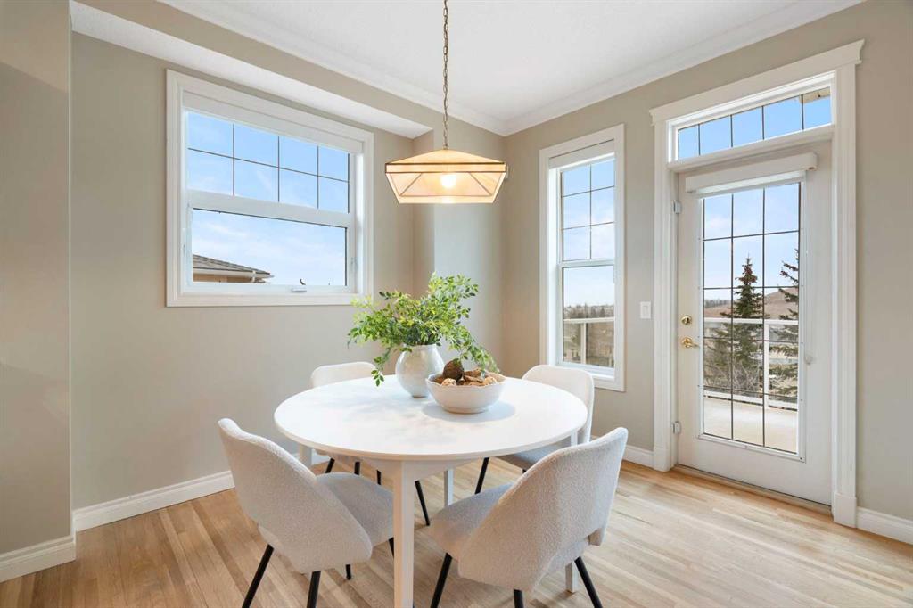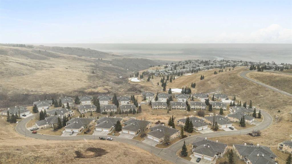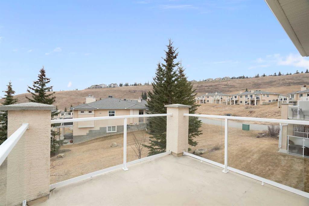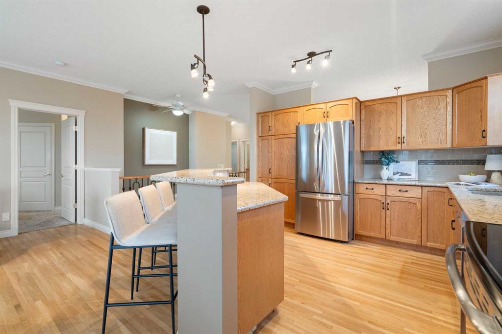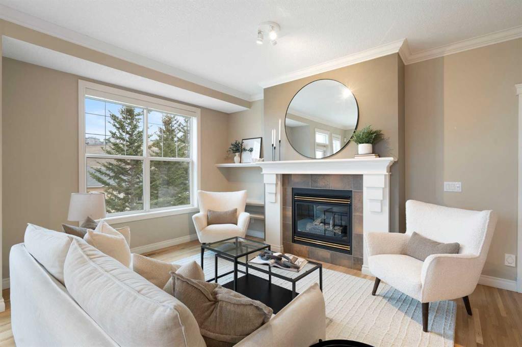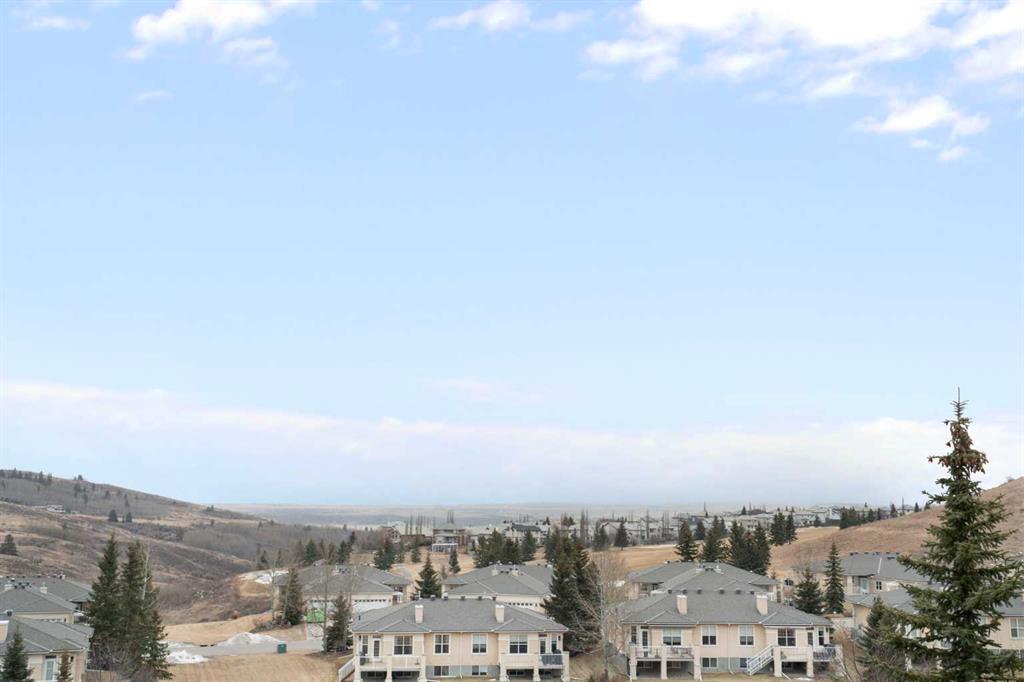 Hello, Gorgeous! Located in the desirable community of GlenEagles in Cochrane, this well-maintained walkout bungalow offers 1,408 sq. ft. above grade plus a fully developed lower level. The main floor features a bright living room with fireplace and valley views, a kitchen with granite countertops and raised island, a breakfast nook with access to the south-facing deck, and a formal dining area. A dedicated main-floor office/den provides flexibility for working from home. The primary bedroom includes a walk-in closet and 5-piece ensuite with in-floor heating and updated glass shower. Main-floor laundry and a powder room add convenience. The fully developed walkout basement offers two additional bedrooms, a 3-piece bathroom, a spacious recreation room with second fireplace, and access to the lower patio. Additional features include refinished hardwood floors, updated appliances, newer roof and hot water tank, upgraded attic insulation, central vacuum, and no Poly B plumbing. The double attached garage is insulated and drywalled with hot and cold water taps. Condo fees include landscaping, snow removal, exterior maintenance, and building insurance. Close to Highway 1A, pathways, and golf, this home offers comfortable living in a scenic setting.