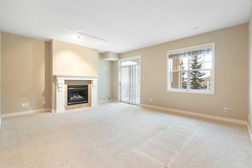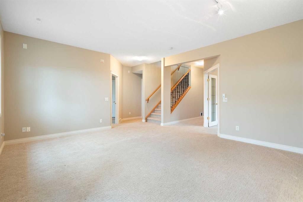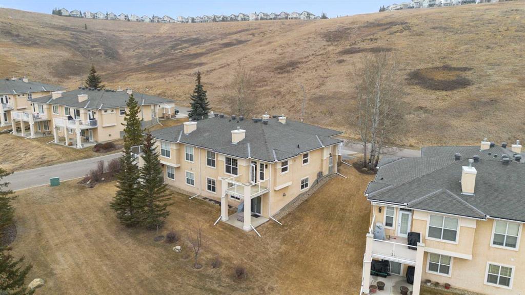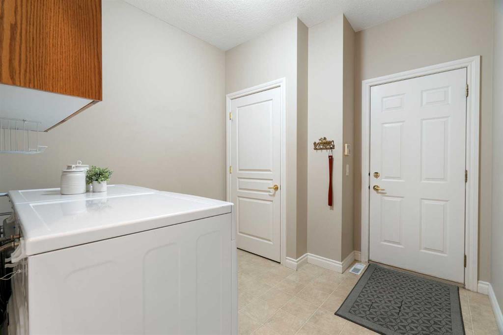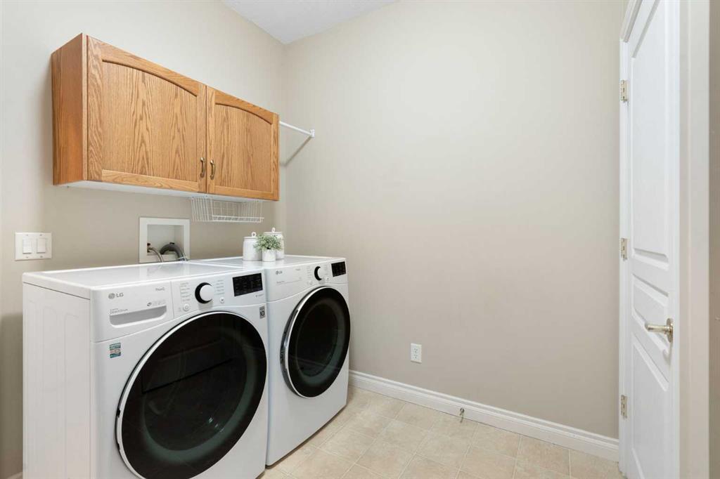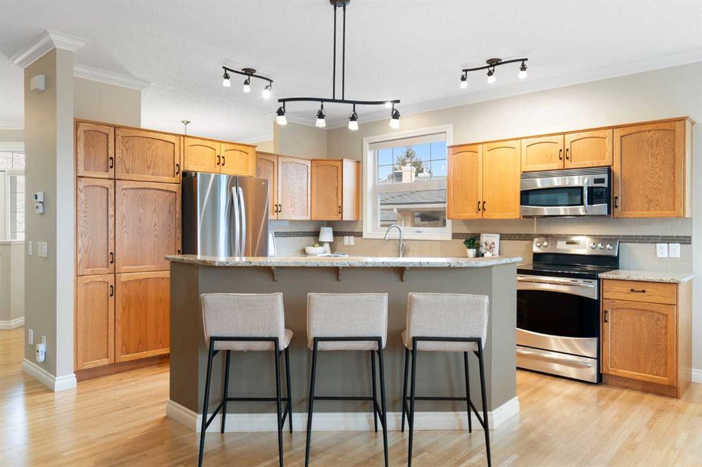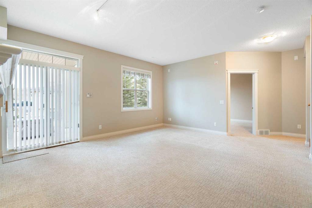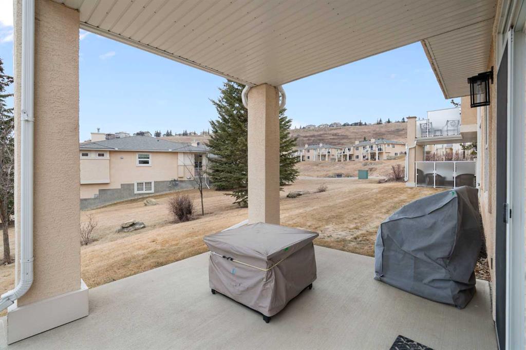 Hello, Gorgeous! Located in the desirable community of GlenEagles in Cochrane, this well-maintained walkout bungalow offers 1,408 sq. ft. above grade plus a fully developed lower level. The main floor features a bright living room with fireplace and valley views, a kitchen with granite countertops and raised island, a breakfast nook with access to the south-facing deck, and a formal dining area. A dedicated main-floor office/den provides flexibility for working from home. The primary bedroom includes a walk-in closet and 5-piece ensuite with in-floor heating and updated glass shower. Main-floor laundry and a powder room add convenience. The fully developed walkout basement offers two additional bedrooms, a 3-piece bathroom, a spacious recreation room with second fireplace, and access to the lower patio. Additional features include refinished hardwood floors, updated appliances, newer roof and hot water tank, upgraded attic insulation, central vacuum, and no Poly B plumbing. The double attached garage is insulated and drywalled with hot and cold water taps. Condo fees include landscaping, snow removal, exterior maintenance, and building insurance. Close to Highway 1A, pathways, and golf, this home offers comfortable living in a scenic setting.