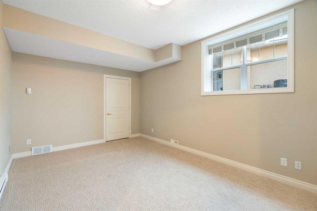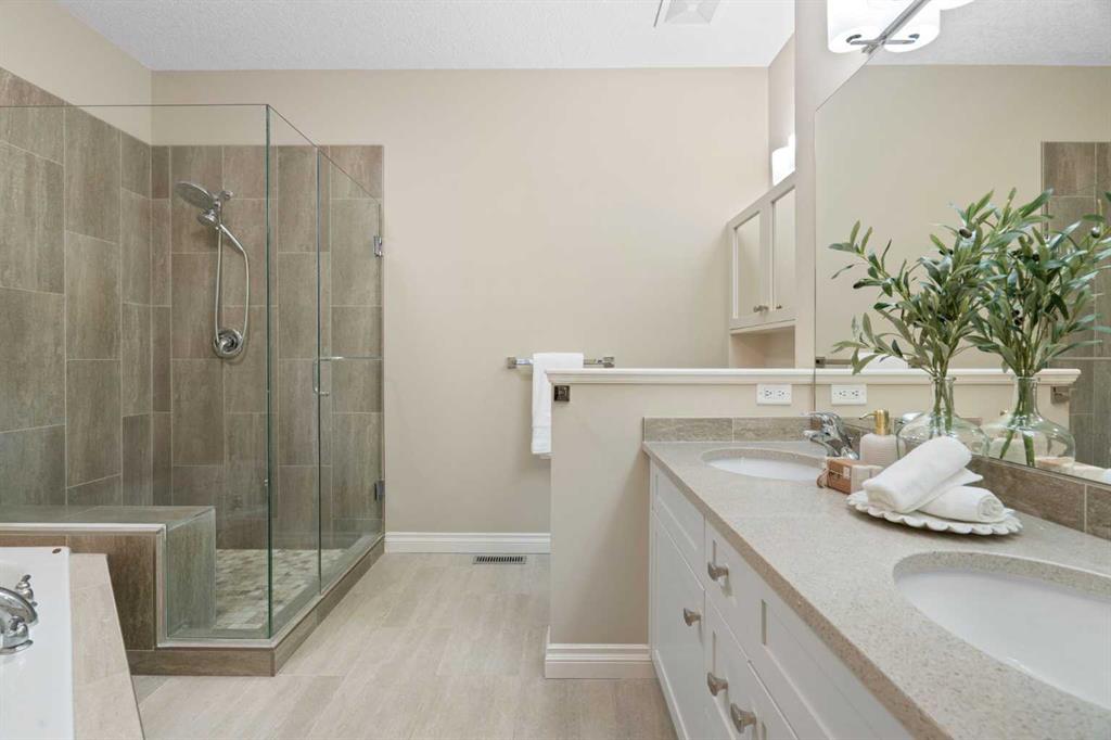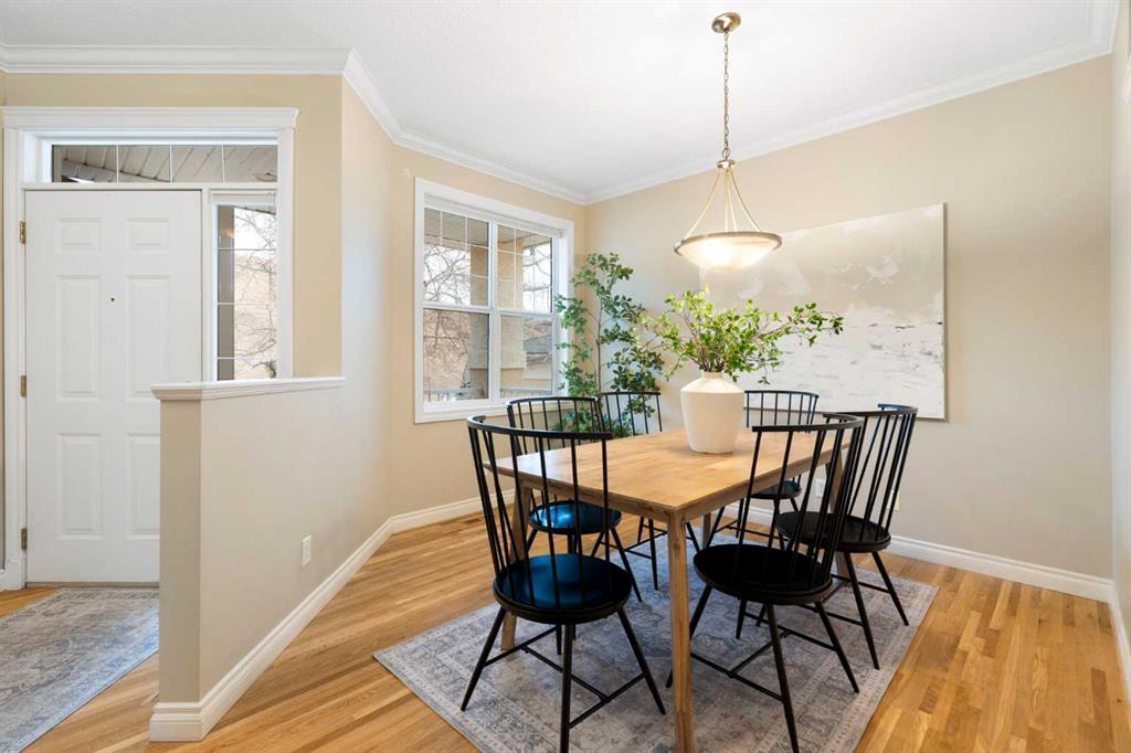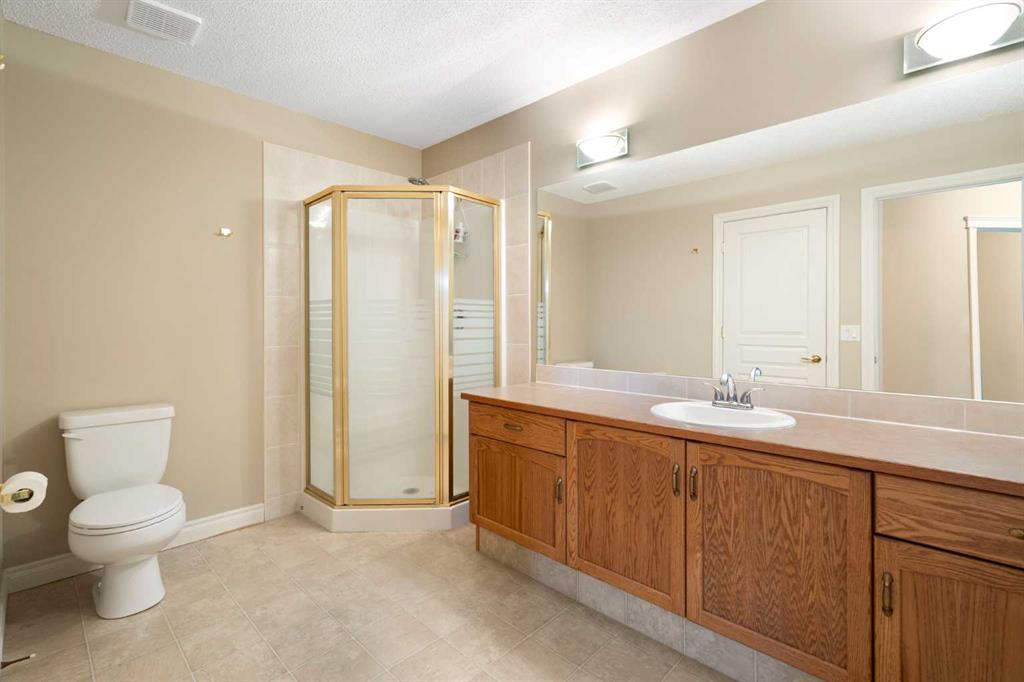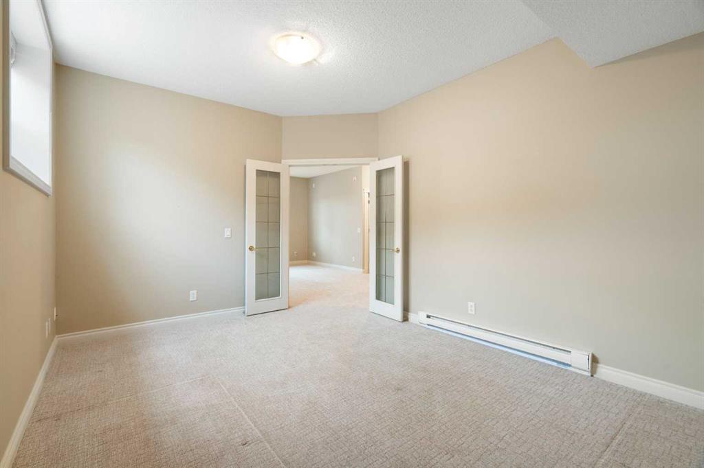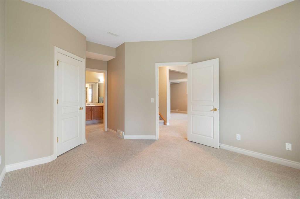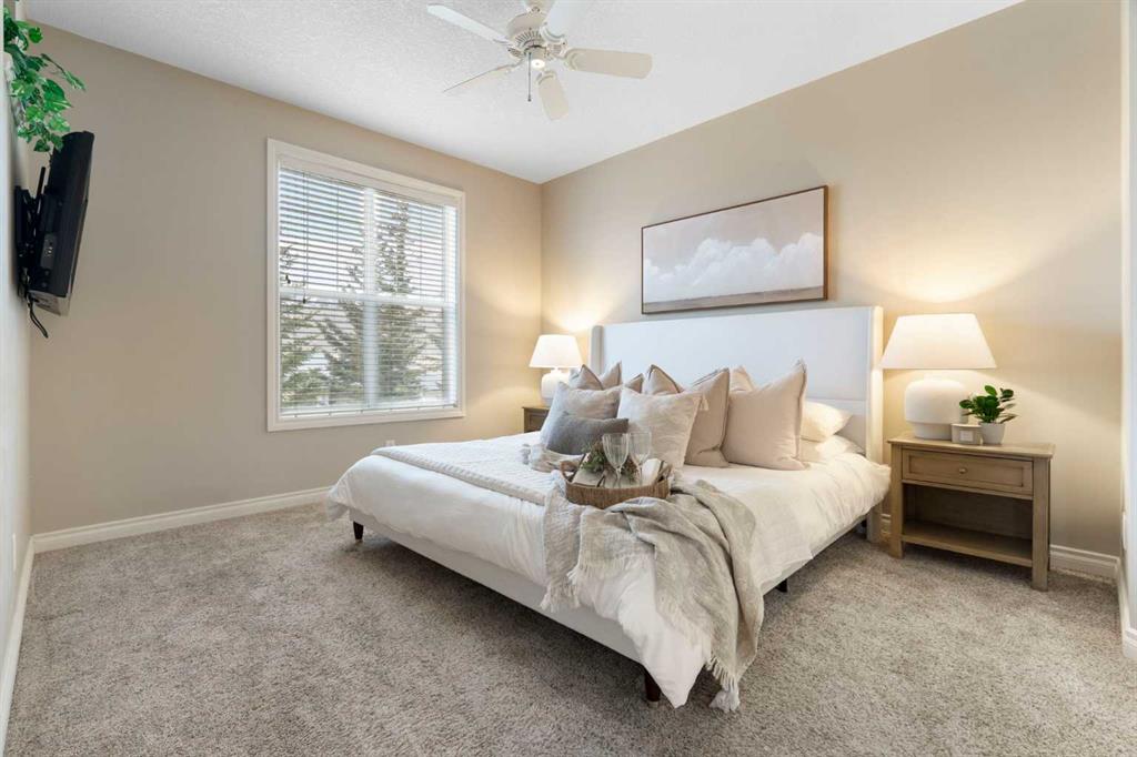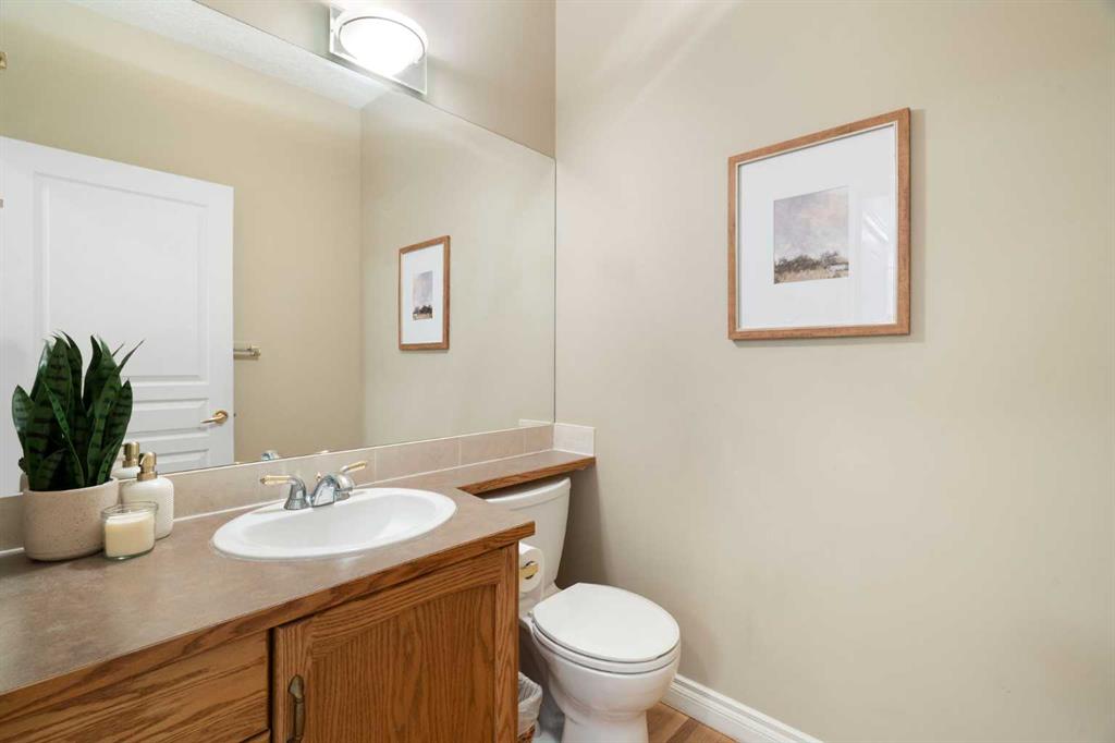 Hello, Gorgeous! Located in the desirable community of GlenEagles in Cochrane, this well-maintained walkout bungalow offers 1,408 sq. ft. above grade plus a fully developed lower level. The main floor features a bright living room with fireplace and valley views, a kitchen with granite countertops and raised island, a breakfast nook with access to the south-facing deck, and a formal dining area. A dedicated main-floor office/den provides flexibility for working from home. The primary bedroom includes a walk-in closet and 5-piece ensuite with in-floor heating and updated glass shower. Main-floor laundry and a powder room add convenience. The fully developed walkout basement offers two additional bedrooms, a 3-piece bathroom, a spacious recreation room with second fireplace, and access to the lower patio. Additional features include refinished hardwood floors, updated appliances, newer roof and hot water tank, upgraded attic insulation, central vacuum, and no Poly B plumbing. The double attached garage is insulated and drywalled with hot and cold water taps. Condo fees include landscaping, snow removal, exterior maintenance, and building insurance. Close to Highway 1A, pathways, and golf, this home offers comfortable living in a scenic setting.