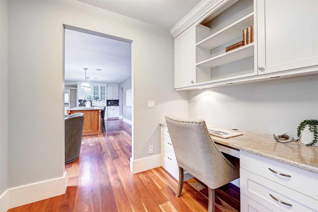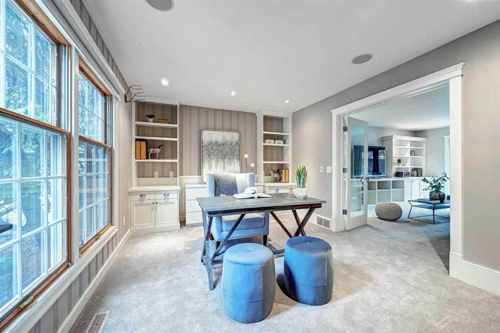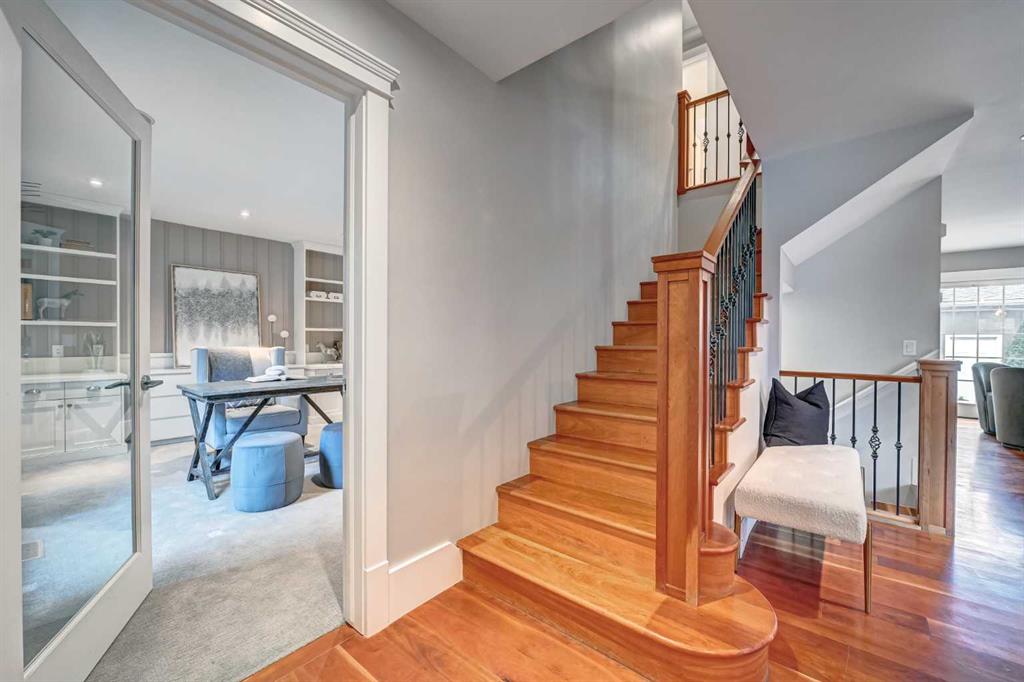 The main floor features stunning site-finished hardwood, abundant natural light, a private front entry, and a spacious office with built in shelving at the front of the home. Thoughtfully designed for family living, the layout includes a formal living room with a wood-burning fireplace, an elegant dining room, an inviting family room with additional built-in shelving, and french doors opening to the large deck and backyard, and an additional office space.
