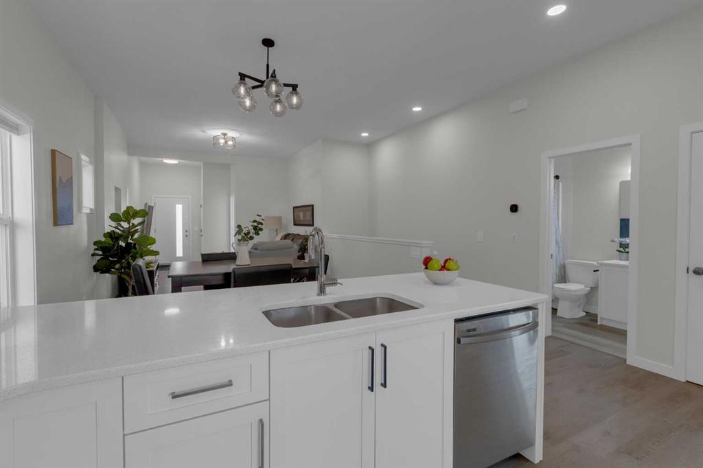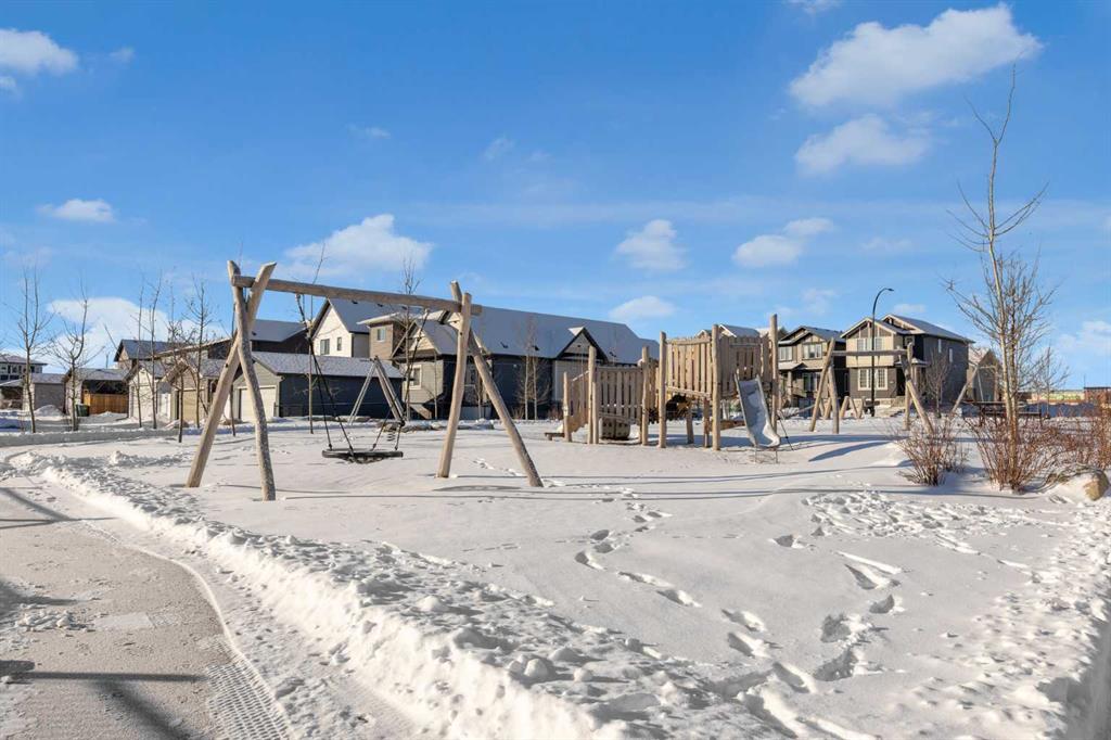 Modern BUNGALOW living with soaring 10’ ceilings, a heated DOUBLE DETACHED 19'x21' GARAGE, and an unbeatable location across from a children's park in Coopers Crossing! Built in 2022 and offering 1,119 sq ft of thoughtfully designed space, this 2 Bedroom, 2 Full Bathroom home delivers stylish single level living with an open concept layout and clean contemporary finishes throughout. Step inside and immediately appreciate the airy feel created by the tall ceilings and expansive main living area finished in durable VINYL PLANK flooring. The bright white Kitchen is both timeless and functional, featuring quartz countertops, crisp white cabinetry, stainless steel appliances, and a long peninsula that offers generous prep space and a comfortable eating area, perfect for casual meals or entertaining guests. The Kitchen flows seamlessly into the Dining and Living areas, creating an inviting space ideal for everyday living. The spacious Primary Suite is designed as a comfortable retreat, complete with a large WALK IN CLOSET and a beautifully finished tiled Ensuite featuring a glass shower for a clean, modern look. A second Bedroom and full Bathroom provide flexibility for guests, a home office, or small family living. The unfinished Basement offers excellent future potential, ready for your vision with room to expand your living space exactly how you need it with 3 large windows and rough in plumbing for a bathroom. Outside, you’ll appreciate the fenced yard, heated and insulated DOUBLE DETACHED GARAGE, offering year round comfort and valuable storage. Conveniently close to 40th Avenue for quick access into Calgary, this home combines convenience, modern design, and low maintenance living in one of Airdrie’s most desirable communities. Welcome home!