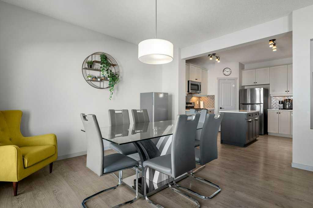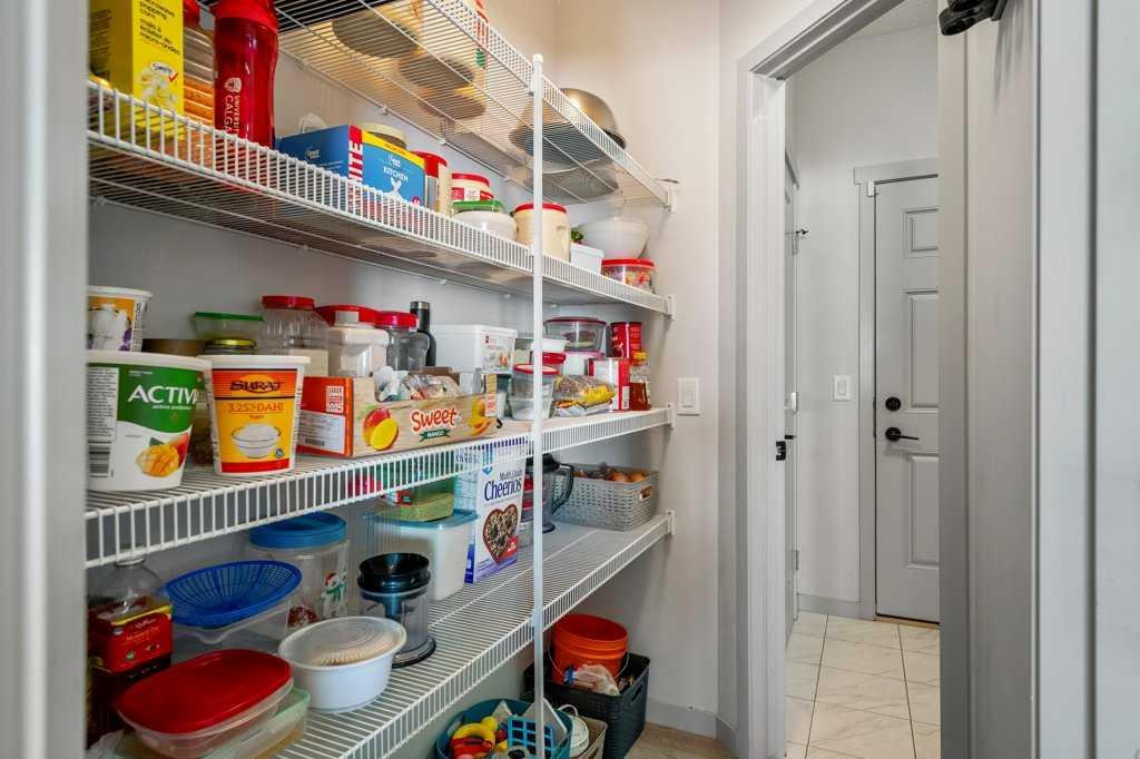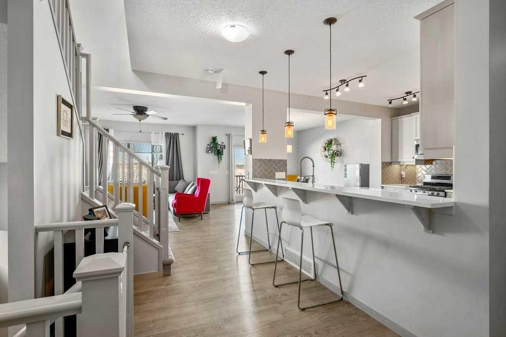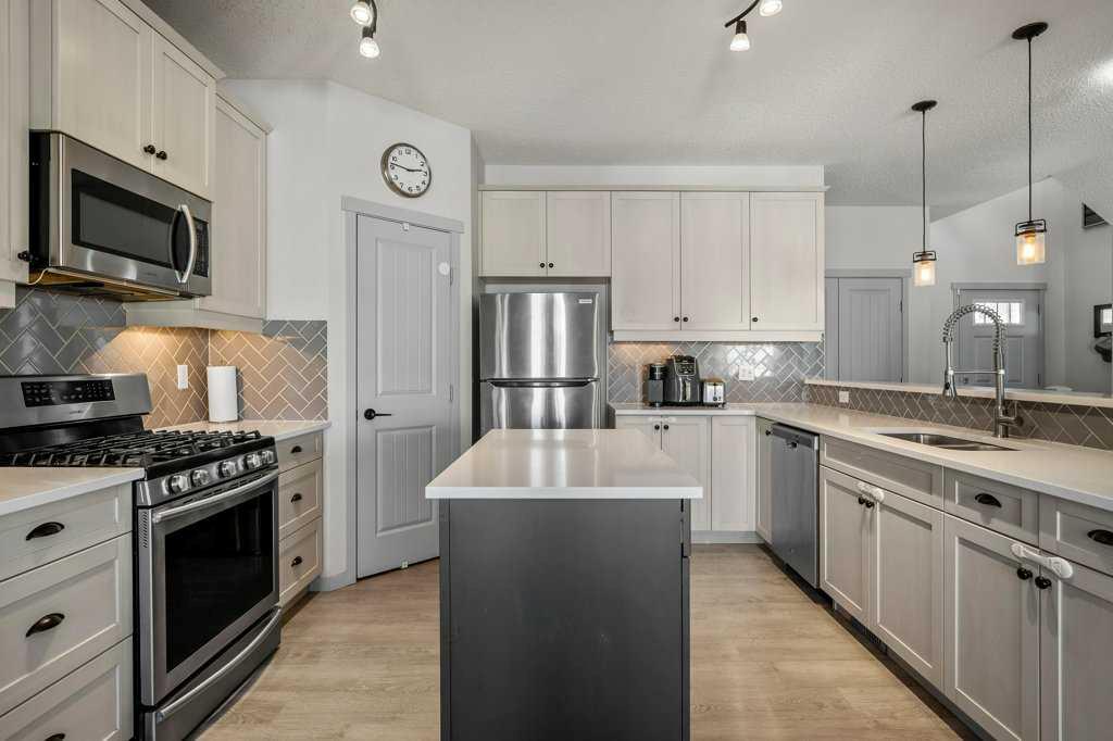 Step inside to 9’ ceilings and neutral tones throughout, creating a bright and welcoming atmosphere. A convenient side mudroom with a 2-piece bathroom sits just off the entry, while the back of the home opens into an entertainment-style layout designed for modern living. The kitchen features a full appliance package including a gas stove, extended cabinetry, quartz countertops, prep island, walk-through pantry, herring bone backsplash—anchored by a massive eating bar overlooking the spacious family-size dining area with access via the sliding doors to the upper vinyl deck wrapped in railing.