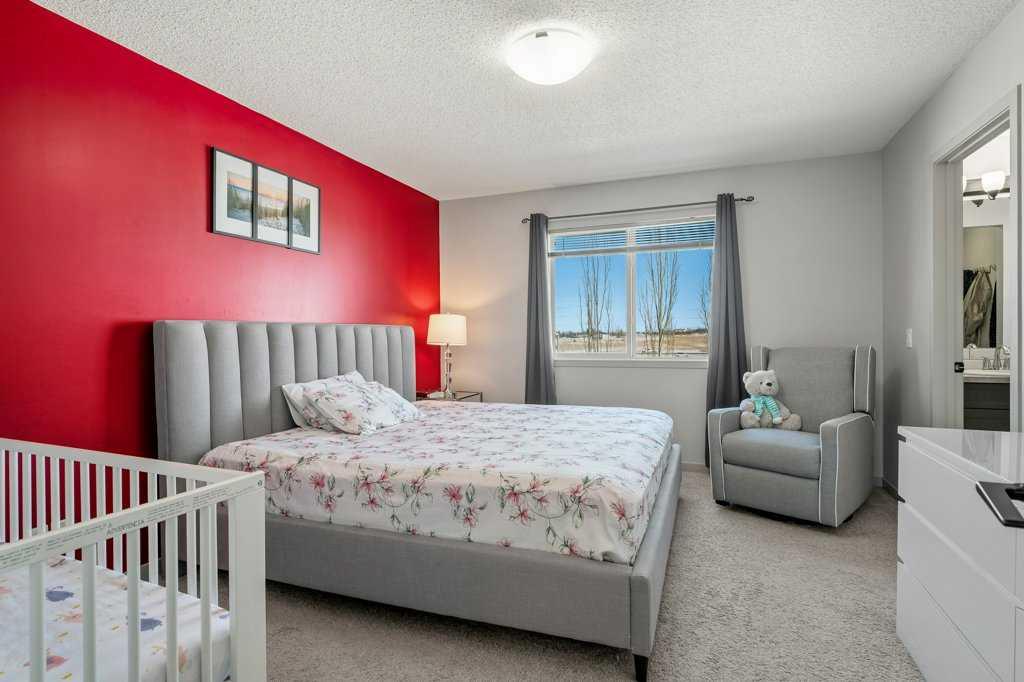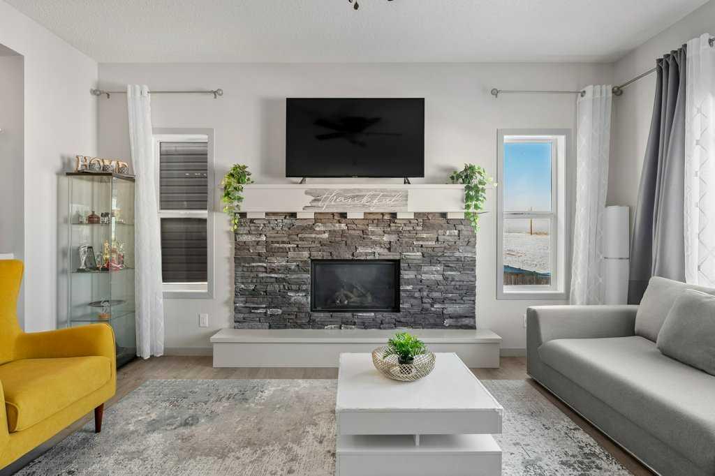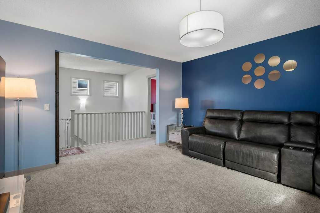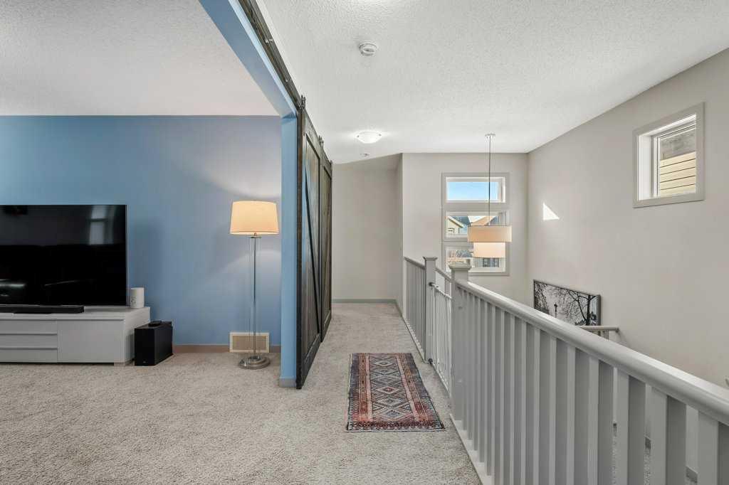 The rear family room is warmed by a focal gas fireplace with upper mantle and lower hearth, perfectly positioned to capture brilliant east-facing morning light. Open railings and transom windows lead upstairs to a thoughtfully designed upper level, highlighted by a central bonus room with barn door closure. Two front children’s bedrooms share a tiled 4-piece bathroom accented with subway tile, while an upper laundry room adds everyday convenience. The rear primary retreat easily accommodates a king-size bed and includes a walk-in closet and spa-inspired 5-piece ensuite featuring tiled floors, dual sinks, a deep soaker tub wrapped in tile accents, and an oversized walk-in shower.