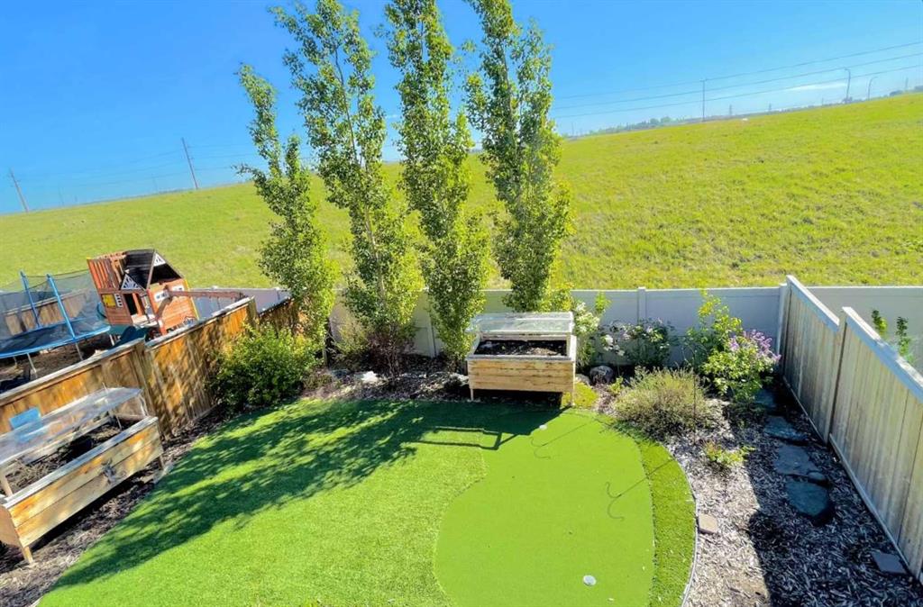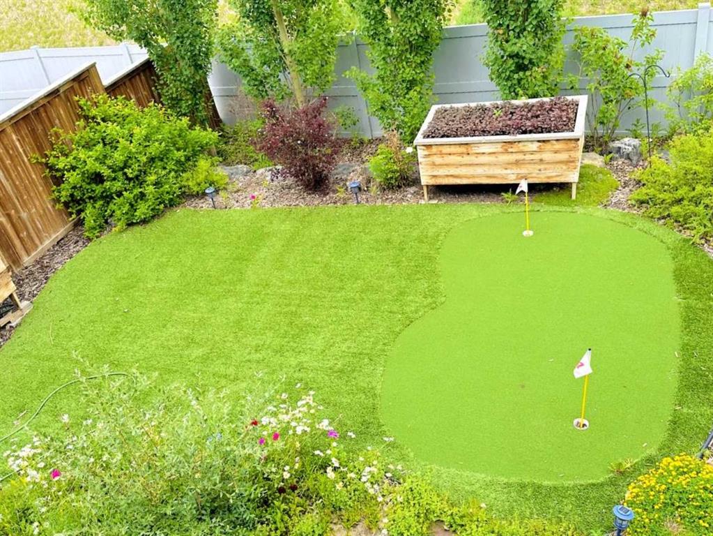 The walkout lower level is fully finished and filled with natural light from a wall of windows, offering a second living space, kitchen area with a full appliance package, fourth bedroom, and a 3-piece bathroom—ideal for extended family or supplemental living. Outside, the yard is fully fenced and landscaped, complete with a lower concrete patio, synthetic grass putting green, and a wrap-around walkway from front to back.
