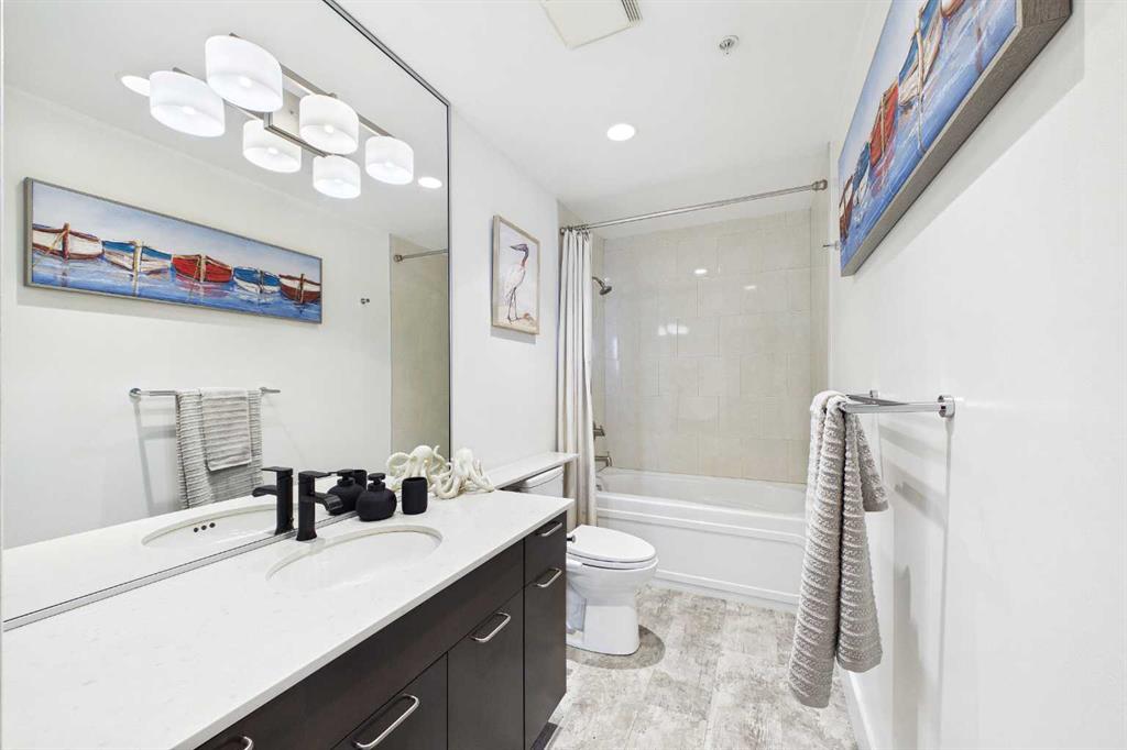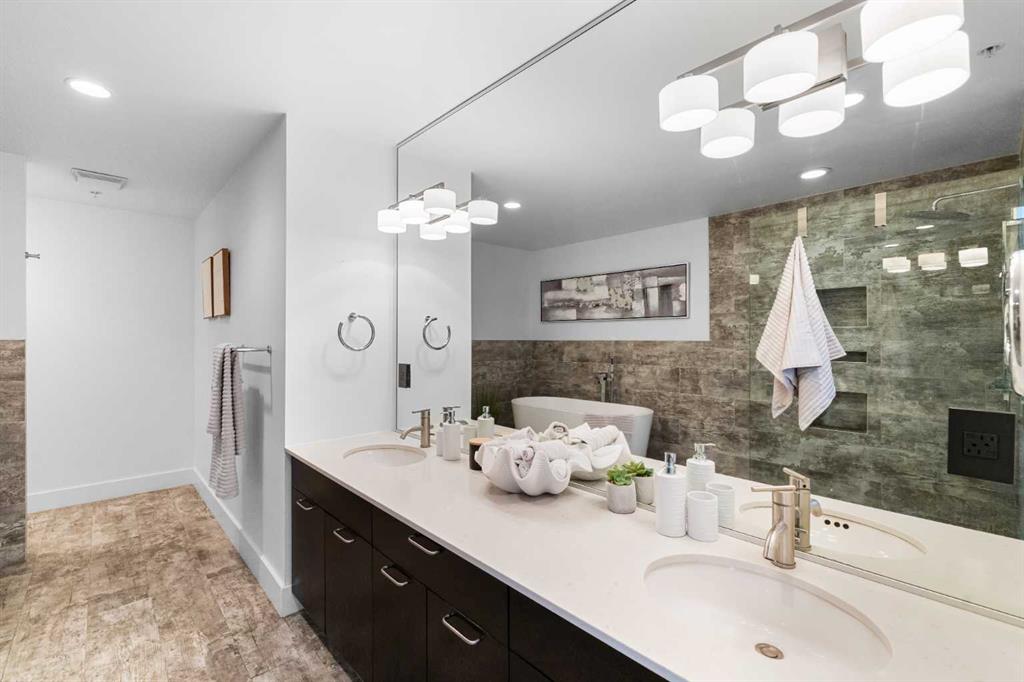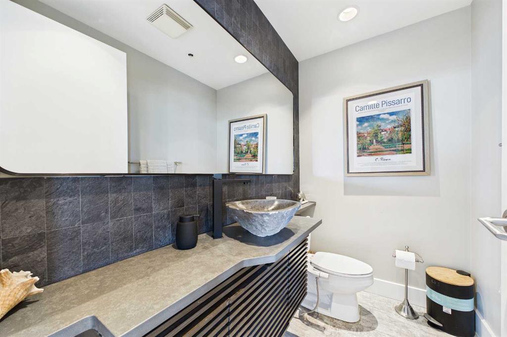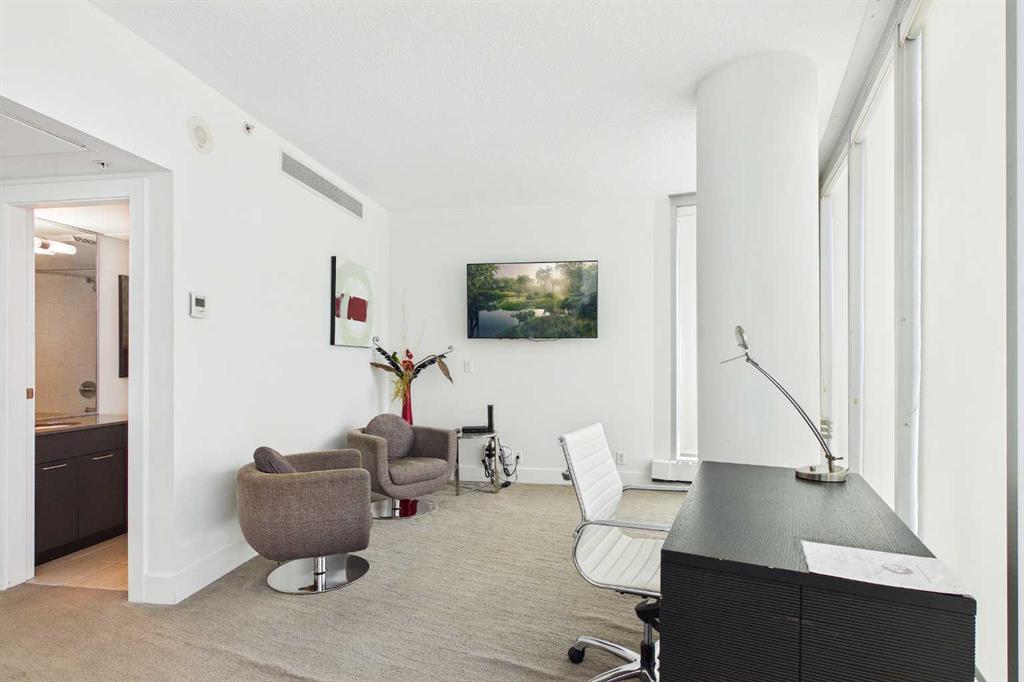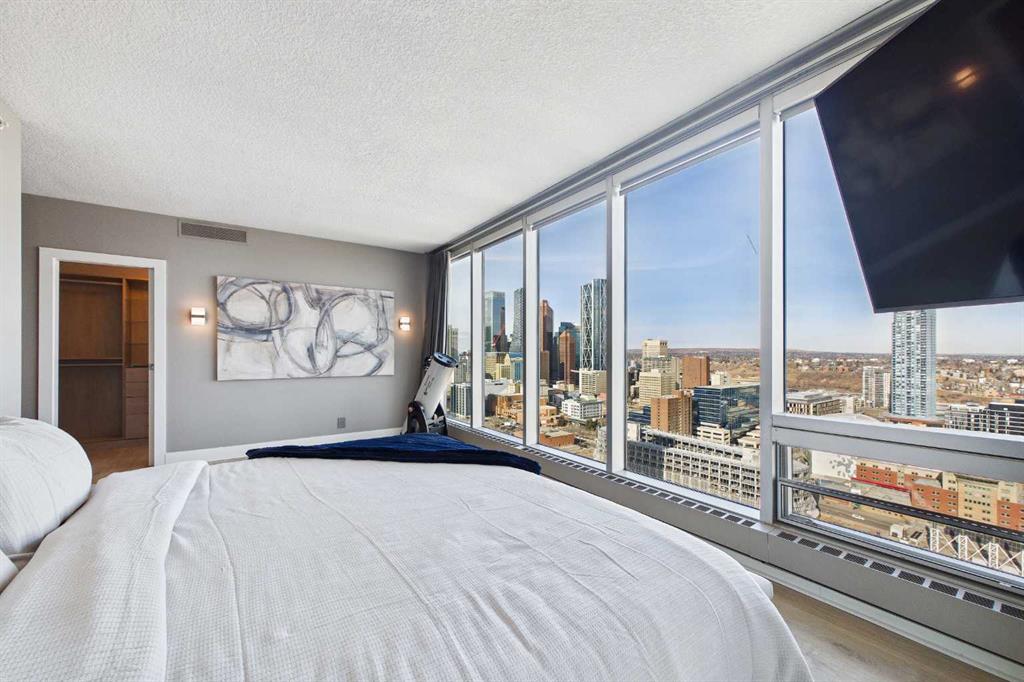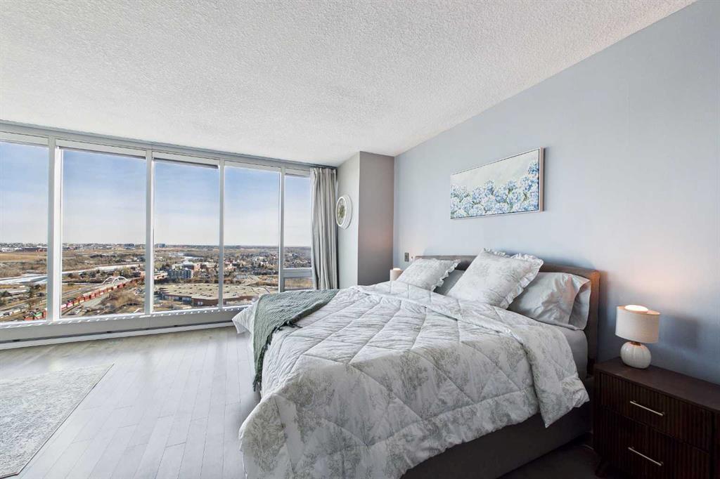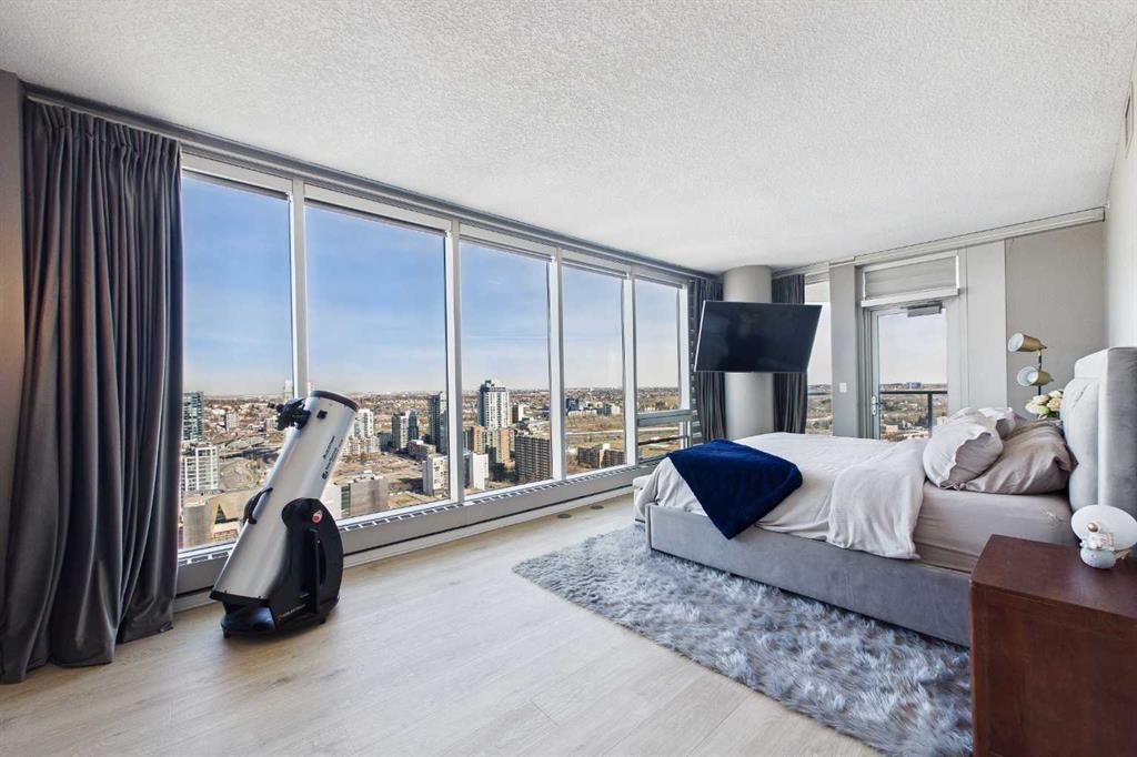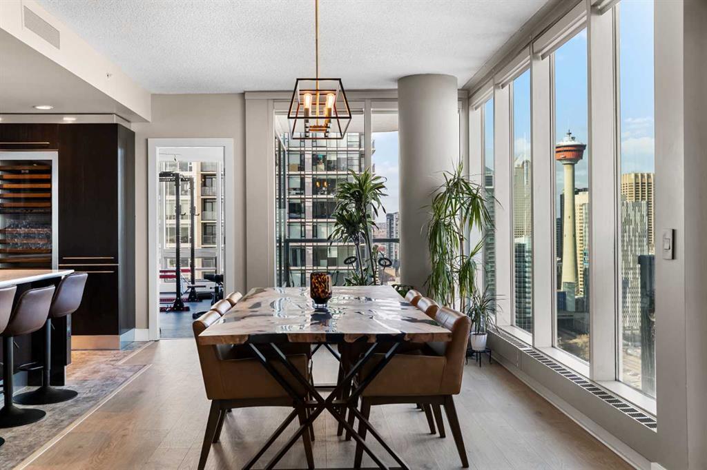 Your day begins with the soft glow of the morning sun spilling through floor-to-ceiling windows, offering panoramic views of downtown Calgary from every room. After a workout in your private home gym, you enjoy breakfast at the leathered granite counter perfectly positioned by the window to take in the city skyline. This 2,600+ sq ft sanctuary is a masterclass in executive hosting; as evening nears, the gentle trickle of the custom stone waterfall sets the mood while you select a vintage from your full-size, dual-zone wine fridge. Whether you are preparing drinks at the sophisticated leathered granite dry bar or a gourmet meal using the suite's high-end appliances, the space flows effortlessly for any occasion. The layout offers unmatched privacy with two spacious primary bedrooms, each featuring its own ensuite—including a lavish 5-piece spa retreat in the main suite. When you’re ready to head out, your private elevator opens directly into your suite, whisking you down to the vibrant pulse of the Beltline. You are perfectly positioned in the new Entertainment District, just steps from the new Calgary Flames arena, Stampede grounds, and river pathways. Living at the Arriva means effortless luxury, supported by 24-hour security and concierge services, a rooftop garden, owner’s lounge, guest suites, and central A/C—all complemented by modern updates including a new washer and ventless dryer.