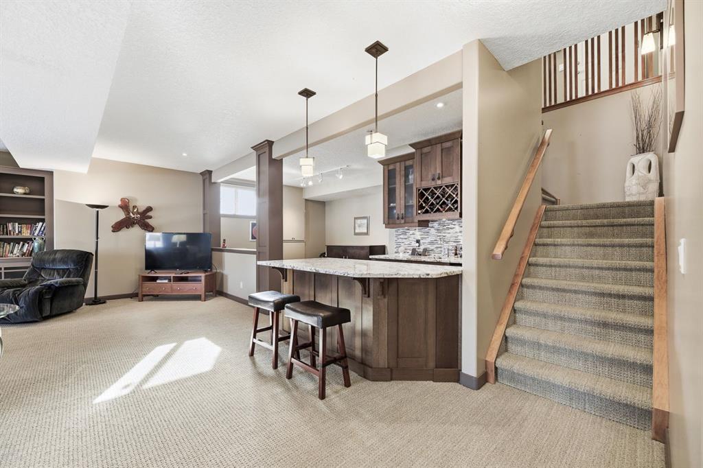 The fully developed walkout basement is a standout, offering 9' ceilings, in-floor heating, and a spacious recreation/family room complete with more built in cabinetry around the second gas fireplace that radiates warmth on chilly evenings. A large guest bedroom and a 4-piece bathroom, a wet bar area, and a generous utility/storage room complete this level.