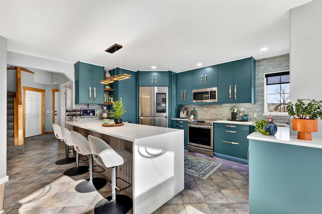 Welcome to the heart of sought-after Somerset in Southwest Calgary, where timeless charm meets inspired modern design. Situated on a generous lot in this established & mature neighbourhood, this meticulously maintained & extensively updated two-storey home offers over 2,700 sq. ft. of beautifully developed living space—delivering the perfect balance of classic community living & contemporary refinement. Step inside & you’re welcomed into a home that has been thoughtfully curated from top to bottom. Vaulted ceilings, sunken living room & a striking three-sided fireplace adorned with a one-of-a-kind walnut mantle create warmth & architectural interest. Every detail reflects intentional design & pride of ownership. The fully renovated kitchen is truly the heart of the home—timeless in style & exceptional in function. Featuring ceiling-height cabinetry, extended waterfall quartz countertop with shiplap detailing, designer lighting, under-cabinet illumination & a sleek stainless steel appliance package including an induction stove & high-tech refrigerator—this space is equal parts beauty & performance. New vinyl flooring & carpet flow seamlessly throughout while the fresh flat-finish ceilings elevate the main level’s modern aesthetic. A bright main-floor office offers the perfect work-from-home setting, while the renovated laundry room impresses with custom built-ins, shiplap accents, a folding counter & 2024 washer and dryer. Even the powder room has been elevated with a stylish vanity, smart toilet & designer storage solutions. Upstairs, a spectacular media room awaits—complete with a feature fireplace, custom built-in wall, hidden electronic room & sleek sliding door for added privacy. 3 bedrooms feature new flooring & paint, while the fully renovated main bath showcases modern finishes & thoughtful design. The primary retreat is nothing short of stunning. Vaulted ceilings, beautiful skylight & walk-in closet complement the spa-inspired ensuite renovation—floor-to-ceiling tile, rain shower with built-in bench & niche, penny tile shower floor, LED-lit mirrors, & under-vanity lighting. It’s a private sanctuary designed for relaxation. The fully finished basement extends your living space with a large recreation room, 4th bedroom with walk-in closet & a full bathroom. Two newer Rheem hot water tanks and a meticulously maintained utility space further reflect the exceptional care invested in this home. Step outside & prepare to fall in love. The backyard is an entertainer’s dream featuring a fully covered built-in BBQ area, a lower deck with pergola & bistro lighting, extensive stonework, stamped concrete pathways, designated patio with gas firepit, pondless waterfall, smart exterior lighting system & a sizeable storage shed. A new Class 4 hail-resistant roof with high-profile ridge cap adds both peace of mind & value. This is truly the best of both worlds. A traditional lot in a beloved established community, paired with the fresh sophistication of a modern renovation.