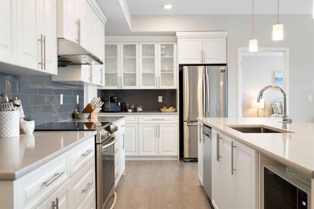 The chef-inspired kitchen is truly the heart of the home, featuring full-height cabinetry, quartz countertops, upgraded stainless steel appliances, a built-in oven, microwave, large sink, spacious pantry, and a generous sit-up island ideal for entertaining. The open-concept dining and living areas are bright and inviting, highlighted by 9’ ceilings, luxury vinyl plank flooring, and modern window coverings.