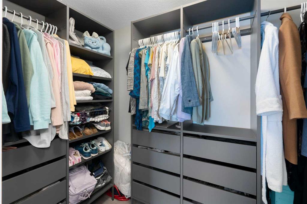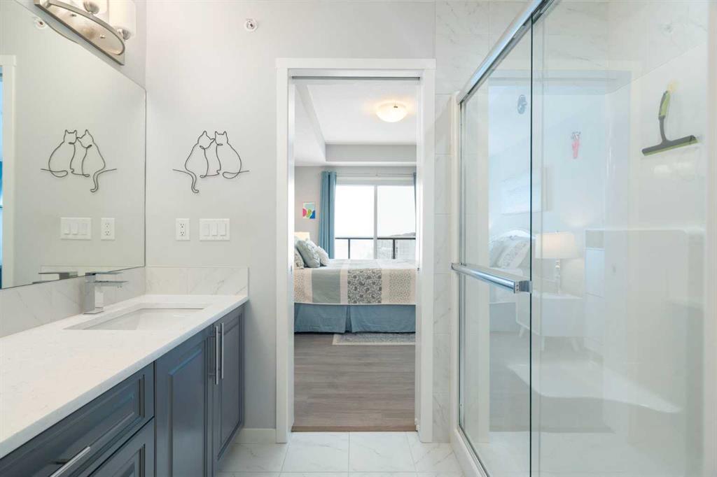 The primary suite is a private retreat, complete with a walk-in closet, direct balcony access, and a beautifully appointed ensuite showcasing dual sinks, quartz counters, and a walk-in shower. Two additional bedrooms share a stylish 4-piece bathroom, while the generously sized laundry room offers excellent additional storage.