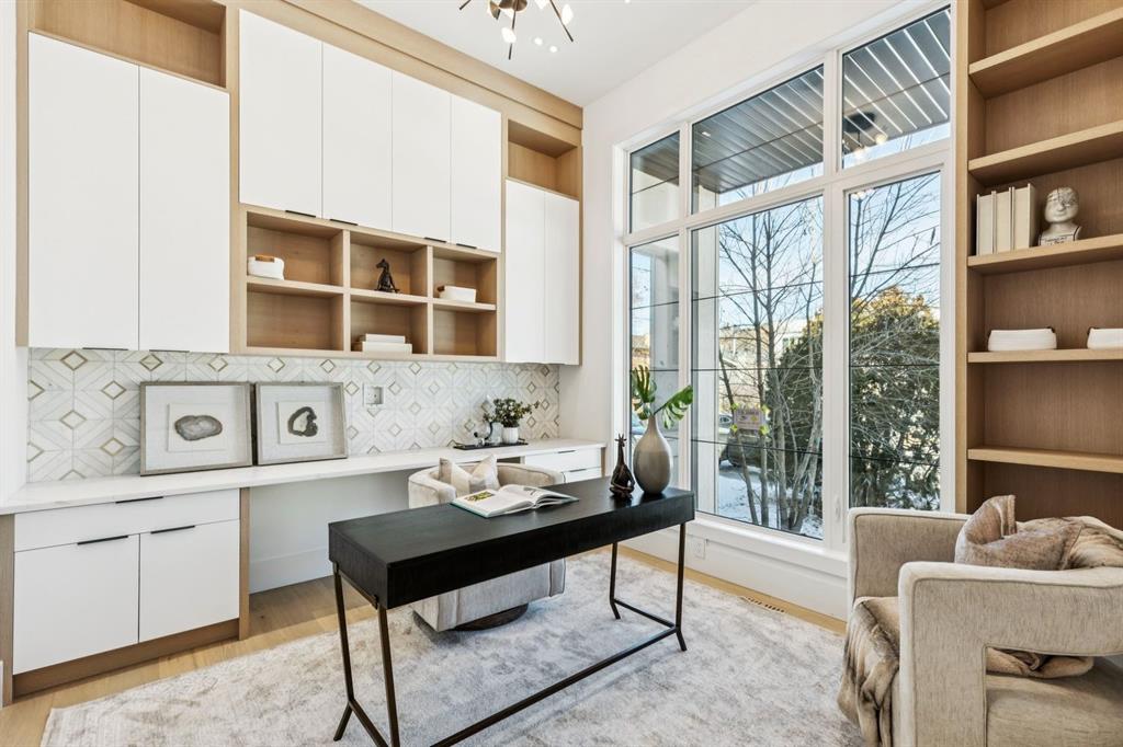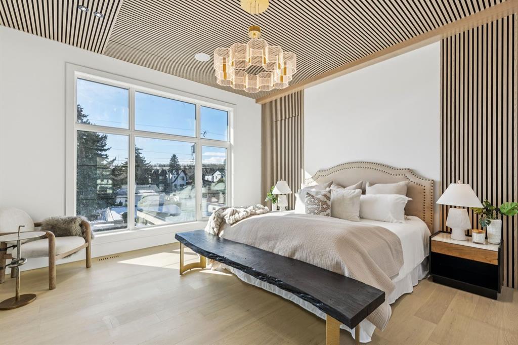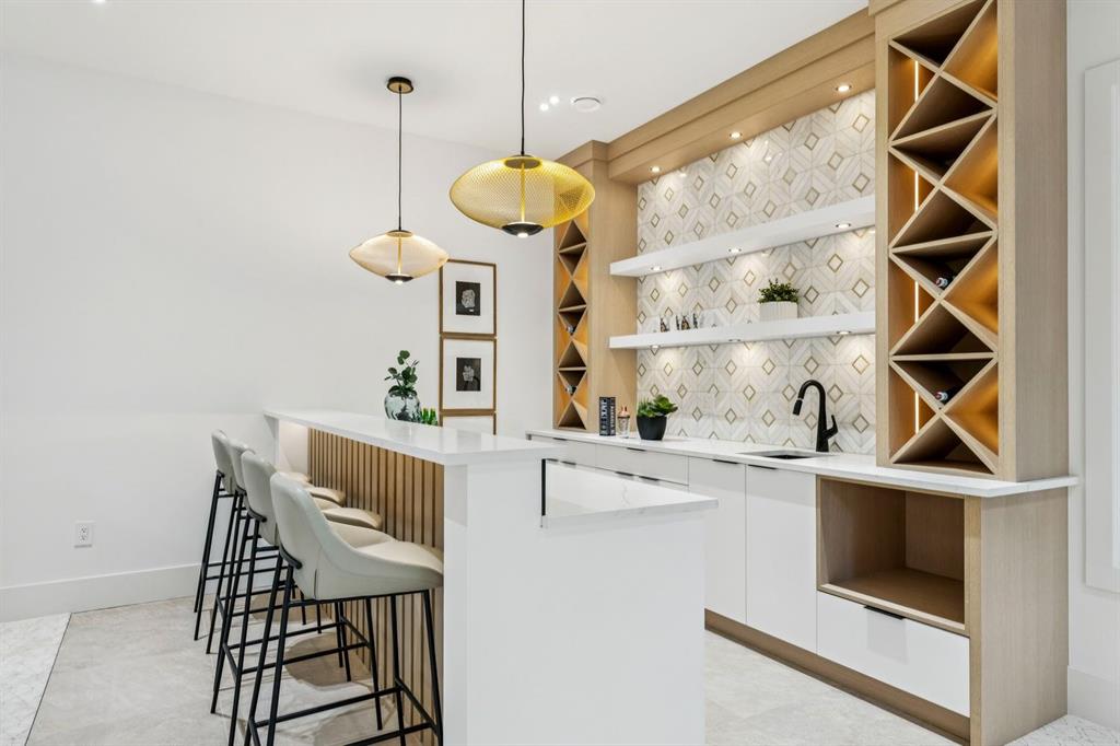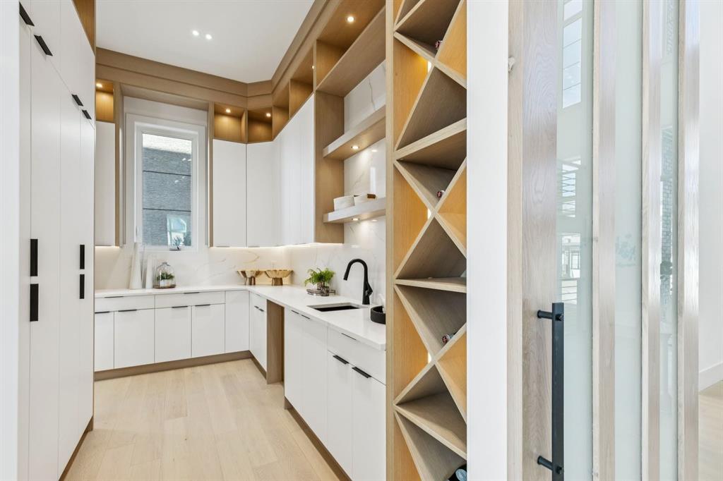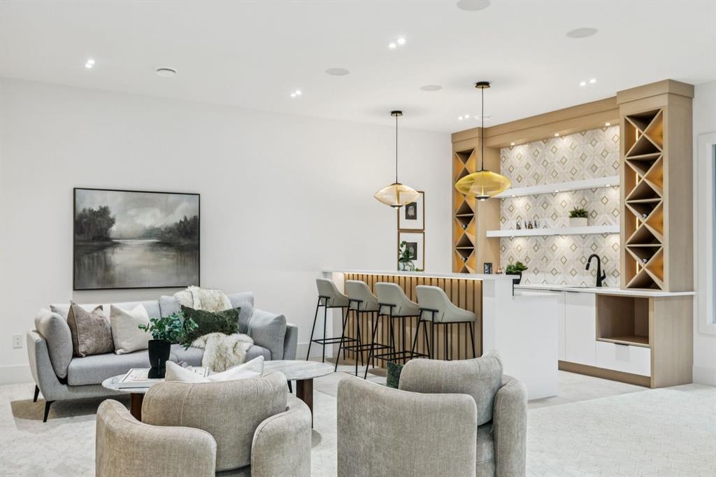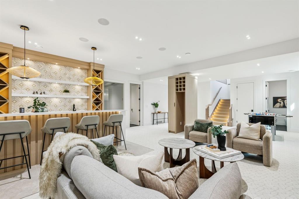 Discover refined living in this exceptional custom build by HeavenView Homes, ideally located in sought after West Hillhurst. Crafted with uncompromising attention to detail, this home sets a new standard for luxury with elevated design, impeccable finishes, and thoughtfully curated spaces throughout. From the moment you enter, a custom solid wood and metal feature railing creates a striking architectural statement, while soaring 12 ft ceilings on the main level and 10 ft ceilings on the upper and basement levels enhance the home’s sense of scale. White oak hardwood floors, dramatic feature walls, more than 200 pot lights, and extensive LED strip lighting elevate the interior, while oversized triple pane windows flood the home with natural light and complement whole house spray foam insulation for superior efficiency. The elegant dining room flows into the living room, separated by a custom LED-lit architectural feature wall, while bespoke millwork frames a sleek linear gas fireplace. Expansive sliding doors open to a premium exposed concrete patio with an outdoor gas fireplace, seamlessly blending indoor and outdoor living while overlooking the sunny South facing backyard. The statement kitchen is equipped with premium JennAir appliances including a gas cooktop, built-in oven, microwave, and coffee system, complemented by quartz counters, an oversized island, and extensive custom cabinetry. A wraparound butler’s pantry provides abundant storage, shelving, and dedicated wine storage. A spacious mudroom with built-ins connects to the triple attached garage, finished with epoxy flooring and a heater, while AC will also be installed to the home for added comfort. Upstairs, natural light fills the open riser staircase and leads to a well appointed laundry room, coffee/beverage station, and four generous bedrooms, each with feature walls and private ensuites. Bathrooms are enhanced with upgraded Japanese toilets, blending advanced technology with refined design. The primary retreat features a custom walk-in dressing room and a luxurious 6pc ensuite with a deep soaker tub and glass encased steam shower with body sprays. The lower level is designed for relaxation and entertaining with radiant boiler in-floor heat, plush carpets, expansive games and rec areas, a fully equipped wet bar, and extensive wine storage. A dedicated home gym with rubber flooring and mirrored walls, a fifth bedroom with its own ensuite, and an additional powder room complete the space. Technology is seamlessly integrated with 20+ pairs of KEF in-ceiling speakers throughout. The South facing backyard will also feature a fully new fence and professional landscaping once weather permits. Ideally located minutes from Westmount Charter School, Helicopter Park, the off-leash dog park, Foothills Medical Centre, and the Bow River Pathway, this remarkable residence seamlessly blends timeless elegance with modern sophistication.