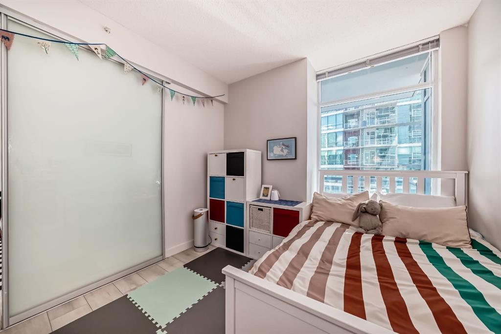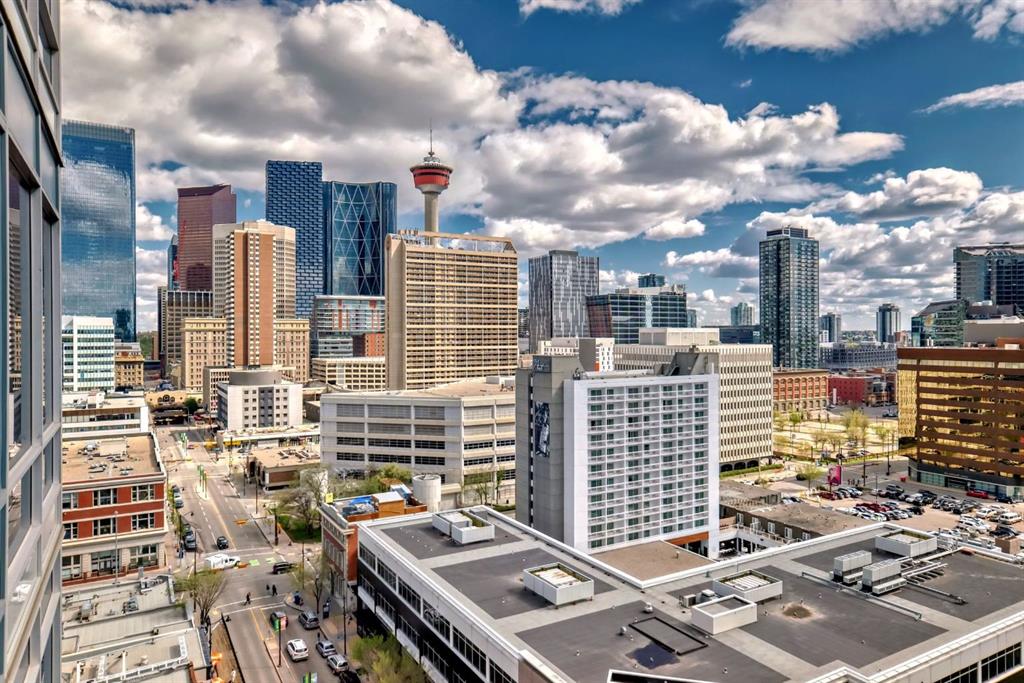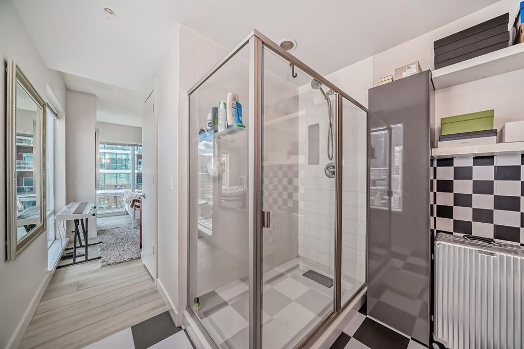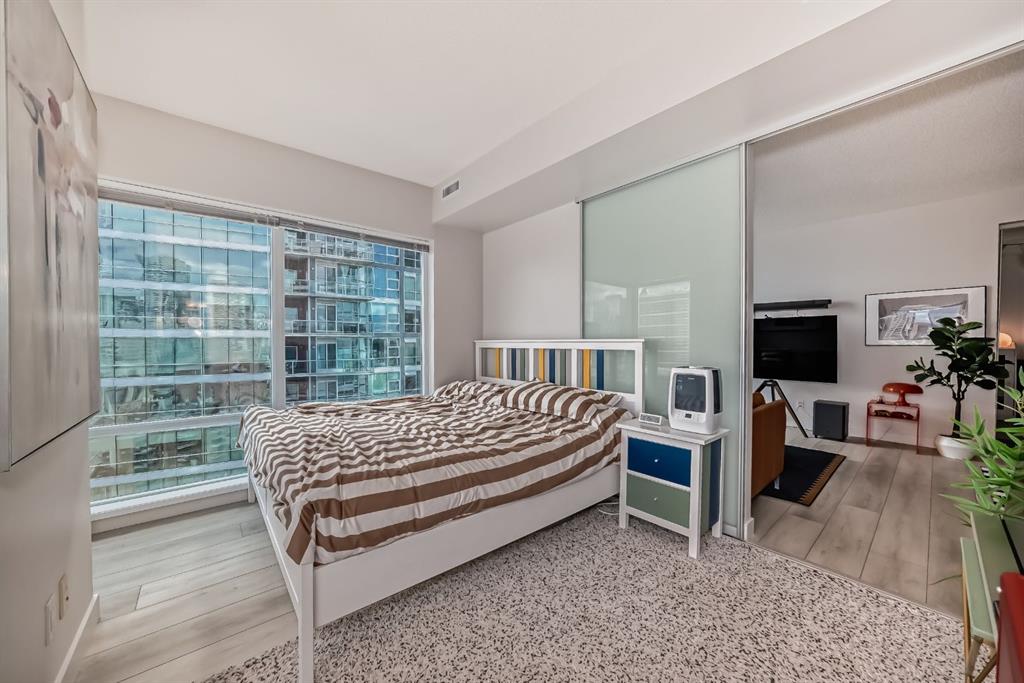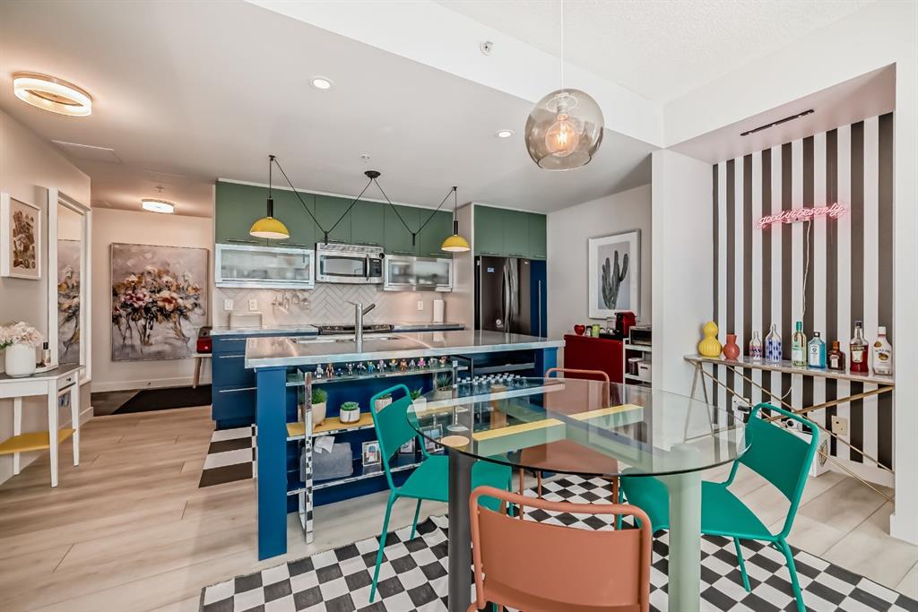 This revamped Union Square condo captures the essence of modern urban sophistication. Lofty ceilings and expansive windows flood the space with natural light while framing breathtaking views of Downtown Calgary. The kitchen is a contemporary masterpiece, featuring an industrial-chic design with a black, white, and stainless-steel color palette. The upgraded light grey vinyl plank floors and statement lighting, including funky track lights and a bold chandelier, add a trendy edge to the space. The kitchen boasts a sleek stainless-steel-look countertop, offering a stylish modern update over its original quartz finish. A generous island invites socializing and casual dining, seamlessly flowing into the open-concept living area. Here, a built-in nook provides a versatile space for a home office or extra storage. Step out onto the private balcony for sweeping city views, from the iconic Calgary Tower to the bustling Stampede grounds. The primary suite is a retreat, complete with a walk-in closet and a spa-like ensuite featuring a vessel sink and glass-enclosed shower. The second bedroom is equally spacious, with jack-and-jill access to the main bathroom, ensuring privacy and convenience for guests or roommates. In-suite laundry adds to the effortless lifestyle this home provides. Located in the heart of the Beltline, this condo offers secured underground parking and unbeatable walkability. With a walkscore of 93, you’re just steps away from renowned bars, restaurants like Ten Foot Henry, Midtown, and Proof, as well as parks, grocery stores, fitness centers, and the C-train. The river pathways and Stampede grounds are also within easy reach, making this an ideal home for modern city dwellers. Schedule your viewing today to experience contemporary Beltline living at its finest!