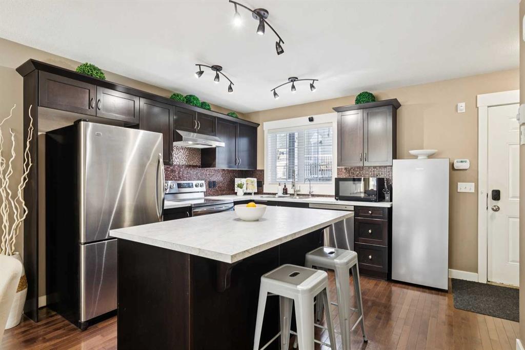 END-UNIT | 3 BEDROOMS | FINISHED BASEMENT | 2 PARKING SPOTS | Welcome to this BRIGHT 3 bedroom end-unit townhome in the established community of RAINBOW FALLS. The main floor offers an OPEN CONCEPT layout designed for everyday living. Large windows bring in NATURAL LIGHT, and the spacious living and dining areas flow seamlessly into the kitchen — creating a layout that works beautifully for both quiet evenings and entertaining. The kitchen features STAINLESS STEEL APPLIANCES, a CENTRAL ISLAND with seating, PANTRY storage, and plenty of cabinetry to keep everything organized. Upstairs, the PRIMARY BEDROOM is a generous size and offers a WALK-IN CLOSET. Two additional bedrooms and a FULL 4-PIECE BATH provide flexibility for family, guests, or a home office. The FINISHED BASEMENT adds valuable living space with a LARGE REC ROOM — ideal for movie nights, a playroom, home gym…whatever you need. Laundry and storage are neatly tucked away with rough-in there if you want to add a future bathroom. UPDATES: Kitchen Countertop (2026), Carpet Basement Stairs (2026), Washer, Stove and Dishwasher (2023), Dryer and Hot Water Tank (2022). Step outside where you can enjoy morning coffee or summer BBQs. Two ASSIGNED PARKING STALLS are located directly out front, with ample VISITOR PARKING nearby. Set within walking distance to schools, playgrounds, pathways, shopping, and the OFF-LEASH DOG PARK — and just minutes to CHESTERMERE LAKE — this home offers the lifestyle buyers are looking for. Whether you’re a FIRST-TIME BUYER, young family, or investor, this MOVE-IN READY townhome checks the boxes.