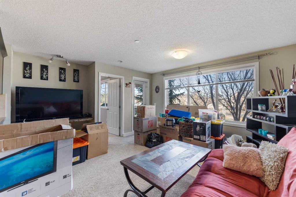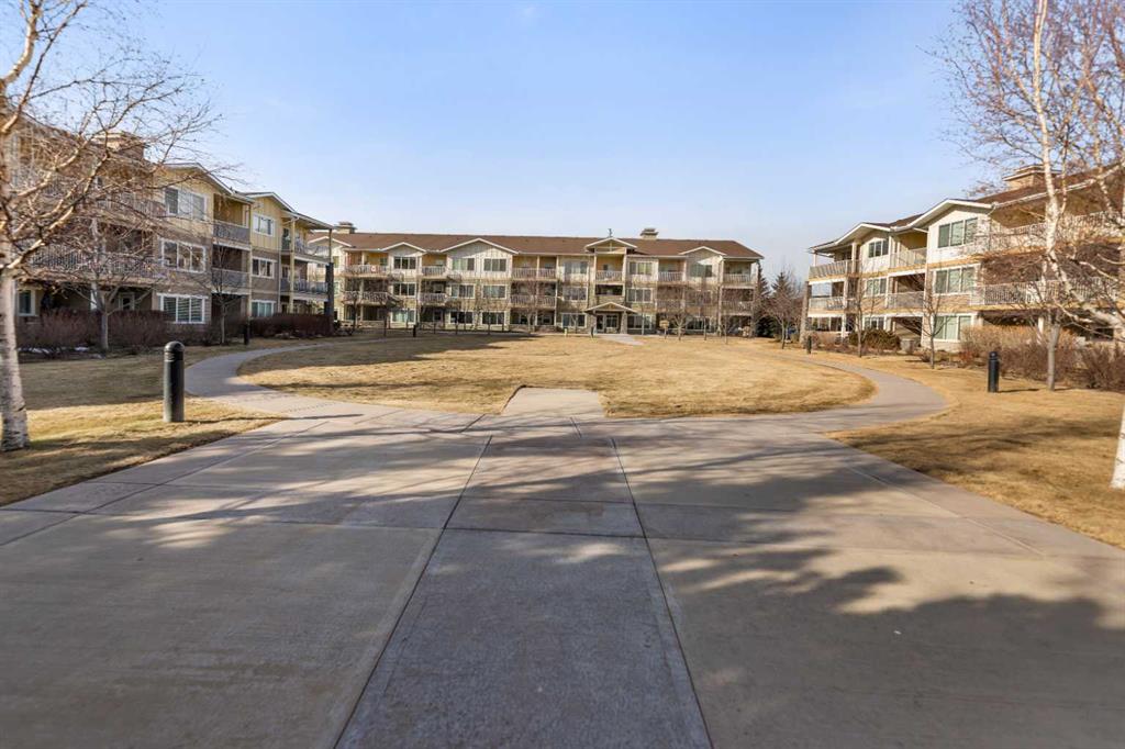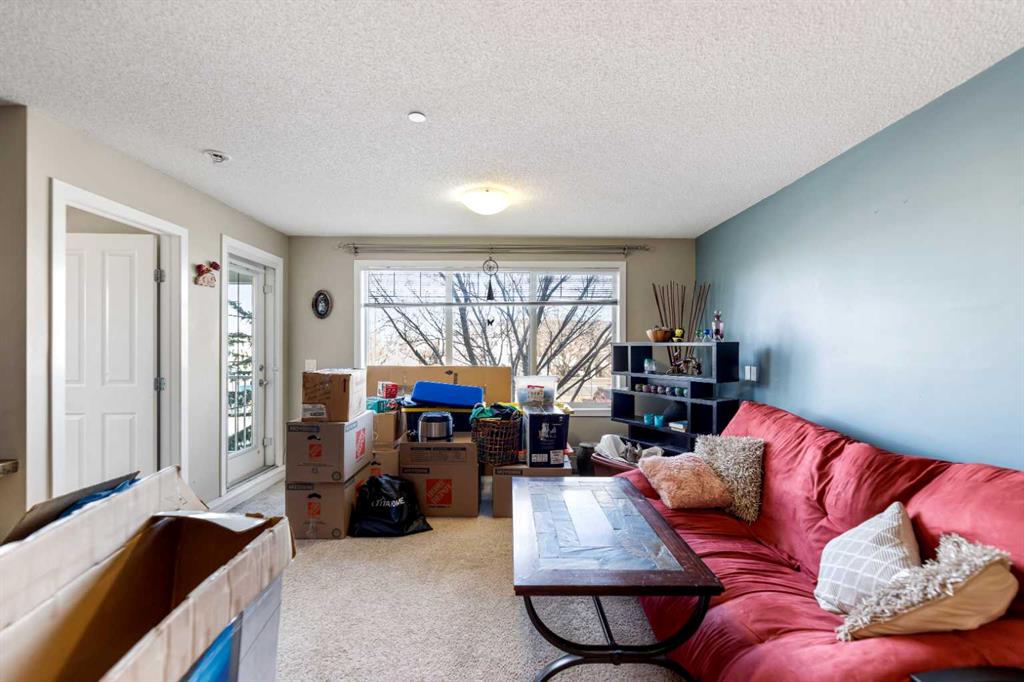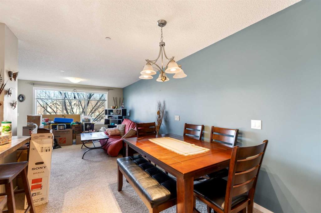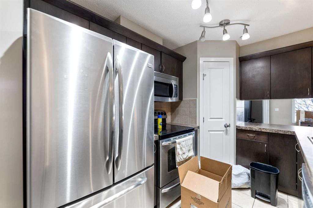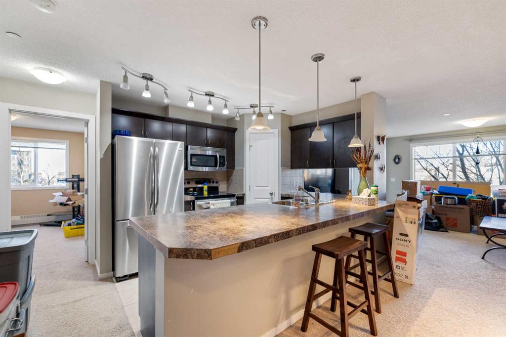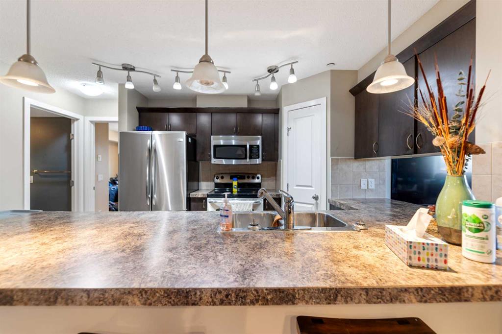 Welcome to this bright and well-designed apartment condo located in the desirable community of King’s Heights in Airdrie. This second-floor corner unit offers approximately 860 sq ft of comfortable living space, featuring 2 bedrooms and 2 full 4-piece bathrooms, including a private ensuite off the primary bedroom. The open-concept layout seamlessly connects the living room, dining area, and kitchen, creating an inviting space for everyday living and entertaining. The kitchen offers ample counter space, plenty of cabinetry, and a convenient sit-up breakfast bar. Large windows throughout the unit fill the home with natural light, while a patio door leads to the covered balcony, complete with a gas hookup for your BBQ. The thoughtfully designed floor plan places the bedrooms on opposite sides of the unit, providing added privacy, with the primary bedroom showcasing a walk-through closet. This unit also includes one titled parking stall and an assigned storage unit for added convenience. Ideally located close to schools, parks, playgrounds, shopping, restaurants, and with quick access to Highway 2 for easy north or south commuting, this property is perfect for first-time buyers, downsizers, or as a smart addition to your rental portfolio.