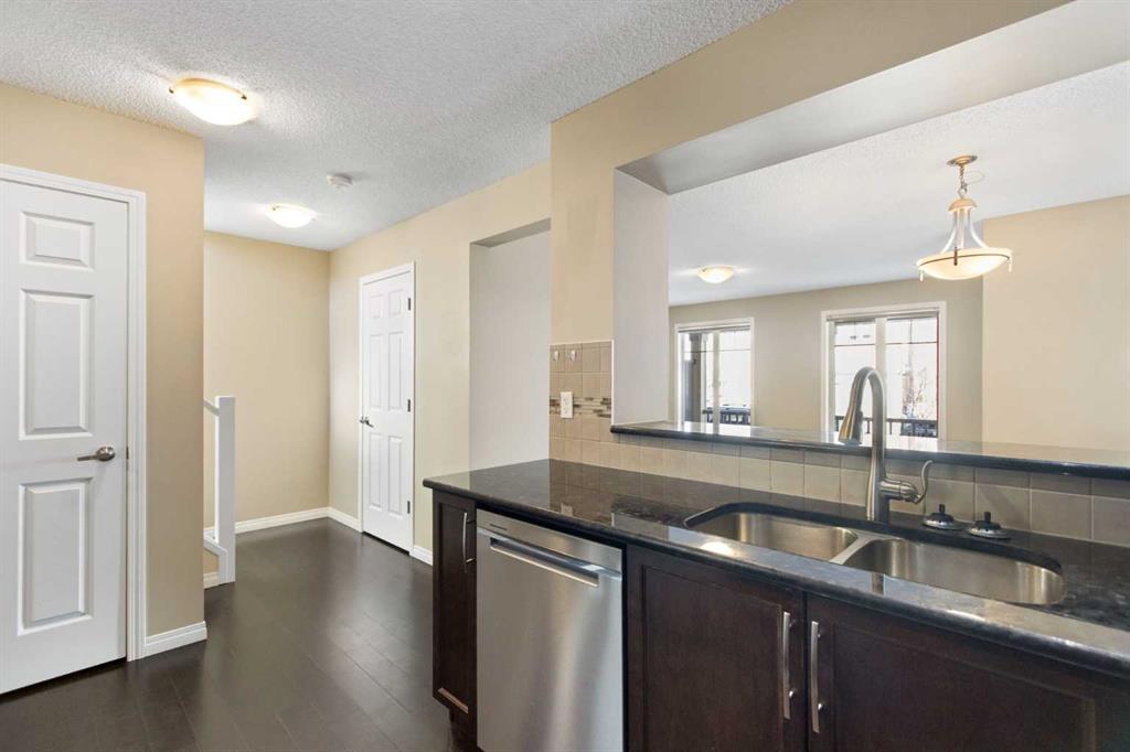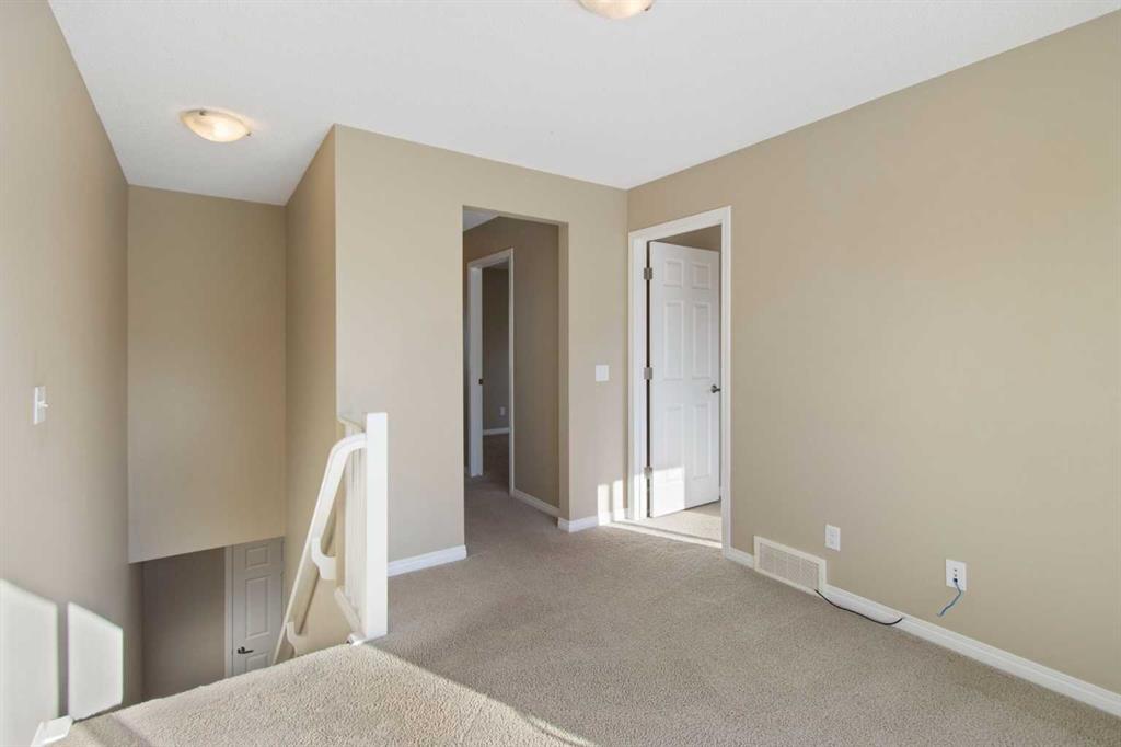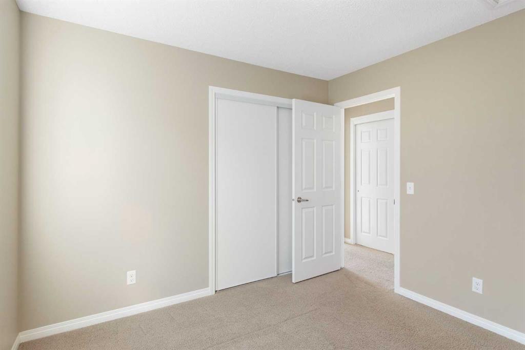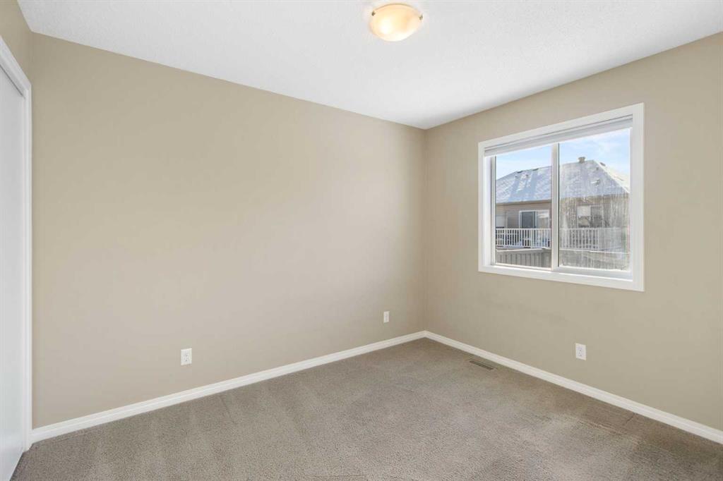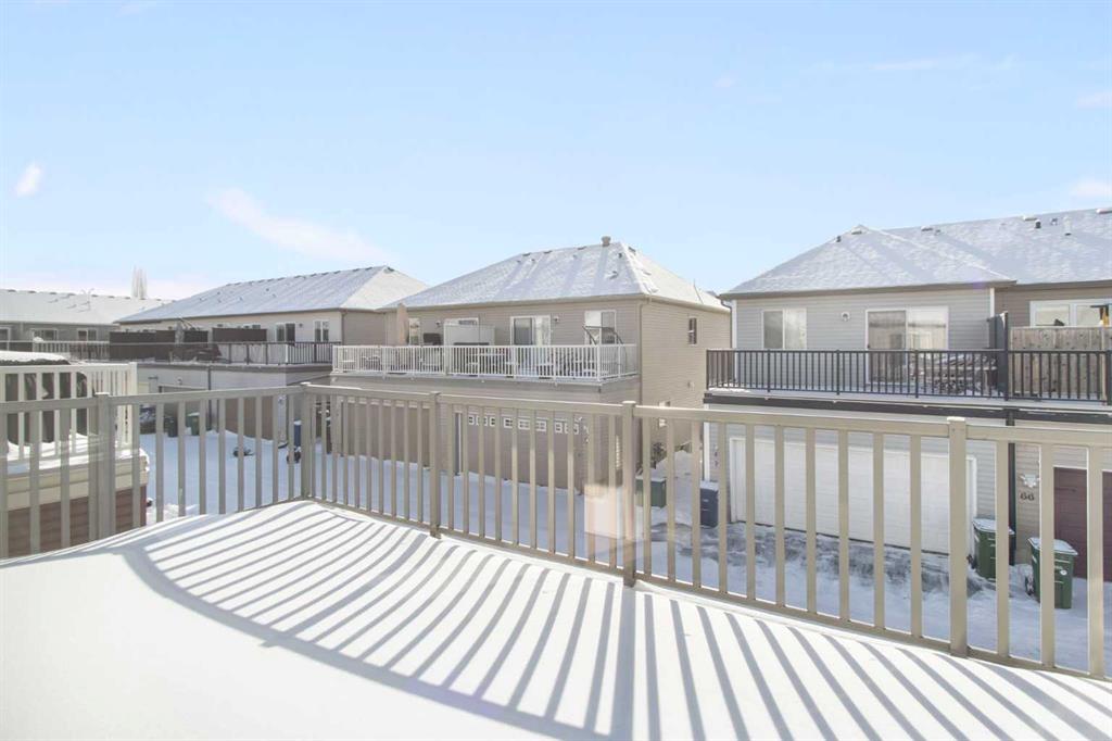 Welcome to this stylish and affordable end-unit two-storey townhome in desirable Windsong, offering unbeatable value with no condo fees, a double attached garage, and a massive south-facing rooftop patio. Located on a quiet, family-friendly street with abundant parking, this home features a front yard, side green space, attractive landscaping, and a spacious covered front porch. Inside, a bright entryway leads to an open-concept main floor with a generous living room, dining area, and well-designed U-shaped kitchen complete with stainless steel appliances, electric stove, built in dishwasher, pantry, raised eating bar, and ample cabinetry and counter space. A mudroom off the kitchen provides convenient access to the garage and main floor half bath. Upstairs offers a versatile bonus/tech space with direct access to the sunny Duradek rooftop patio, along with three well-sized bedrooms including a primary suite with walk-in closet and 4-piece ensuite, plus an additional full bathroom. The unfinished basement includes laundry, bathroom rough-in, and room for future development. Perfect for first-time buyers, downsizers, or anyone seeking a low-maintenance lifestyle, this move-in ready home is close to schools, parks, shopping, dining, medical services, and scenic pathways, delivering exceptional comfort, functionality, and value in a vibrant community.