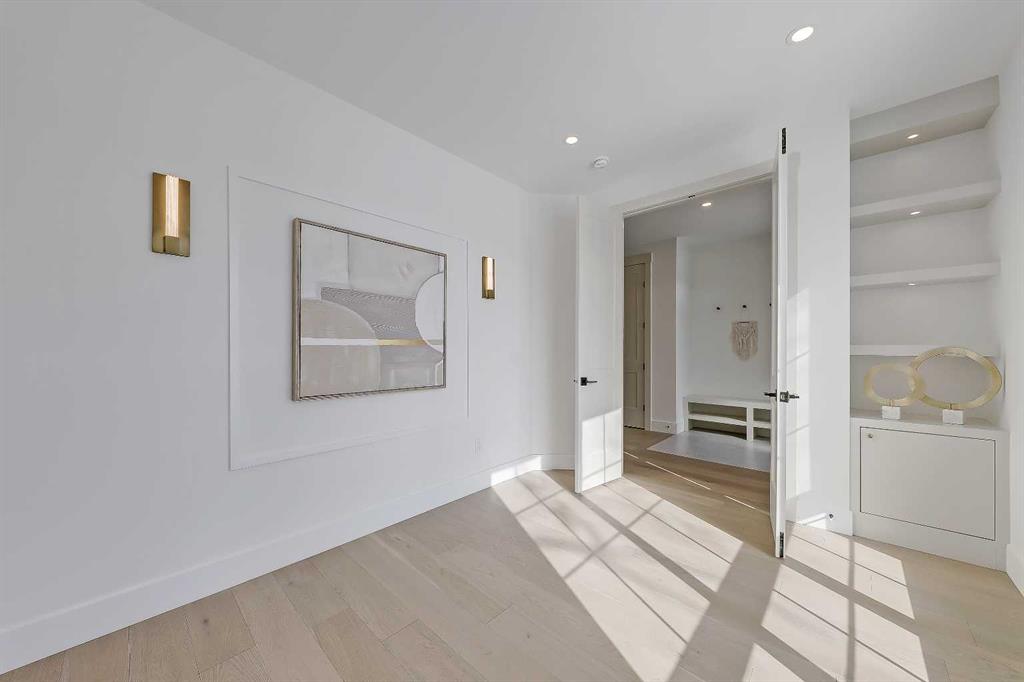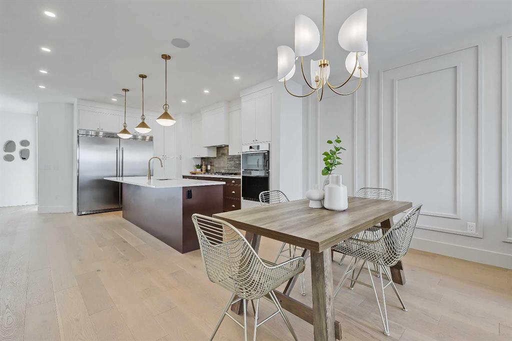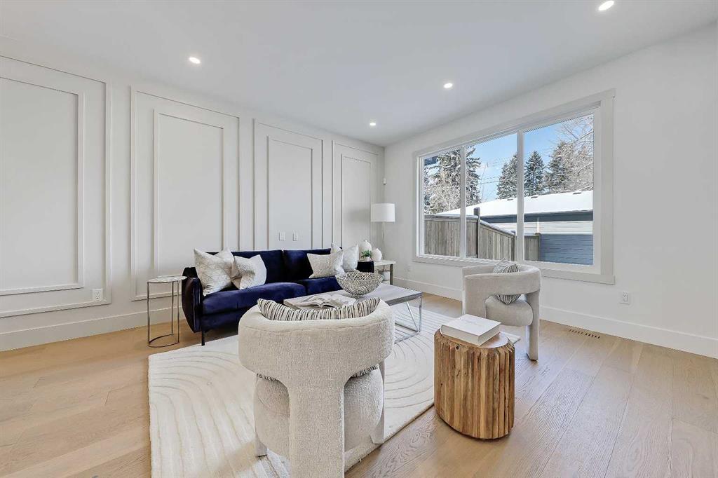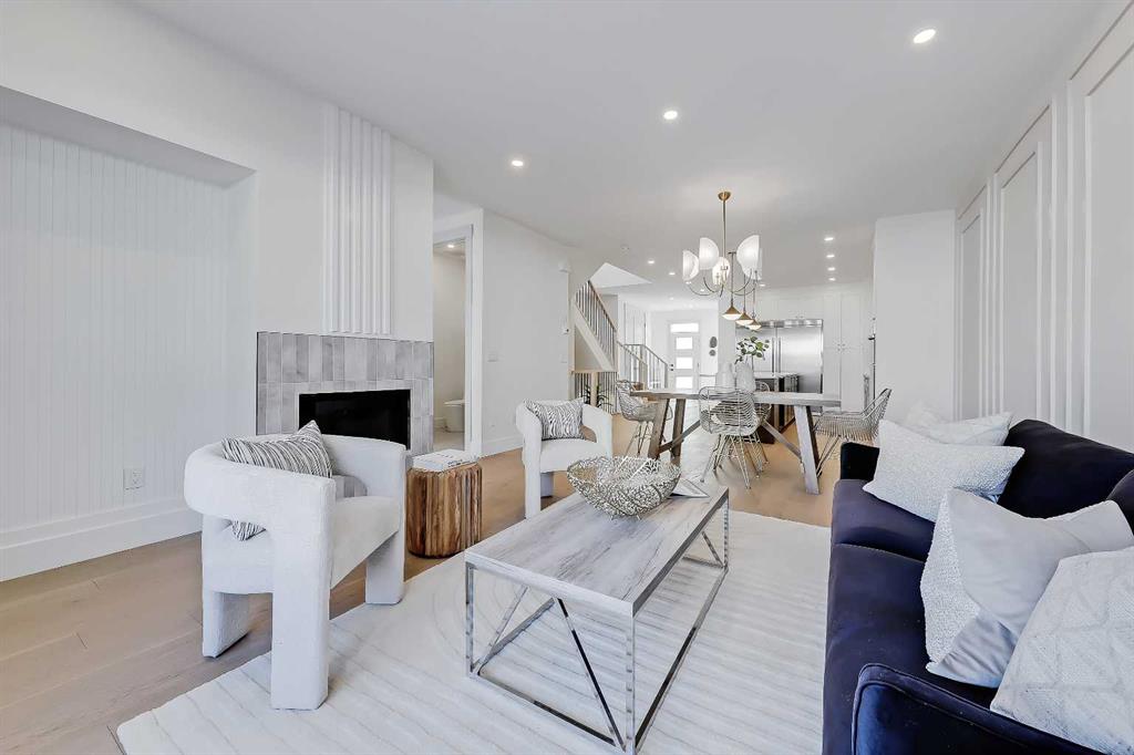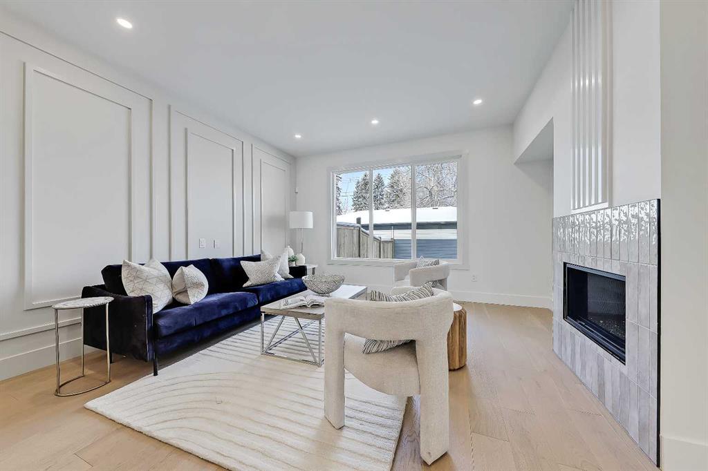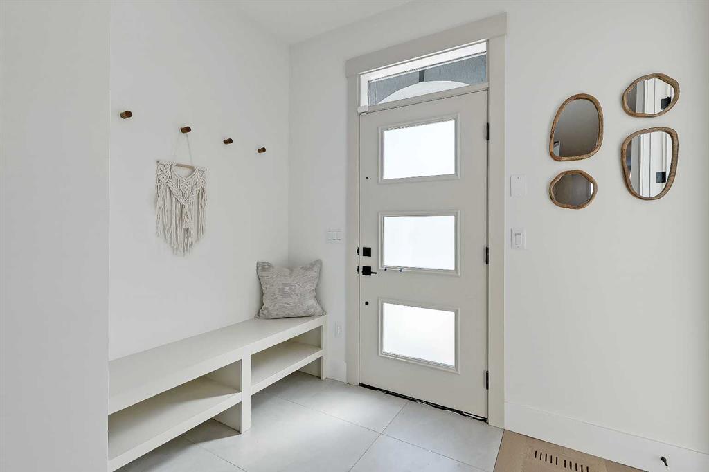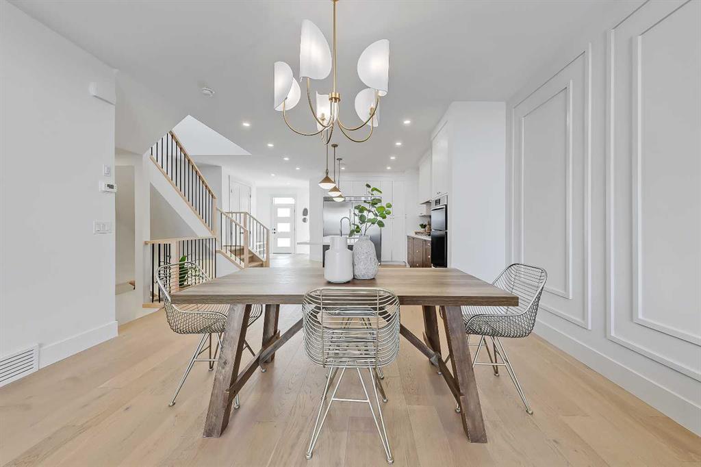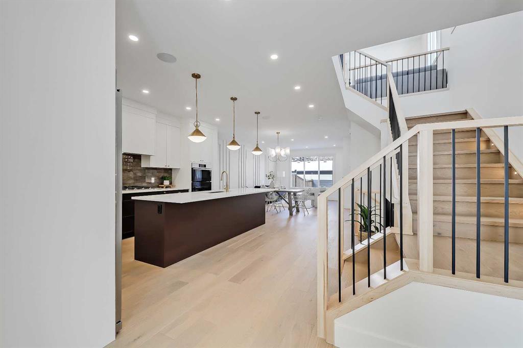 The light-filled foyer opens to a versatile office space with tasteful lighting selections, perfect for working from home or creating a quiet reading area. As you move inside, the layout is bright and open, complete with curated finishes and beautiful lighting selections. The kitchen includes a large island which offers plenty of room for gathering. Quartz countertops, full height cabinetry, designer backsplash, and sleek gold hardware bring a refined look. High-end appliances and smart storage make the kitchen as practical as it is stylish. Large rear windows fill the space with light connecting the indoors to the outdoors. The dining area and living room have lovely architectural wall details as seen throughout the home. The living room also includes a gas fireplace, adding comfort to the space along with sleek tiles. At the back of the home, you will find the mudroom with bench seating and more stunning wall details. A conveniently placed power room with designer lighting finishes off this level.