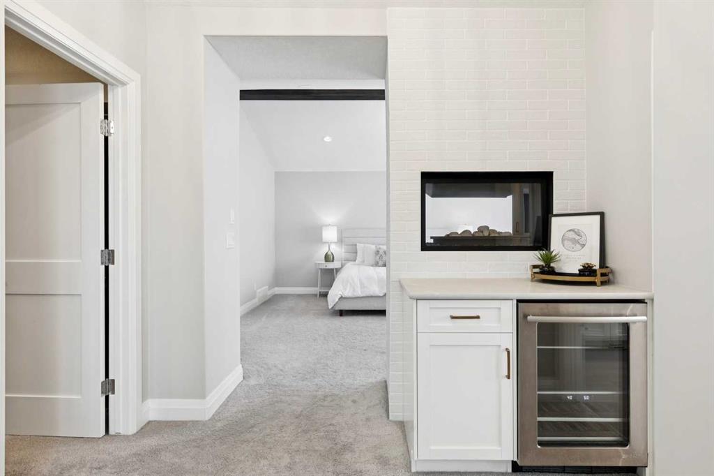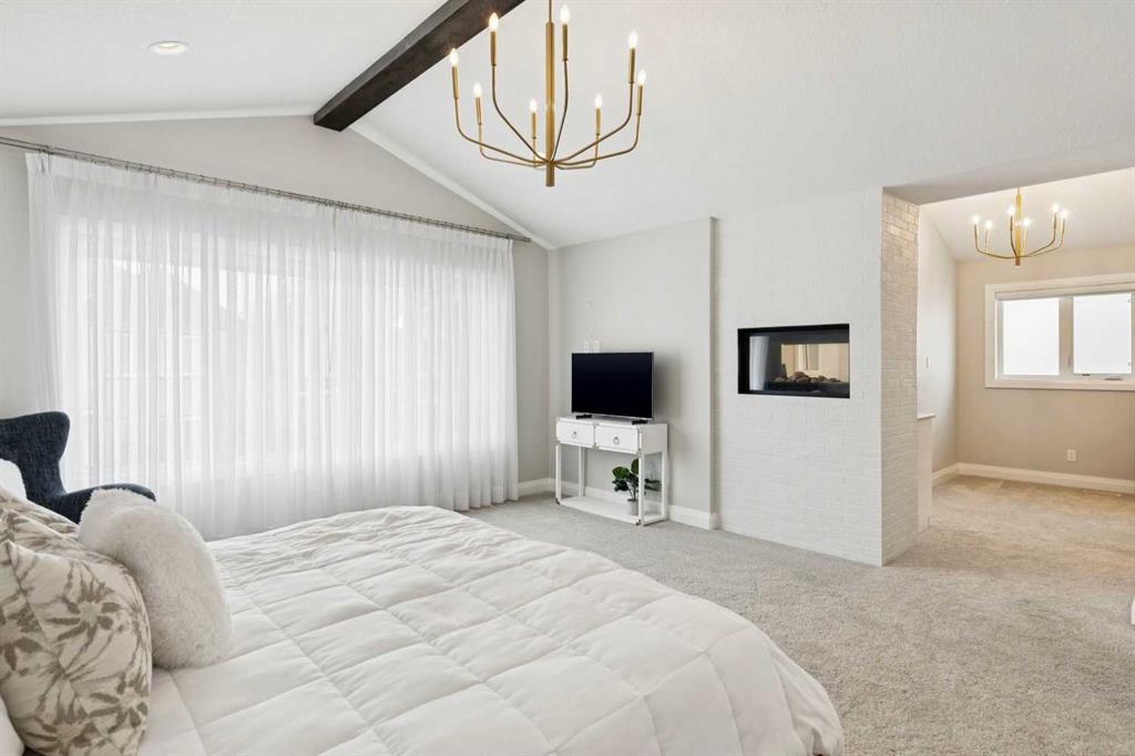 Upstairs, soaring ceilings and skylights continue the sense of openness. The primary retreat is expansive, featuring vaulted ceilings, large west-facing windows, and an additional double-sided gas fireplace that adds warmth and character. A private lounge area with built-in bar creates separation within the suite, offering both scale and privacy. The spa-like ensuite includes heated floors, a freestanding soaker tub, and a beautifully designed oversized shower that feels more like a private retreat than a typical bathroom. The generous walk-in closet offers extensive custom storage and connects directly to the laundry room for everyday convenience.
