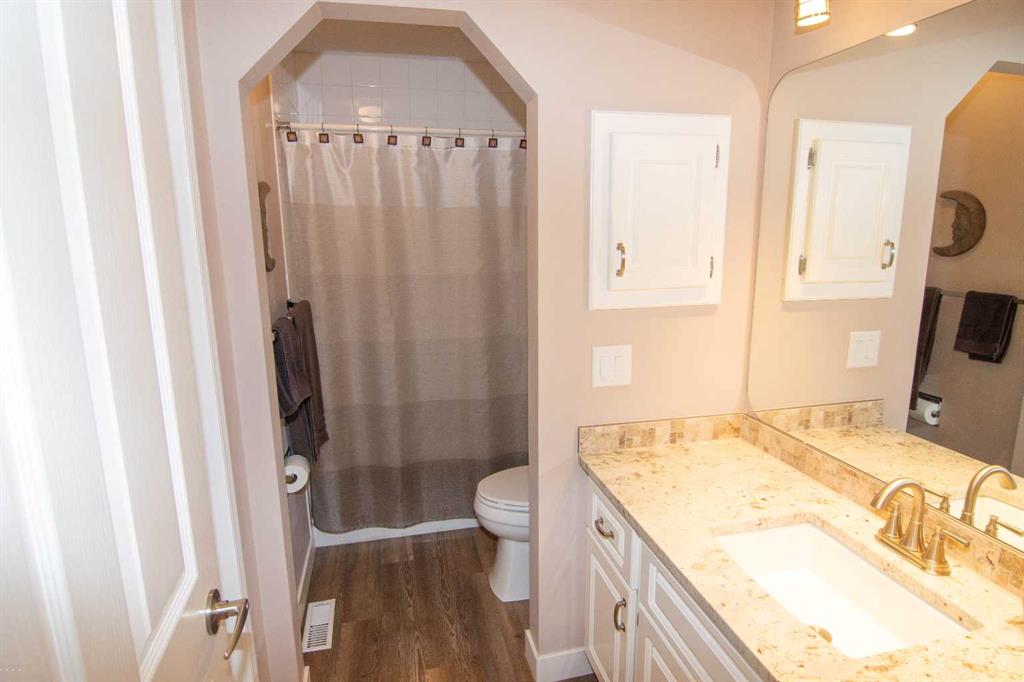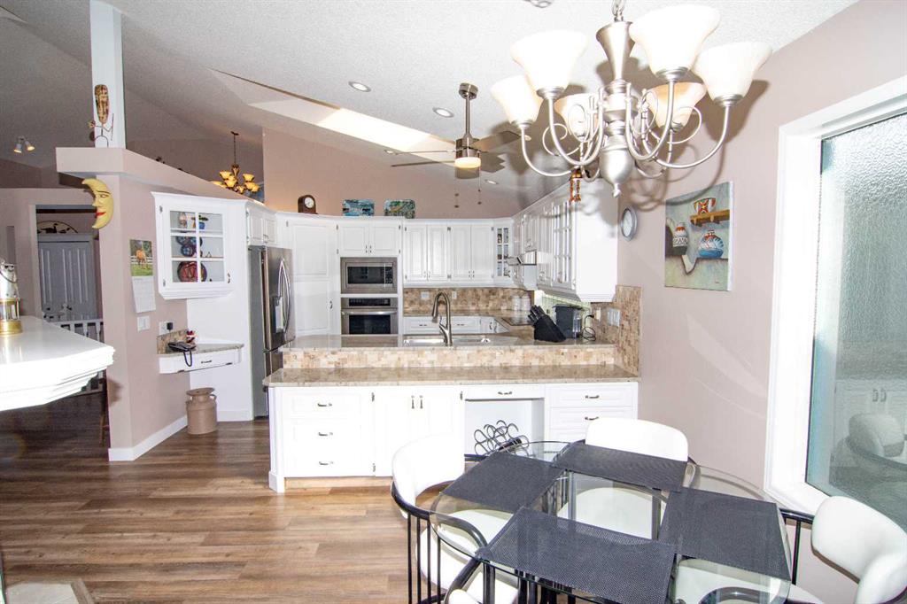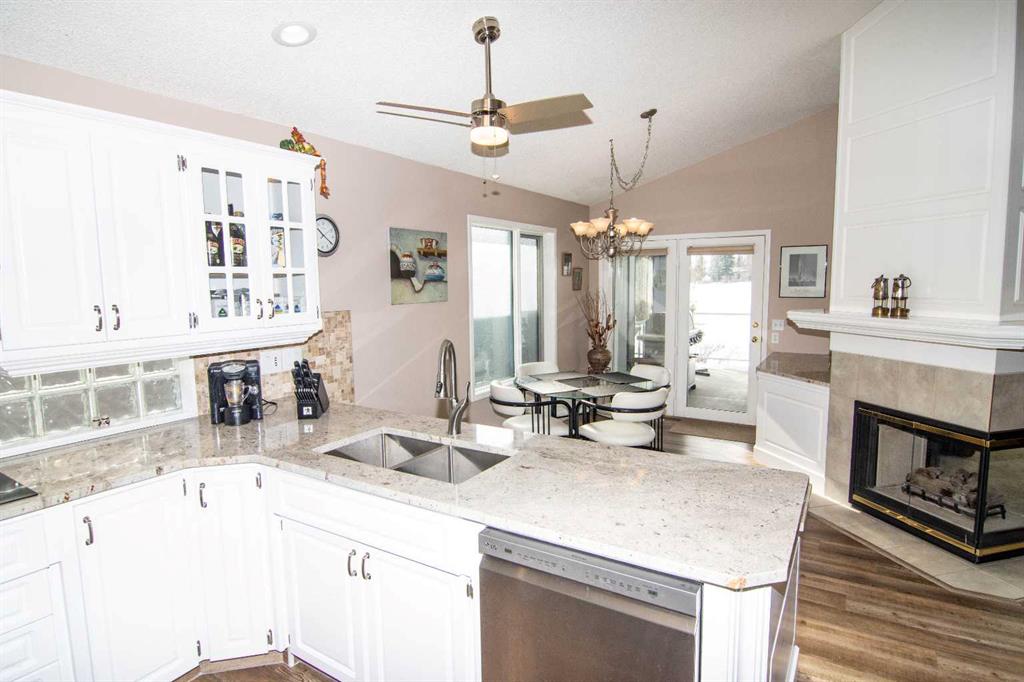 Welcome to this custom built, fully developed, walkout, bungalow that backs onto Valley Ridge Golf Course. This beautiful home features, large open front entry, large dining room, spacious living room with beautiful south facing views of the golf course, 3 sided fireplace. Fully renovated white kitchen with built in ovens, stainless appliances, corner pantry, lots of cabinets and great counter space. Kitchen eating area has access to wrap around deck. The main floor also boasts den/bedroom, laundry with access to heated 2 car garage, huge master bedroom with 6 pc. ensuite and walk in closet. The lower walk out level offers huge family room with large windows, fireplace, 2 additional bedrooms, 2 pc. bathroom and storage area, all with inslab heating. The yard is beautifully landscaped. Close to all pathways and playgrounds with quick access to the mountains and Banff. This home is a must view. 43 Valley Ridge Green NW.