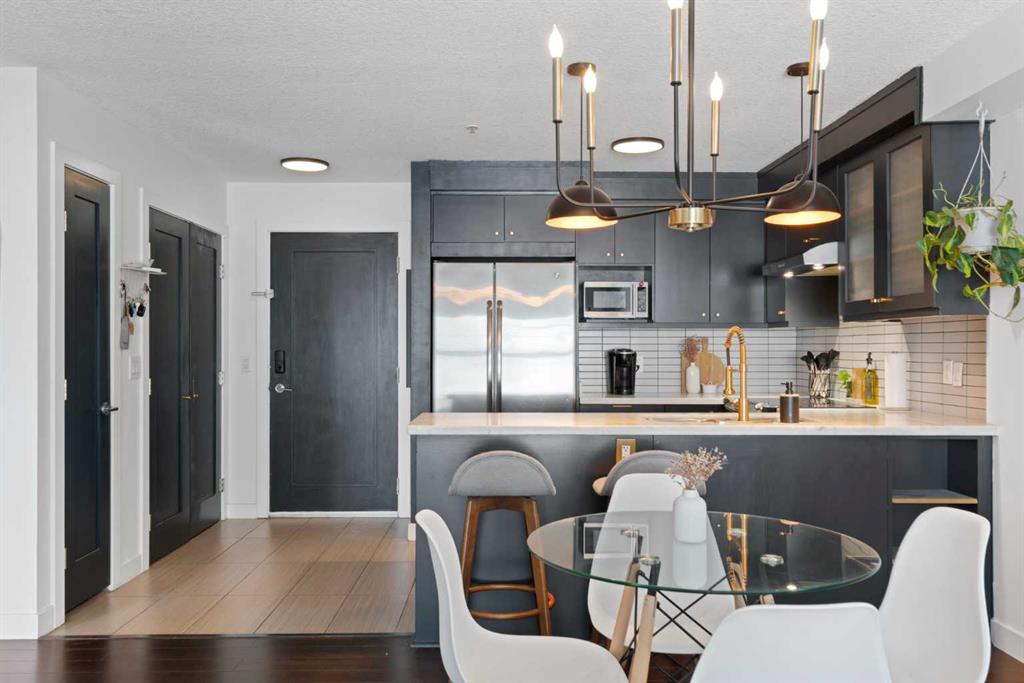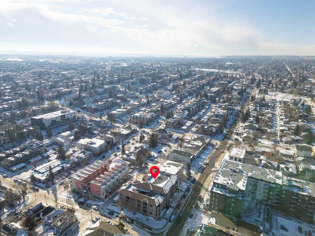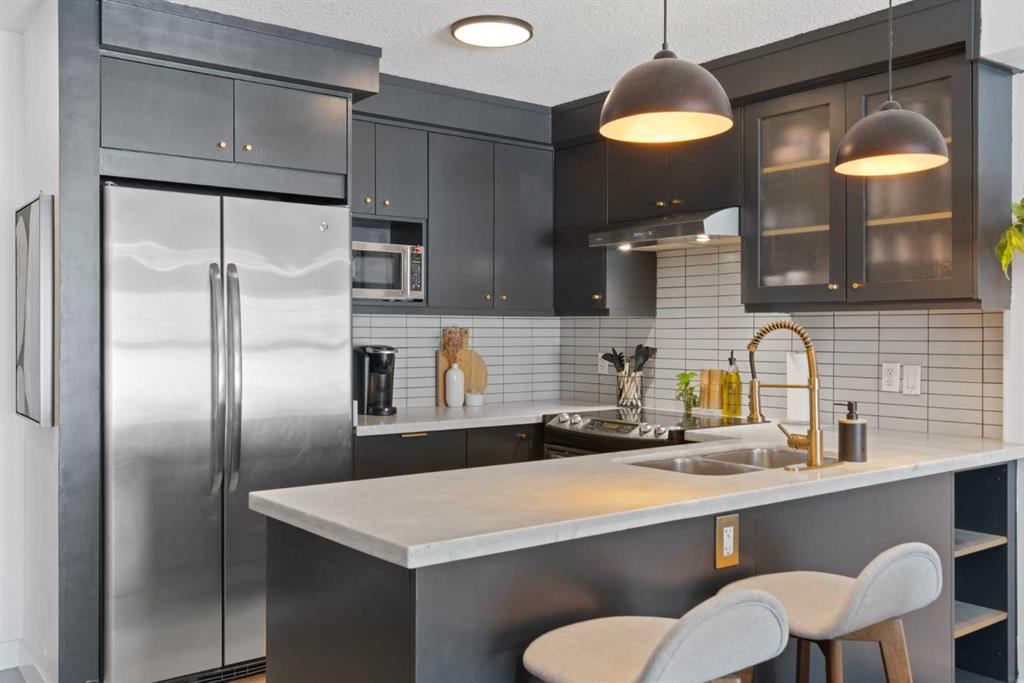 Welcome to this beautifully upgraded condo in one of Calgary's most sought-after inner-city neighbourhoods. Thoughtfully designed with a modern open-concept layout, this home immediately impresses with rich hardwood floors, soaring windows that flood the space with natural light, and a cozy gas fireplace that anchors the living room.