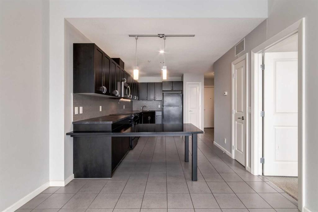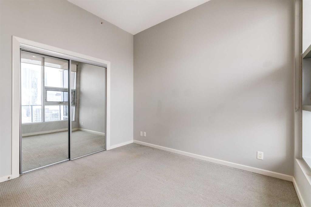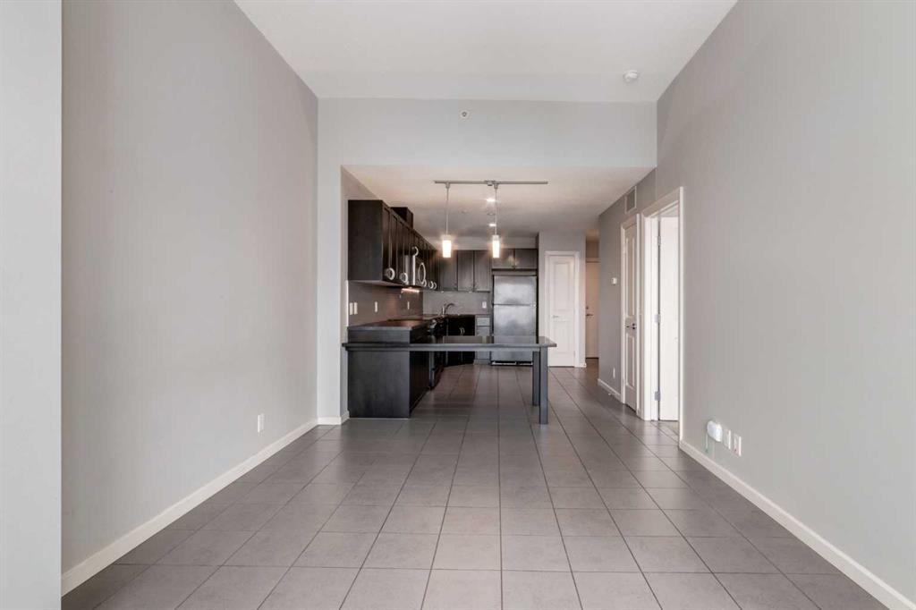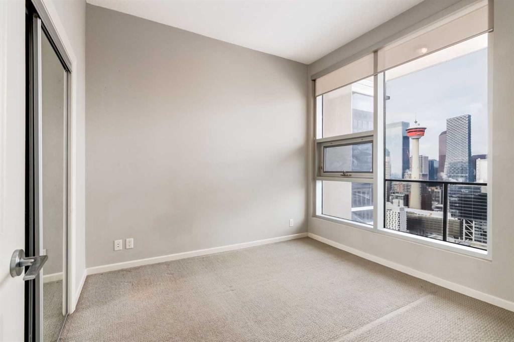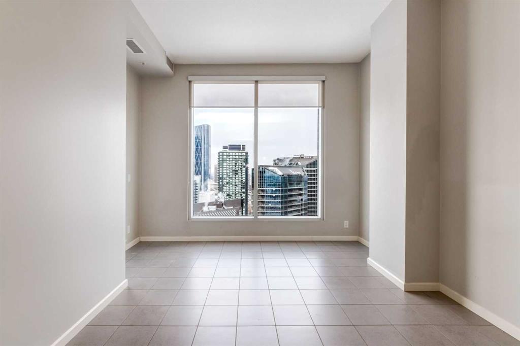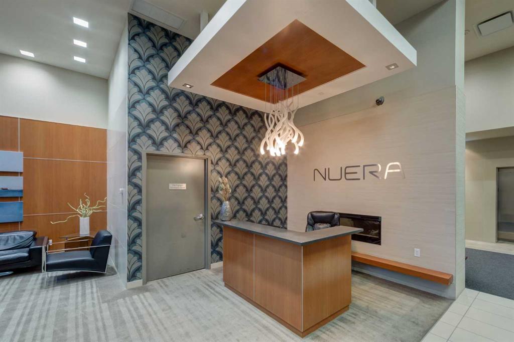 Spectacular Downtown Skyline Views from the 27th Floor! Welcome to this stylish 1-bedroom, 1-bathroom condo offering 589 sq. ft. of modern living space in the desirable Nuera building. Perched on the 27th floor, this home showcases breathtaking 180-degree downtown skyline views, including the Calgary Tower, through stunning floor-to-ceiling windows. The open-concept layout is bright and functional, seamlessly connecting the living and dining areas. The contemporary kitchen features mocha-stained maple cabinetry, mosaic tile backsplash, under-cabinet lighting, and built-in dining table that doubles as a workspace. Step onto your private balcony to enjoy the vibrant city views, or wake up to the skyline from the spacious primary bedroom. Additional highlights include in-suite laundry, a storage locker, and a titled heated underground parking stall. Nuera offers a fully equipped fitness centre and smart HVAC air circulation technology. Ideally located steps from downtown, the BMO Centre, LRT, and the shops and restaurants of 17th Avenue, this home delivers the ultimate inner-city lifestyle.