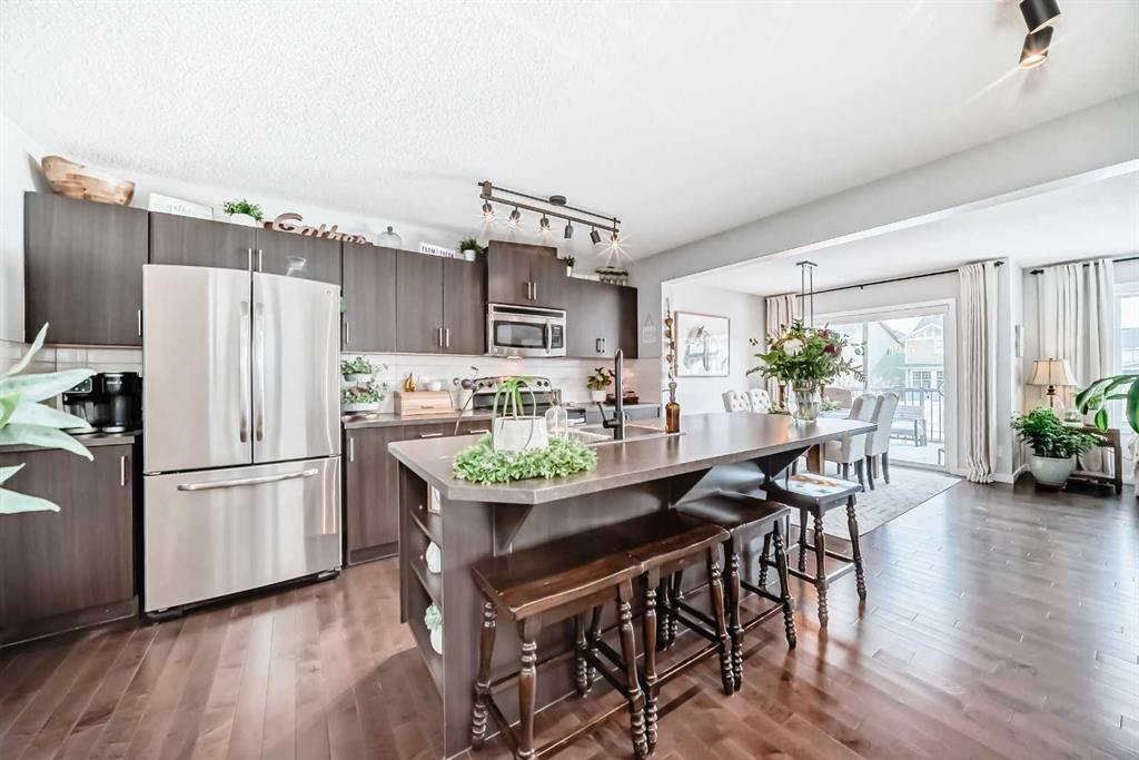 The main floor is designed to maximize light and style, featuring gleaming hardwood floors and a sparkling kitchen. This culinary space is a standout, boasting modern dark cabinetry, premium stainless steel appliances, a massive centre island, and a huge walk-in corner pantry for effortless organization. The adjacent dining area leads directly to the east-facing deck, the perfect vantage point for enjoying peaceful morning sunrises.