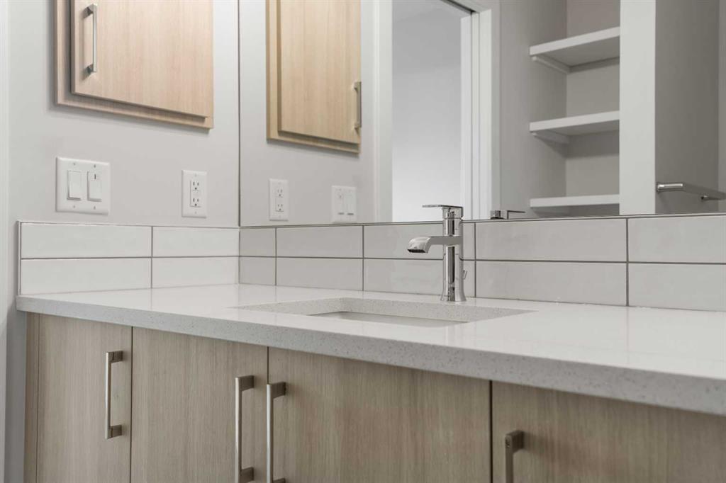 On the main floor, nine-foot ceilings and an open-concept layout create a bright and welcoming atmosphere. The kitchen is appointed with quartz countertops and stainless steel appliances, combining style and practicality for both everyday living and entertaining. From the main living area, you can step onto the private front deck overlooking green space and pathways, offering a peaceful setting for your morning coffee or evening relaxation.