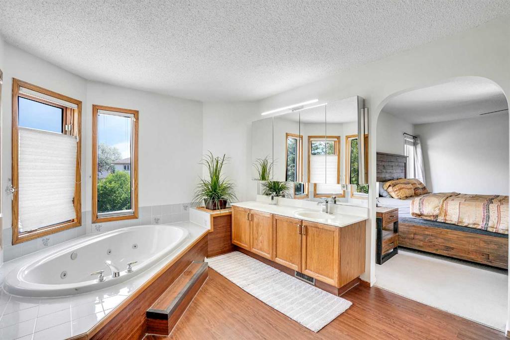 A curved staircase leads to the upper level, where the massive primary suite features a luxurious ensuite with corner jacuzzi tub, separate shower, vanity, and a huge walk-in closet. Two additional generously sized bedrooms and a full bathroom complete the upper floor.