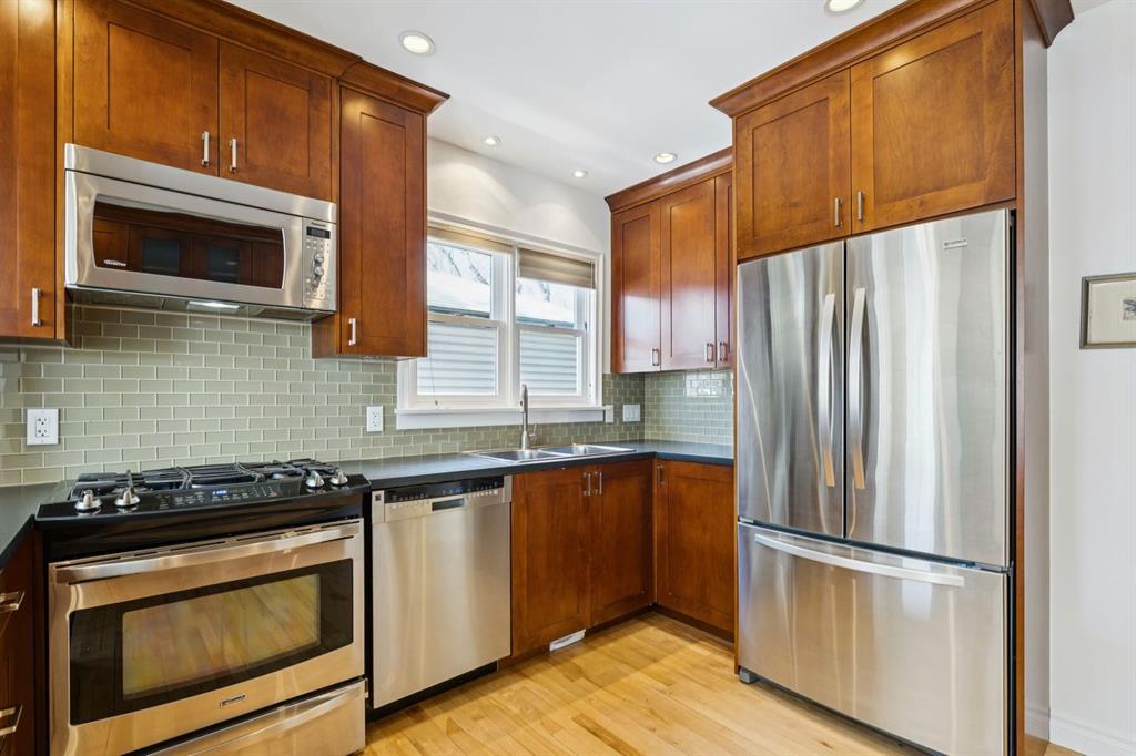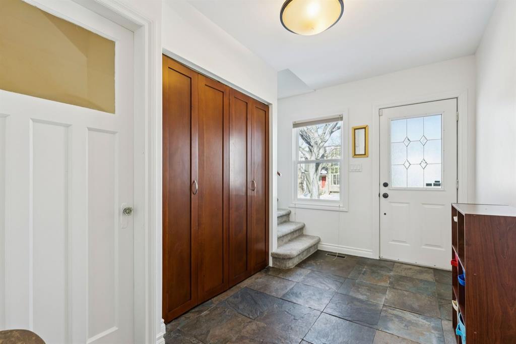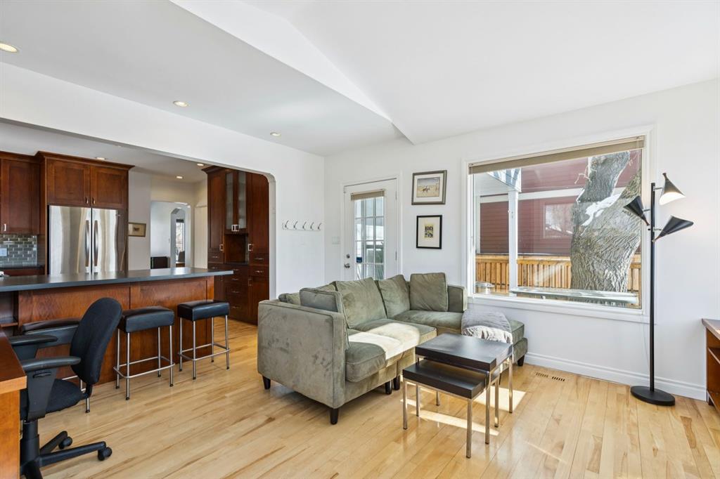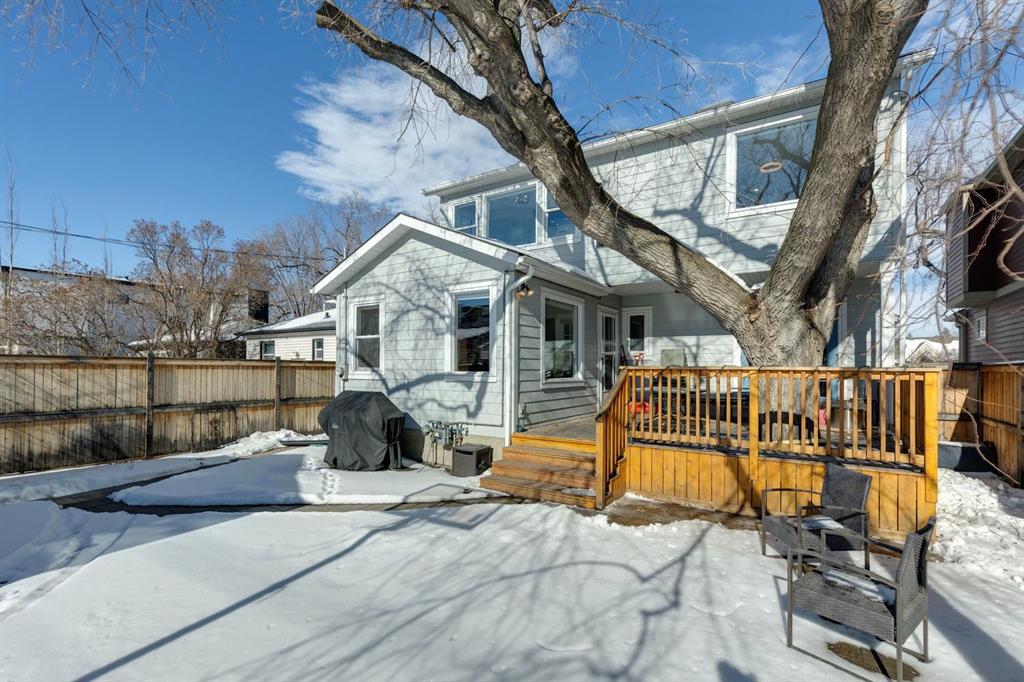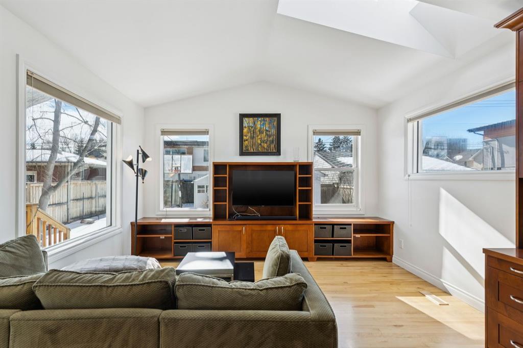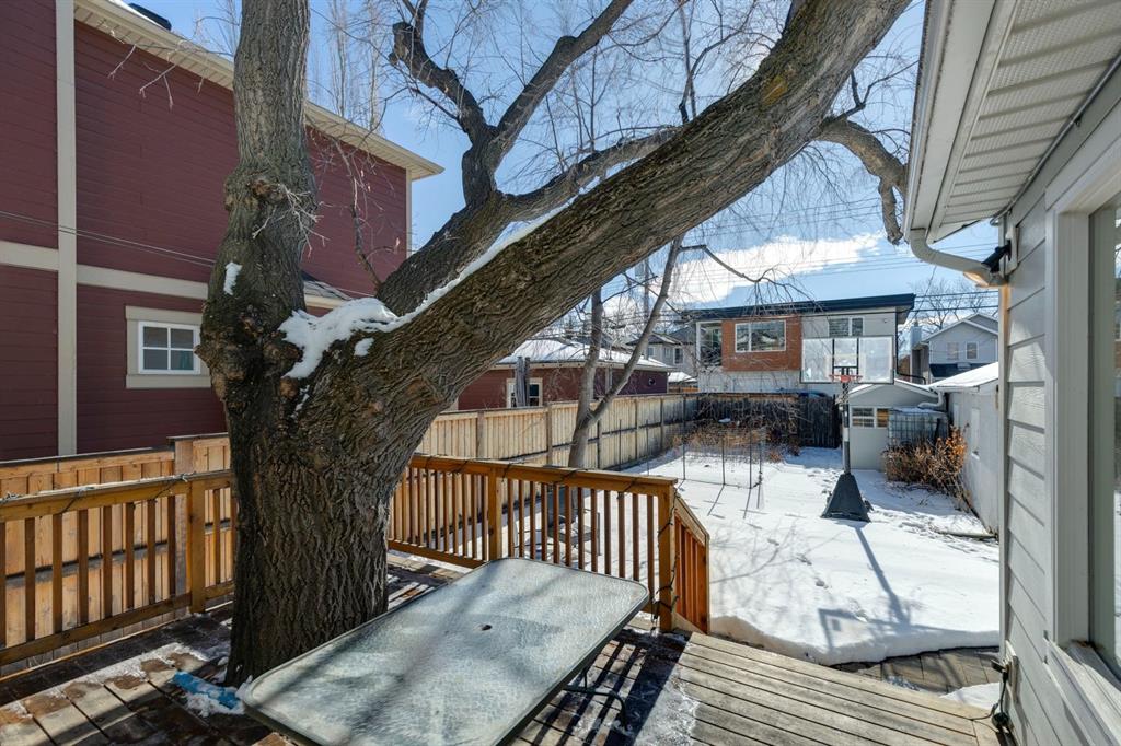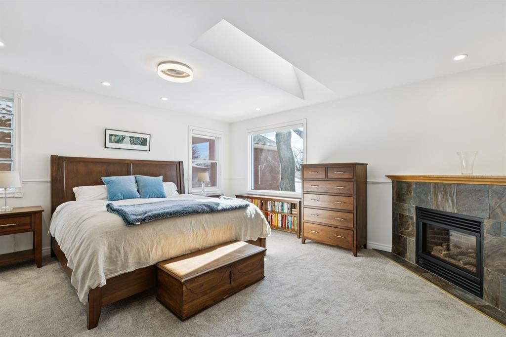 Tucked away on a quiet, tree lined street in a prime central location, this rare and charming home offers the perfect blend of character, comfort, and extensive modern renovations. From the moment you arrive, the beautiful curb appeal draws you in with a brick walkway and welcoming front porch, setting the tone for what awaits inside. A spacious slate tiled foyer opens to hardwood floors throughout the main level, where the bright and inviting living room features elegant archways leading to the dining room and french doors that open onto a large rear deck, thoughtfully designed around a mature tree to preserve nature and enhance the serene setting. The modern kitchen showcases rich cherry cabinetry, laminate counters, a glass tile backsplash, eat up peninsula, and stainless steel appliances, including a gas stove, making it both stylish and functional. A stunning family room boasts vaulted ceilings, a skylight, custom built-in media centre, built-in desk, and walls of windows that flood the space with natural light while providing direct access to the expansive south facing backyard and deck. Upstairs, plush carpet leads to three bedrooms including a spectacular primary retreat featuring a corner gas fireplace, large windows, and its own skylight. The luxurious 5pc ensuite offers a jetted tub, heated floors, glass enclosed shower with rainfall shower head, dual closets, and an abundance of natural light. The other two bedrooms share a modern 3pc bath and a convenient stacked laundry area complete the upper level. The lower level offers a separate entrance and presents cork tile flooring, a massive storage area with cold room, and spacious rec room with another corner gas fireplace. A fourth bedroom currently designed as a home office, and an additional 3pc bathroom finish the lower level offering a great space for families. Additional highlights include a tankless hot water, a Home nuvoH2O water softening system, and a large south exposed backyard with mature trees, garden space, green lawn, brick pathway to the single detached garage, and an additional shed. Located in the highly sought after Mount Pleasant community, residents enjoy a vibrant inner city lifestyle with easy access to downtown, schools, parks, playgrounds, public transit, and the Mount Pleasant Community Sportsplex, along with trendy cafés and local shops, all while benefiting from the charm and tranquility of a well established neighbourhood. Come see this gem and get ready to make this house your "home."