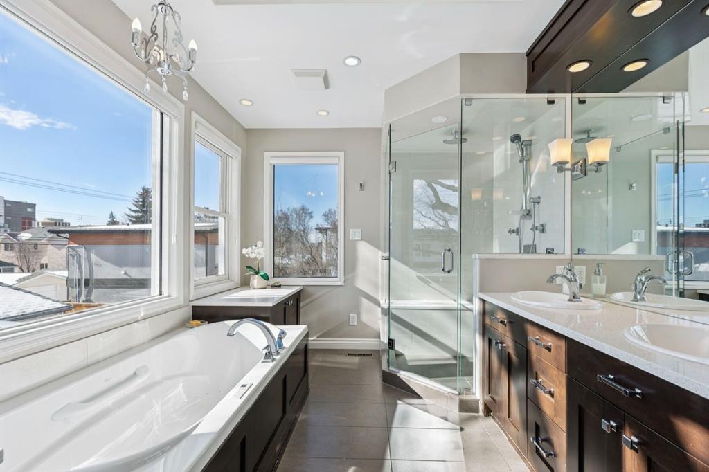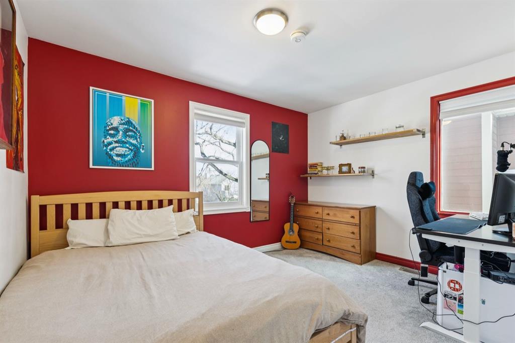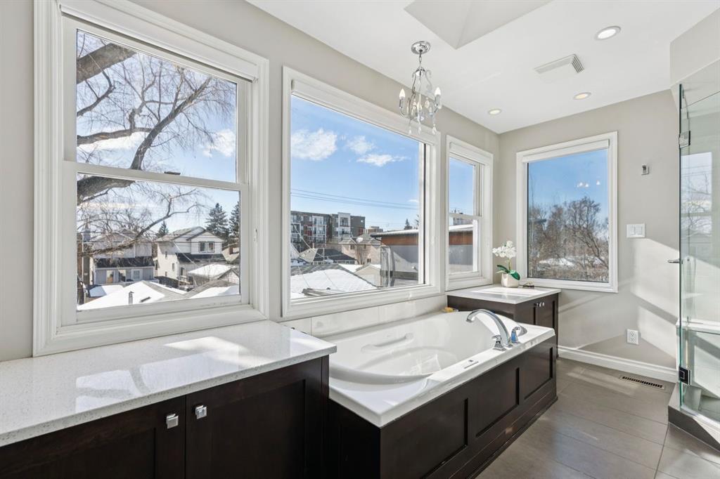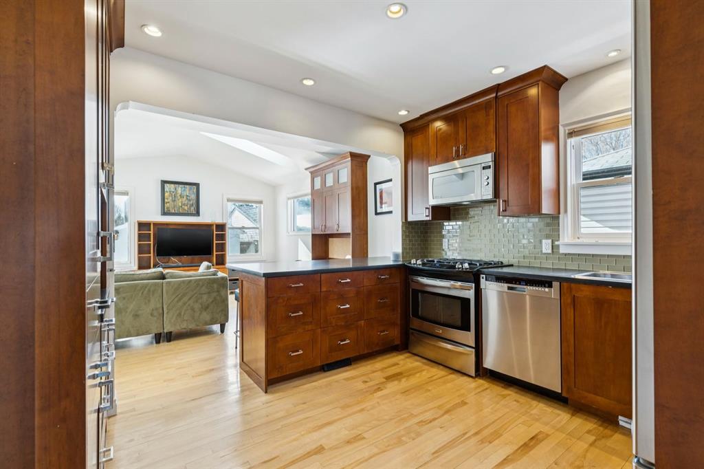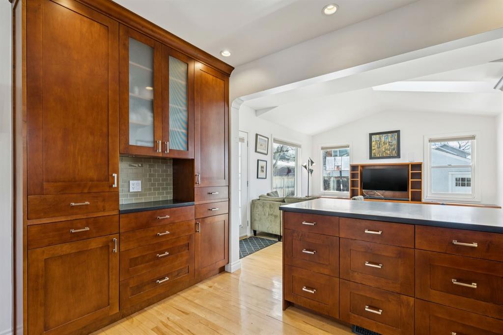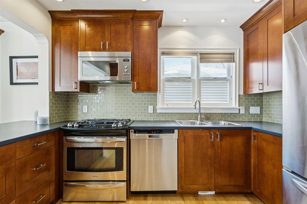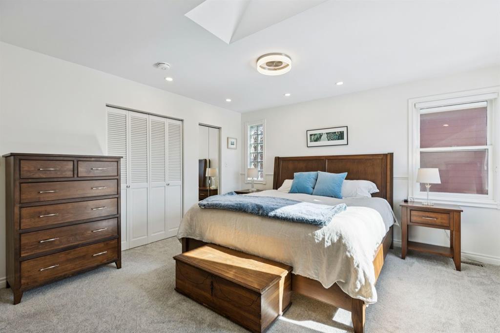 Tucked away on a quiet, tree lined street in a prime central location, this rare and charming home offers the perfect blend of character, comfort, and extensive modern renovations. From the moment you arrive, the beautiful curb appeal draws you in with a brick walkway and welcoming front porch, setting the tone for what awaits inside. A spacious slate tiled foyer opens to hardwood floors throughout the main level, where the bright and inviting living room features elegant archways leading to the dining room and french doors that open onto a large rear deck, thoughtfully designed around a mature tree to preserve nature and enhance the serene setting. The modern kitchen showcases rich cherry cabinetry, laminate counters, a glass tile backsplash, eat up peninsula, and stainless steel appliances, including a gas stove, making it both stylish and functional. A stunning family room boasts vaulted ceilings, a skylight, custom built-in media centre, built-in desk, and walls of windows that flood the space with natural light while providing direct access to the expansive south facing backyard and deck. Upstairs, plush carpet leads to three bedrooms including a spectacular primary retreat featuring a corner gas fireplace, large windows, and its own skylight. The luxurious 5pc ensuite offers a jetted tub, heated floors, glass enclosed shower with rainfall shower head, dual closets, and an abundance of natural light. The other two bedrooms share a modern 3pc bath and a convenient stacked laundry area complete the upper level. The lower level offers a separate entrance and presents cork tile flooring, a massive storage area with cold room, and spacious rec room with another corner gas fireplace. A fourth bedroom currently designed as a home office, and an additional 3pc bathroom finish the lower level offering a great space for families. Additional highlights include a tankless hot water, a Home nuvoH2O water softening system, and a large south exposed backyard with mature trees, garden space, green lawn, brick pathway to the single detached garage, and an additional shed. Located in the highly sought after Mount Pleasant community, residents enjoy a vibrant inner city lifestyle with easy access to downtown, schools, parks, playgrounds, public transit, and the Mount Pleasant Community Sportsplex, along with trendy cafés and local shops, all while benefiting from the charm and tranquility of a well established neighbourhood. Come see this gem and get ready to make this house your "home."