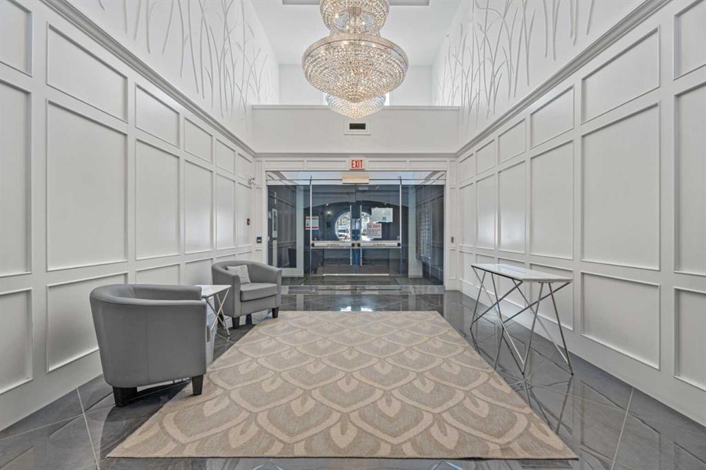 The Georgian-inspired Riviera building showcases a stunning lobby with 20’ coffered ceilings and elegant chandeliers, and the unit includes titled underground parking and an assigned storage locker.