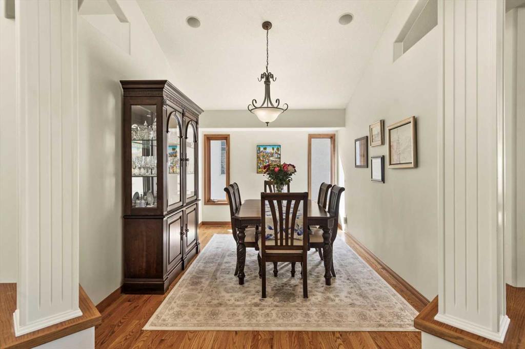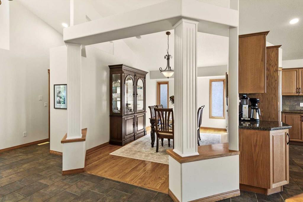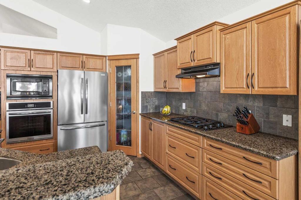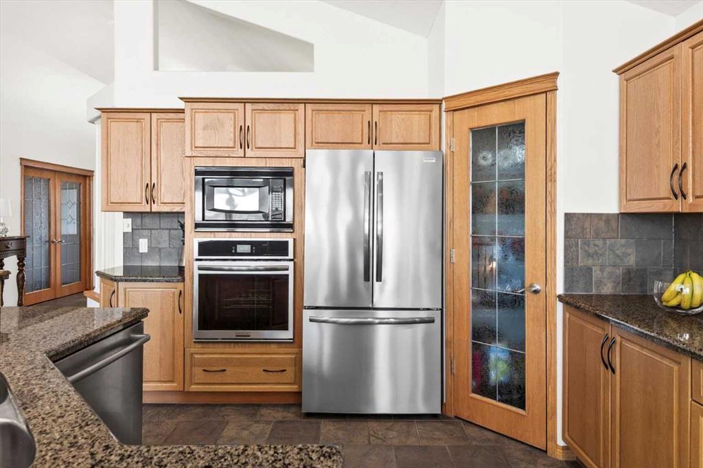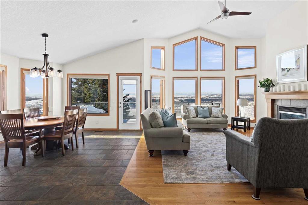 The spacious entry flows into the open-concept main floor and features a light, neutral interior that enhances the spacious feel of the home. Off the entry is a separate home office or den with French doors for privacy. Opposite the office is the main floor laundry and mud room with lots of storage space and access to the oversized double car garage. The elegant, formal dining room is a perfect location for hosting small or large gatherings. Floor to ceiling windows and soaring high ceilings flood the space with natural light, creating an inviting and airy ambiance. A central fireplace in the living room offers warmth and coziness, perfect for cooler evenings. Sliding doors lead out to a deck, where you can enjoy the stunning views while sipping your morning coffee or hosting gatherings. The chef-inspired kitchen is outfitted with high-end stainless steel appliances, granite countertops, and a large island for additional workspace. New refrigerator, oven, washer and dryer this year and dishwasher 2024. A walk-in pantry provides ample storage, while the adjacent dining area flows effortlessly into the living room, making it perfect for both intimate dinners and entertaining larger groups.