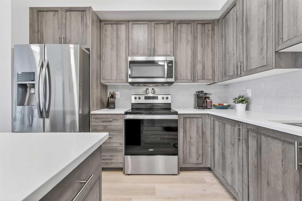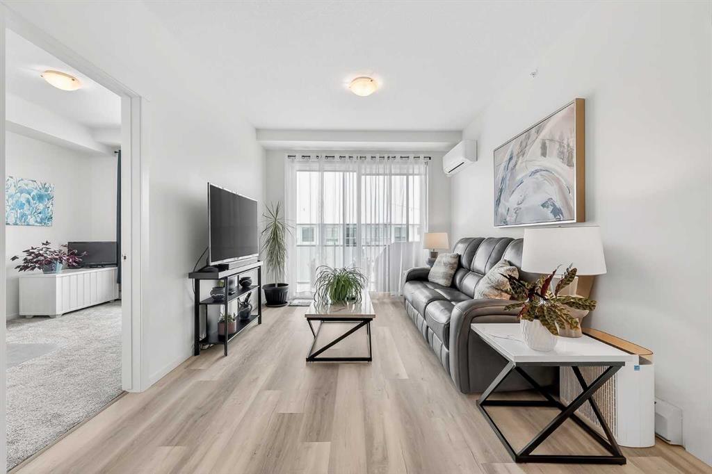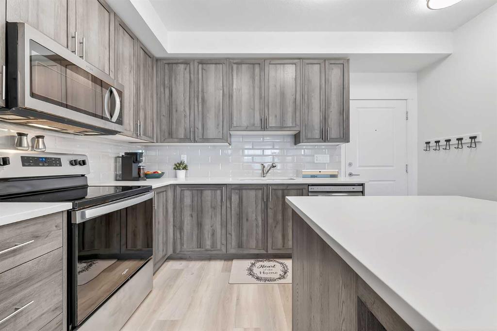Prepare to be impressed! This stunning 3 bedroom, 2 bathroom, top floor condo offers luxurious living in highly desirable Sage Hill Park II. Step inside and be greeted by the elegance of luxury vinyl plank flooring that flows seamlessly through the bright and open main area. The heart of the home is the stunning kitchen, featuring upgraded stainless steel appliances, sleek quartz countertops, ample stylish cabinetry, double pantry, and a large inviting island- perfect for entertaining! The kitchen effortlessly transitions into the sun drenched living room, creating an ideal space for relaxation and gatherings. The patio is nothing short of amazing, it's huge! Enjoy covered outdoor living with 265 ft2 of private space in sunny south exposure. Retreat to the generously sized primary bedroom, complete with a well organized walk-in closet, and private ensuite bathroom. The thoughtfully separated 2nd bedroom is also a great size, and has a walk through closet leading into the 2nd full bathroom. There is even a 3rd bedroom, lots of space for the whole family! Stay comfortable year round with air conditioning in the summer, and keep your car warm in the winter in the heated underground parking. This unit also comes with an additional outdoor parking stall, convenient! Added bonus of a separate storage locker for your extra and seasonal belongings. Beyond the exceptional features of the unit, this complex is in a prime location that sides onto a picturesque pond and endless walking trails- perfect for enjoying the outdoors. You'll also appreciate the close proximity to a variety of shopping and dining options, public transportation, major roadways, and much more! Don't miss the opportunity to make this exceptional condo your own. Call your favorite realtor to book a showing today, you won't be disappointed!