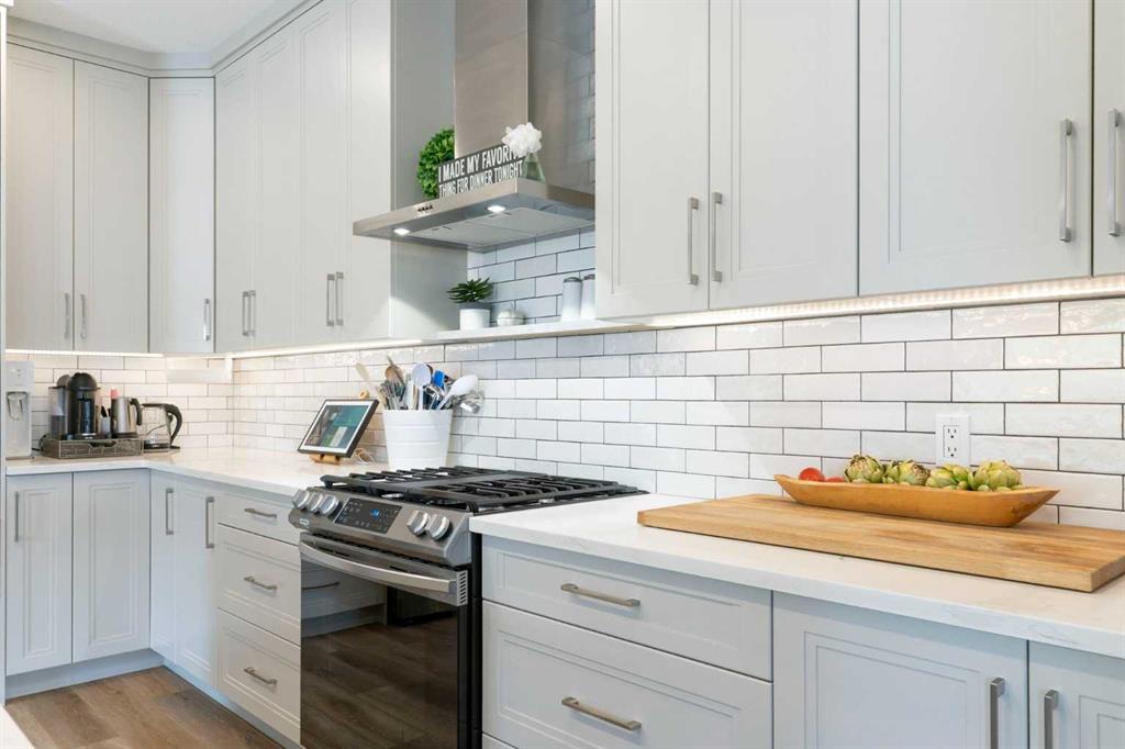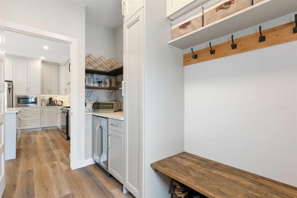 The kitchen is designed to impress, featuring full height soft grey cabinetry with undermount lighting, quartz countertops, stainless steel appliances, a gas range, an undermount sink, and a large island with seating for three. Just off the kitchen, the dining nook includes a built-in bench with pull out drawers for added storage and convenience. The living room is anchored by a striking floor to ceiling brick fireplace, while a convenient half bath and functional mudroom help keep daily life organized.