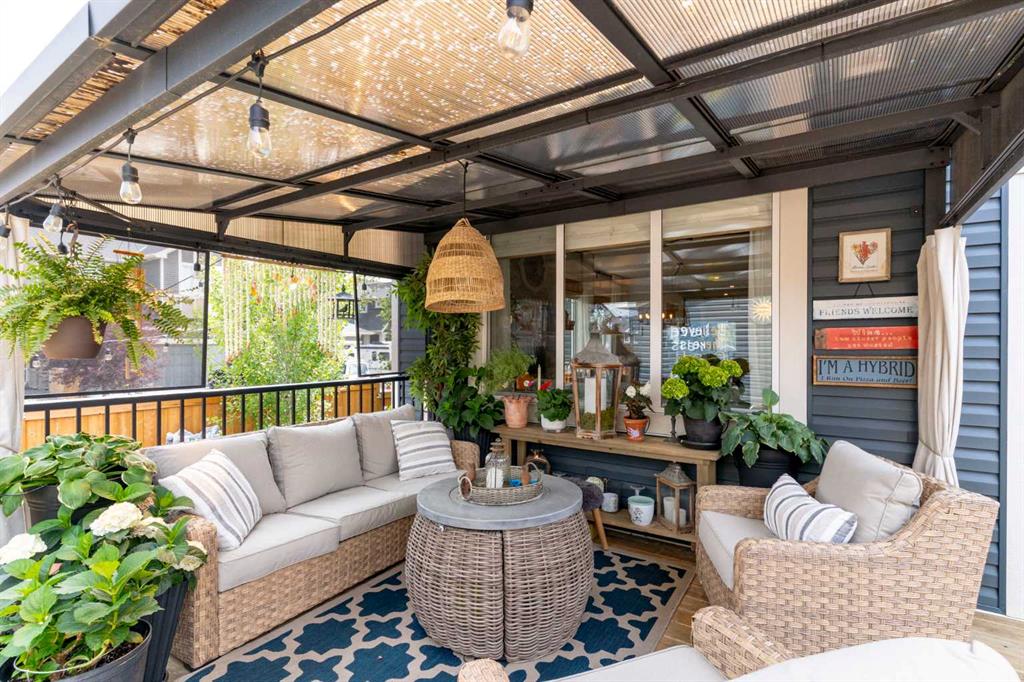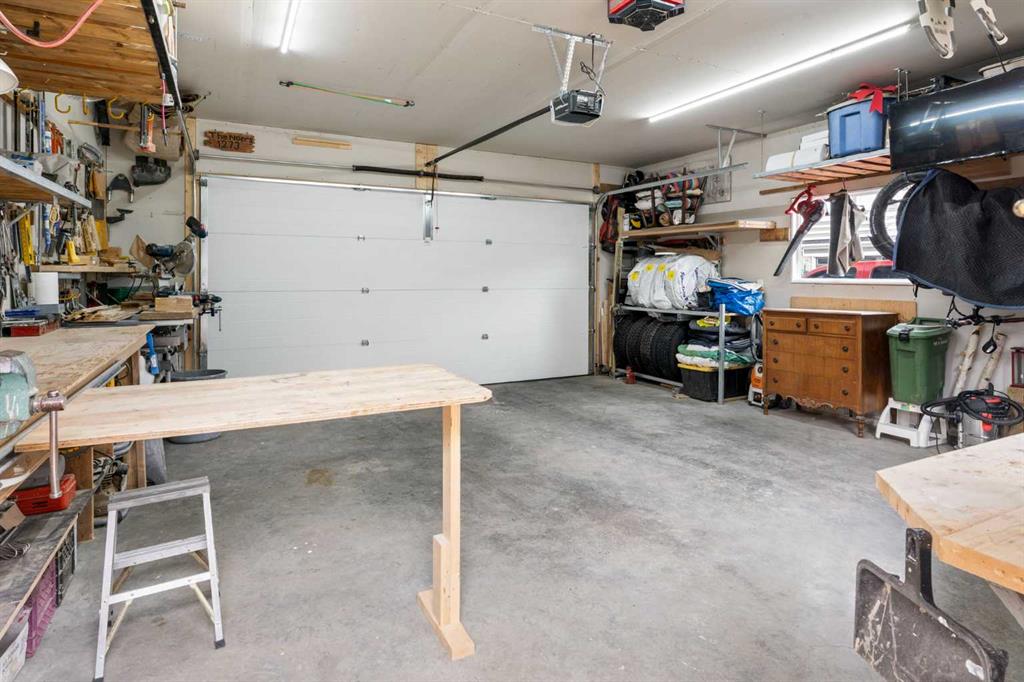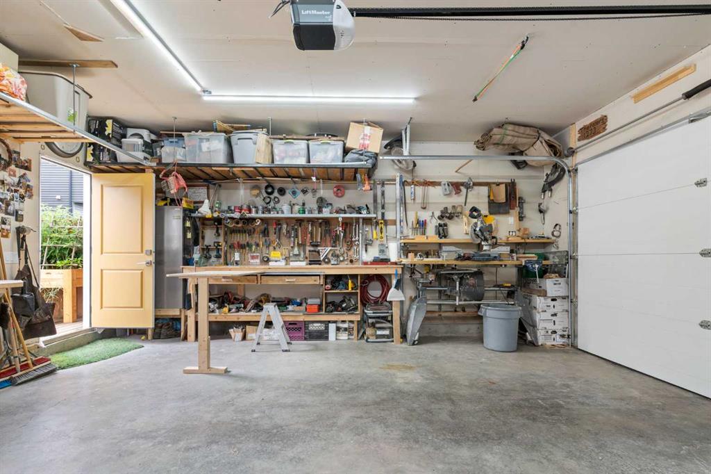 Outside, the fully fenced yard is designed for easy enjoyment. Low maintenance artificial turf eliminates mowing, while an irrigation system services the flowerbeds and planters. Landscape lighting enhances evening ambiance, and a circular gas fire pit creates a natural gathering space. The detached 22' × 22' garage features high ceilings, two large windows, 30-amp 120/240-volt service, a 240-volt heater, overhead storage racks, and a built-in workbench, making it ideal for vehicles, hobbies, and storage. The additional gravel parking pad offers excellent flexibility for extra vehicles, a trailer, or RV, with a gate that opens to allow for longer RV parking.