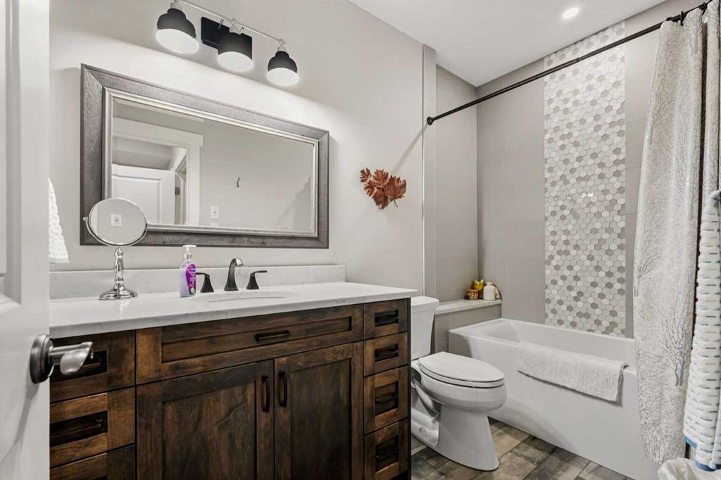 The Walk Out Basement has been professionally developed with permit and is an absolute delight. The family room features large, wetland-facing windows and a beautiful fireplace that would be right at home in a Banff lodge. A custom Oak Wetbar features an exotic leathered granite counter and a perfect space for a work out corner or card table that steps out onto the covered lower patio, which features a second gas line connection. The basement also includes a large guest room and a stunning, top-of-the-line washroom with a fully tiled bath surround a nice deep tub, a quartz ledge, and a stunning custom vanity cabinet.