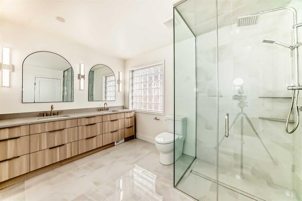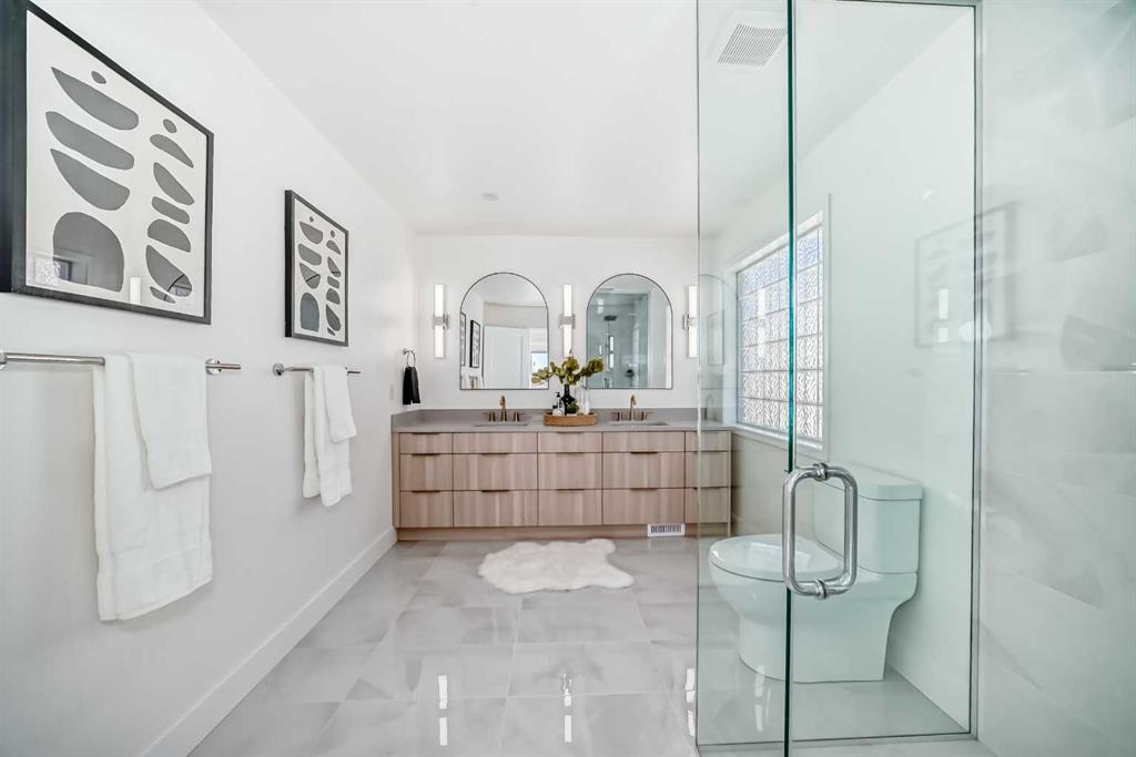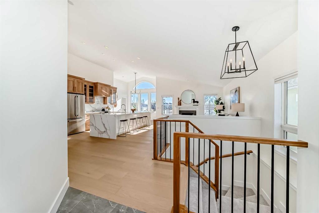 This 3-bed, 3-bath, plus office/den bungalow features brand-new, beautiful custom cabinetry, luxury appliances, a waterfall-edge quartz countertop and backsplash, and a custom pot filler —truly a chef’s dream! Curb-less tiled ensuite shower with custom glass, quartz counters throughout, a wet bar on the lower level, and a brand-new upper patio deck, gorgeous custom-engineered white oak hardwood, with custom tile and carpet.