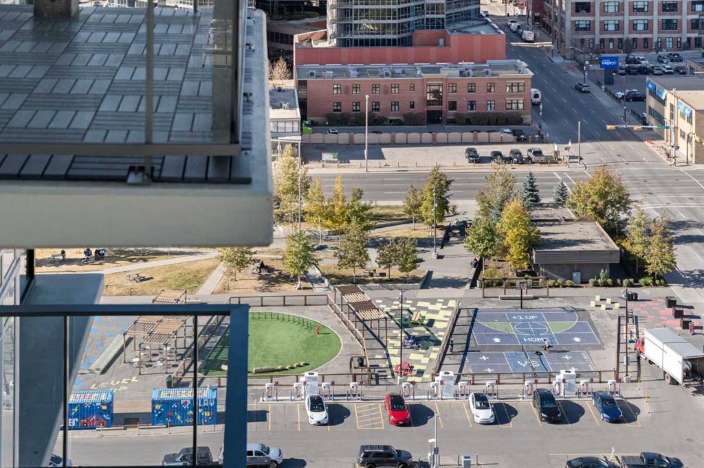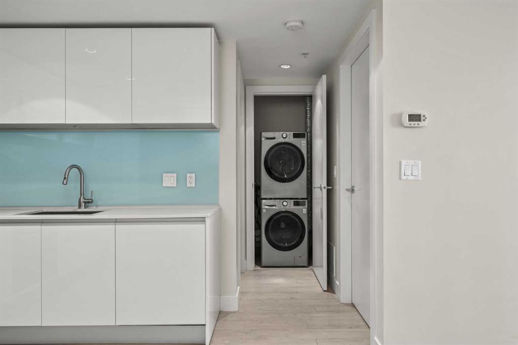 Step out onto the spacious covered balcony and take in vibrant city views and stunning sunsets. Glass railings showcase the Calgary skyline, including the iconic Calgary Tower.