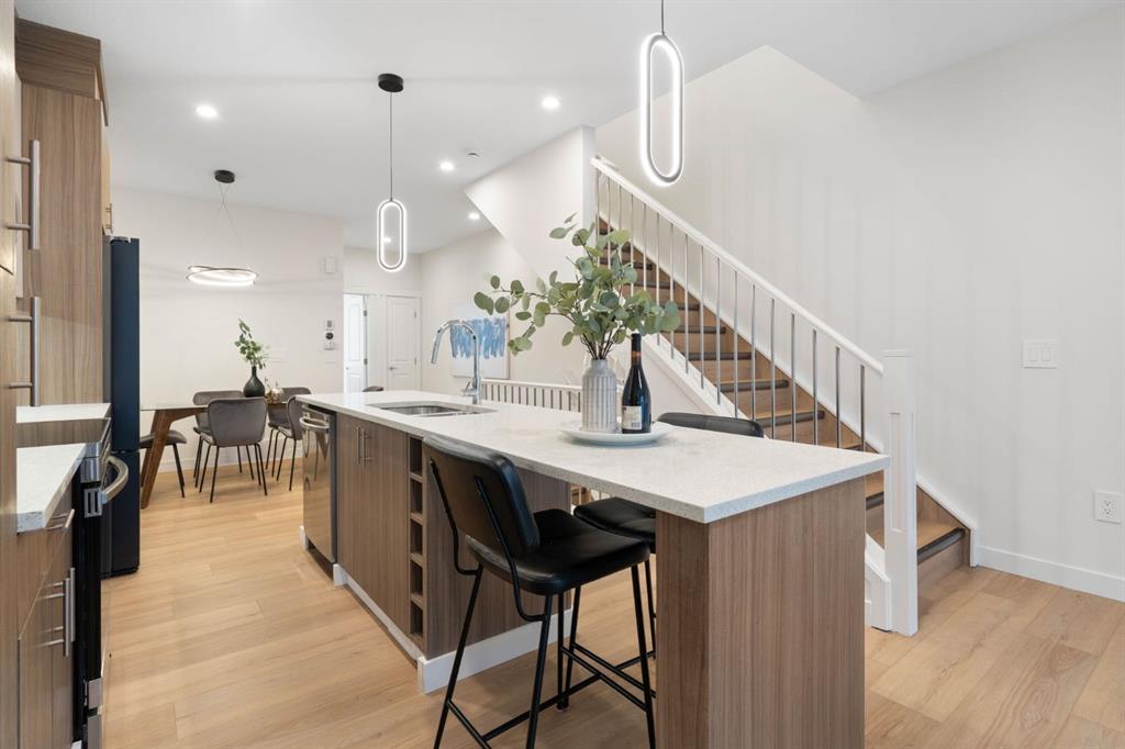Modern finishes shine throughout this stylish home. The open-concept main level features wide-plank flooring, oversized windows that flood the space with natural light, and a stunning kitchen complete with quartz countertops, stainless steel appliances, sleek cabinetry, a spacious island, and contemporary pendant lighting. The dining area flows seamlessly into the bright and inviting living room, creating the perfect setting for both everyday living and effortless entertaining.