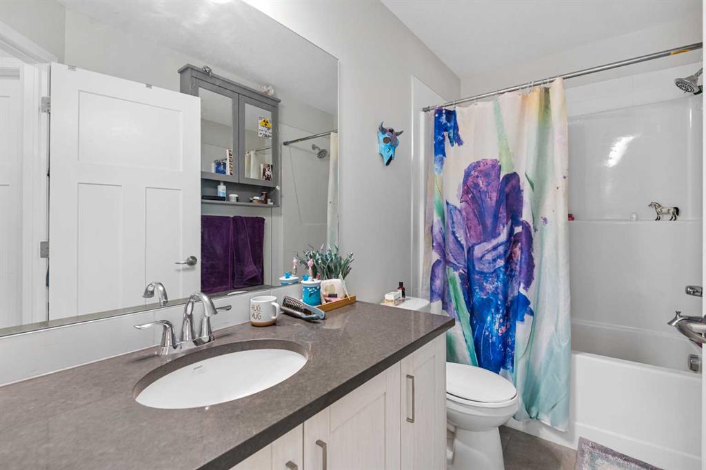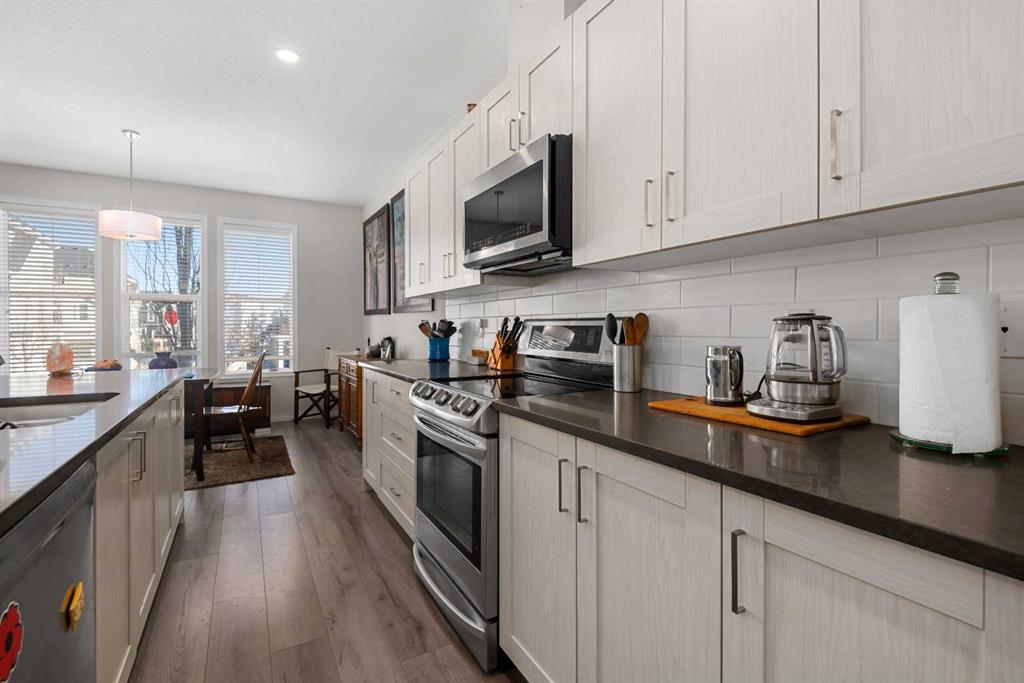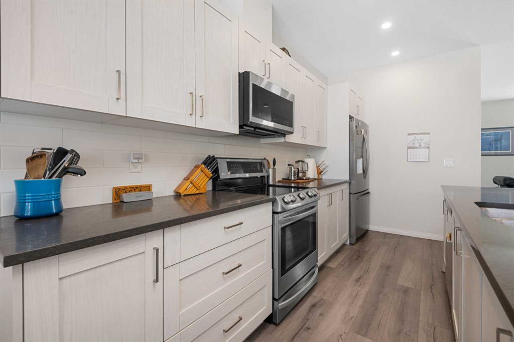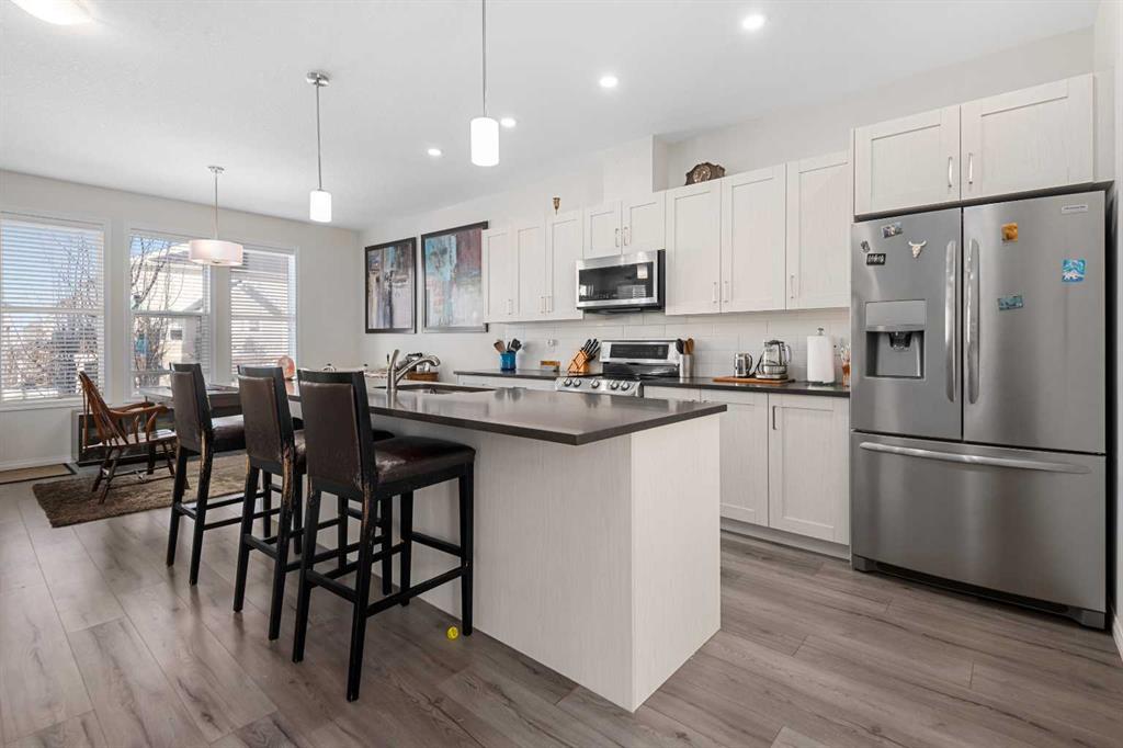 The bright, open-concept main floor is perfectly suited for everyday family living. Relax by the cozy electric fireplace in the great room, or gather in the stylish kitchen featuring quartz countertops, stainless steel appliances, and a central island with seating. The dining area provides plenty of space for family meals and entertaining, while a convenient half bath & main floor laundry completes the level.