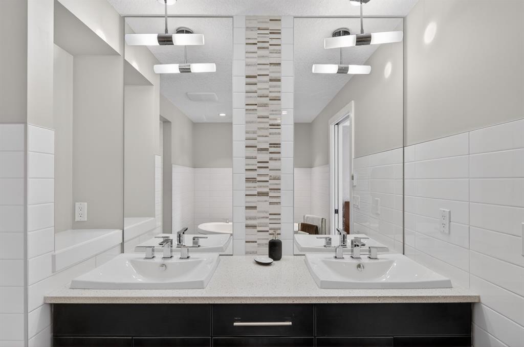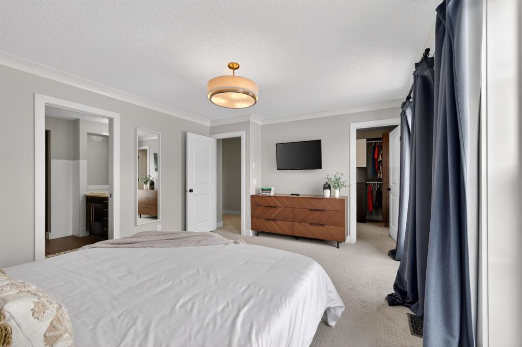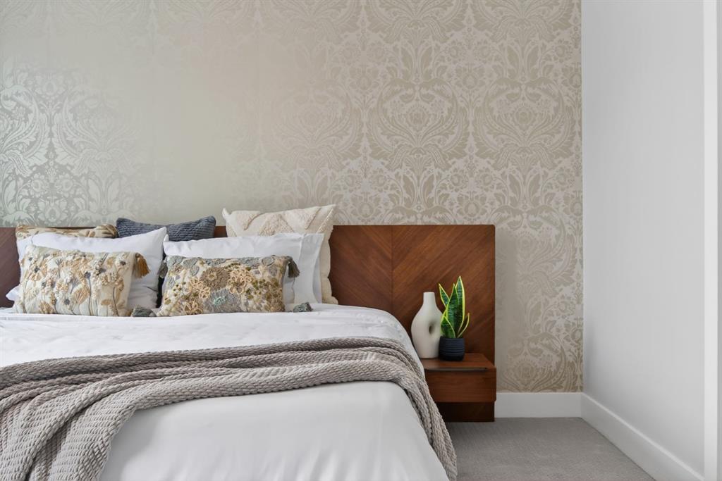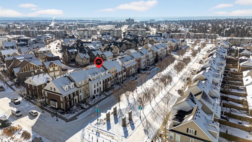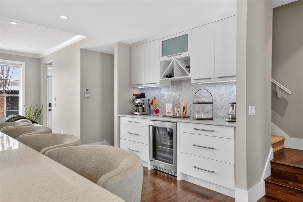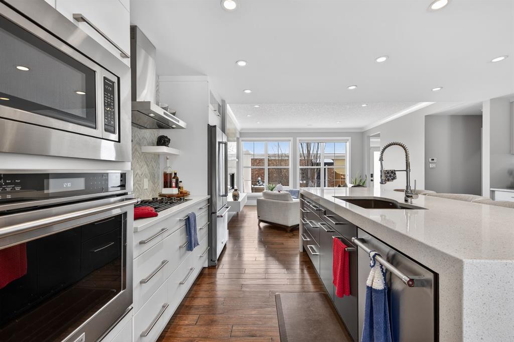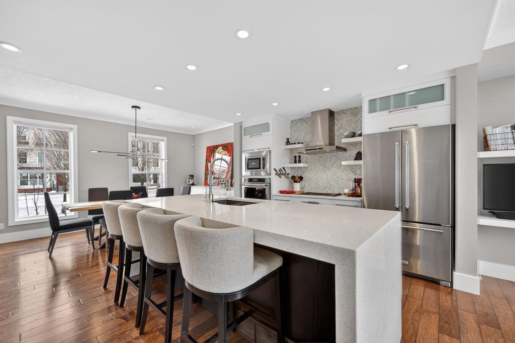 Rare opportunity to own a fully renovated townhouse in the coveted community of Currie Barracks. Flooded with natural light, the main floor showcases hardwood flooring, high ceilings, and a spacious dining area that flows seamlessly into a stunning custom kitchen featuring a quartz waterfall island, built-in stainless steel appliances, buffet with wine fridge, and extensive cabinetry. The oversized living room is anchored by a gas fireplace with a beautiful stone mantle and custom built-ins. Step outside to a thoughtfully designed backyard with a large Kayu hardwood deck and a beautifully landscaped lower garden. The insulated double detached garage is finished with epoxy flooring and custom storage. Upstairs, the primary retreat offers a massive walk-in California Closet and a spa-inspired ensuite with heated floors, soaker tub, separate shower, and dual vanities. A second bedroom with its own ensuite and walk-in closet, plus convenient upper-floor laundry, complete this level. The sprawling third level is ideal as a bedroom, home gym, or recreation room. The thoughtfully designed lower level is designed for entertaining, with a cozy media room, built-in speakers, Murphy bed with shelving, wet bar with wine fridge, and an additional full bathroom. Added highlights include a built-in sound system throughout and air conditioning for year-round comfort. Exceptionally well planned, Currie Barracks offers outstanding schools, scenic walkways, beautiful parks, and a growing collection of restaurants, cafés, and breweries, all just a short 10-minute drive to Downtown Calgary. Perfect for young professionals, this vibrant inner-city community delivers an unbeatable lifestyle.