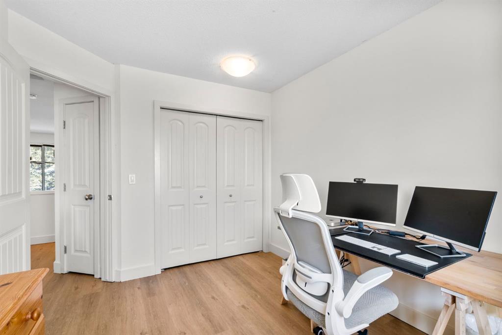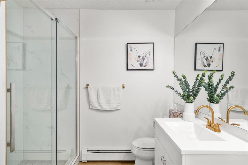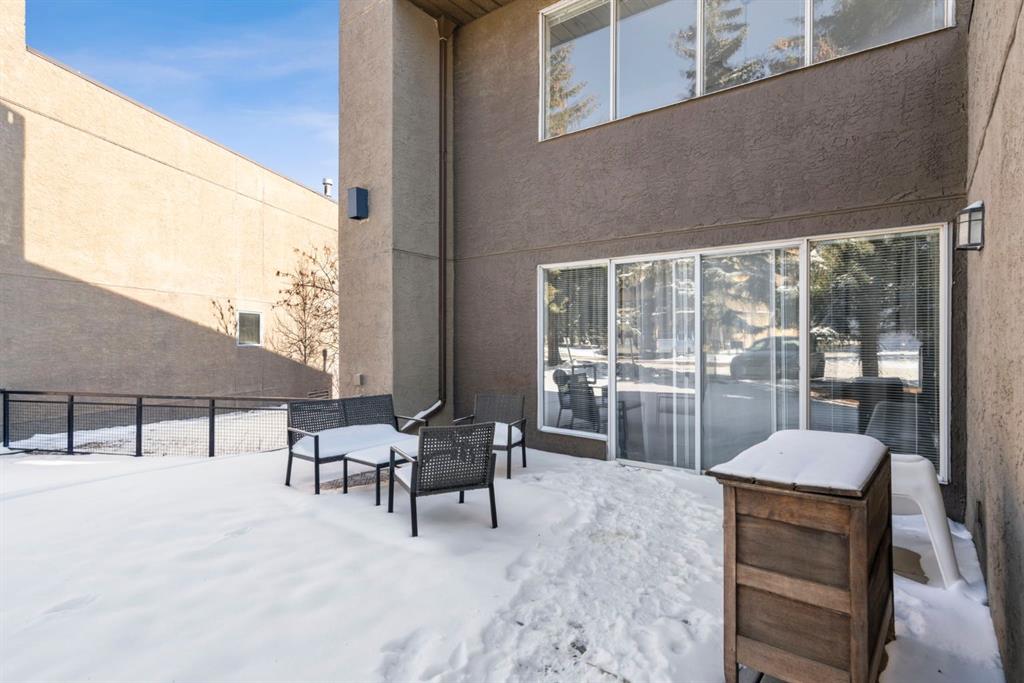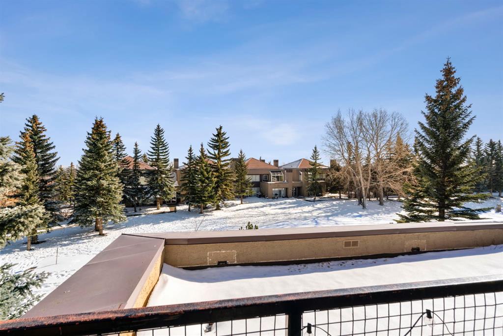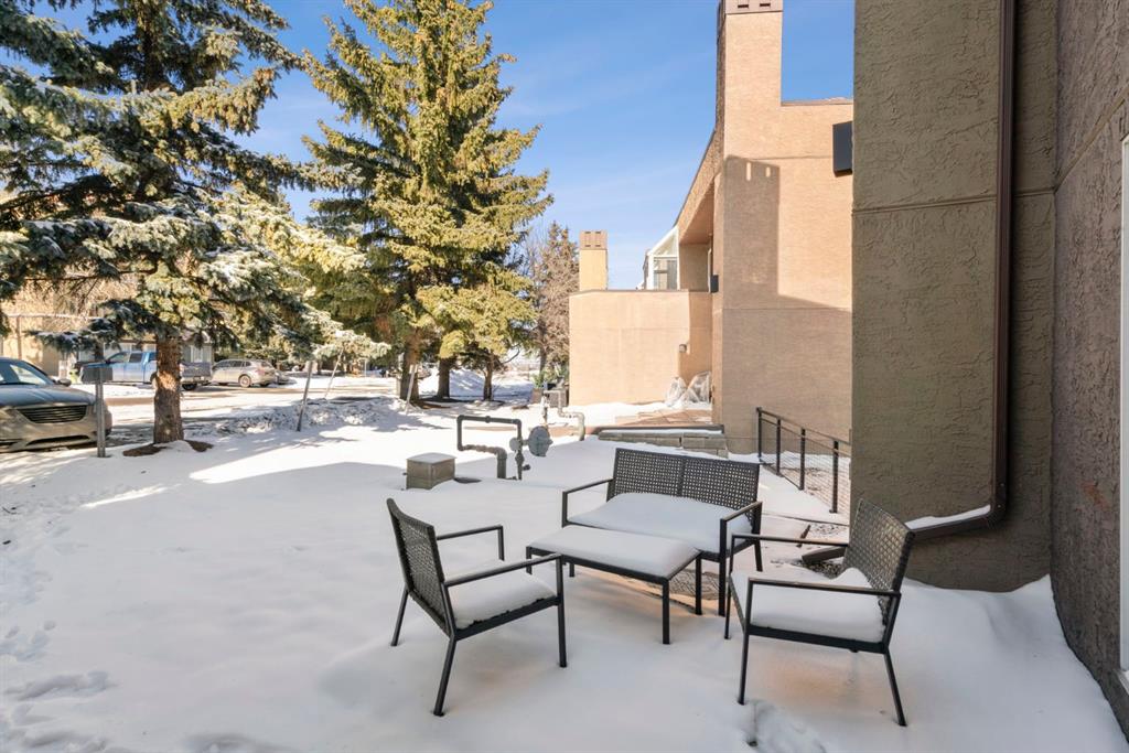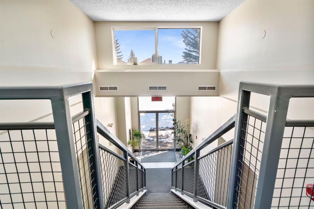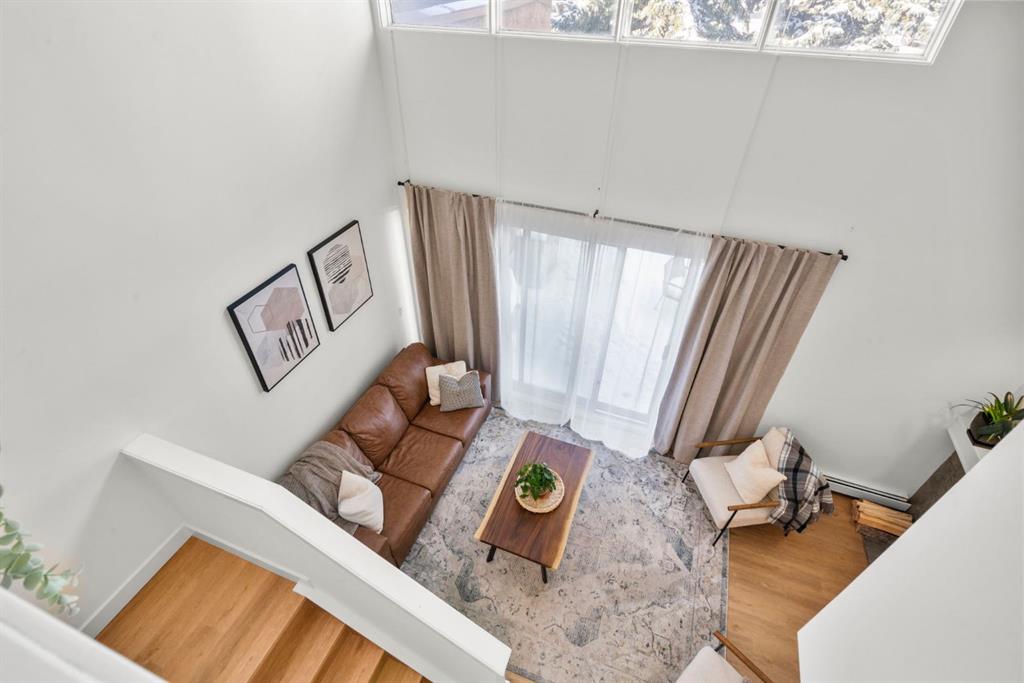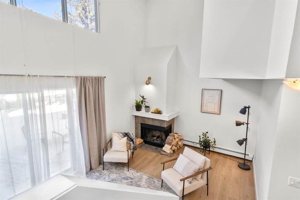 Welcome to this beautifully updated loft-style condo in The News from Broadcast Hill located in Patterson - a mature, desirable west-side neighbourhood known for it’s quiet streets, extensive pathways and convenient access to downtown. Offering over 1,000 sq. ft. of living space, this 2-bedroom, 1.5-bathroom home features a bright and airy layout with soaring high ceilings and large windows that fill the space with natural light. Fresh, modern updates make this unit completely move-in ready: the entire home was professionally painted in 2022, new vinyl flooring was installed throughout in 2022, and the main bathroom was fully renovated in 2023. As you step inside, you’ll find a convenient powder room and in-suite laundry, with the kitchen down the hallway on the right. Bright and inviting, it features granite countertops with plenty of counter space and cabinets, a newer Bosch dishwasher, a window over the sink, a pantry and a peninsula with seating — great for casual dining. The adjacent dining area opens onto a spacious east-facing patio surrounded by mature trees with downtown views, offering beautiful morning sunlight and a peaceful outdoor setting for coffee or meals. The living room with high ceilings is open and airy, centered around a cozy wood-burning fireplace and offering access to a second, west-facing patio. Upstairs, you’ll find two well-sized bedrooms, a linen closet, and the beautifully renovated 5-piece bathroom complete with double vanity, an oversized walk-in shower, and added built-in storage shelving. This unit also includes underground parking and a separate storage locker for extra convenience. Pets are welcome with board approval. Residents enjoy exceptional amenities including an indoor pool, hot tub, fitness centre, racquet courts, party room, visitor parking, and scenic walking paths throughout the complex. Condo fees include all utilities except electricity, adding excellent value. Short commute to downtown, shopping, transit, parks, and schools — and only a short drive to WinSport - this home offers an ideal balance of comfort, updates, and location in one of Calgary’s most desirable, tree-lined communities. Book your private showing today!